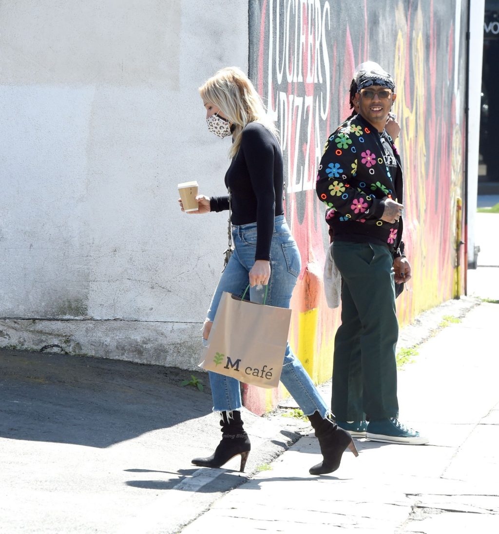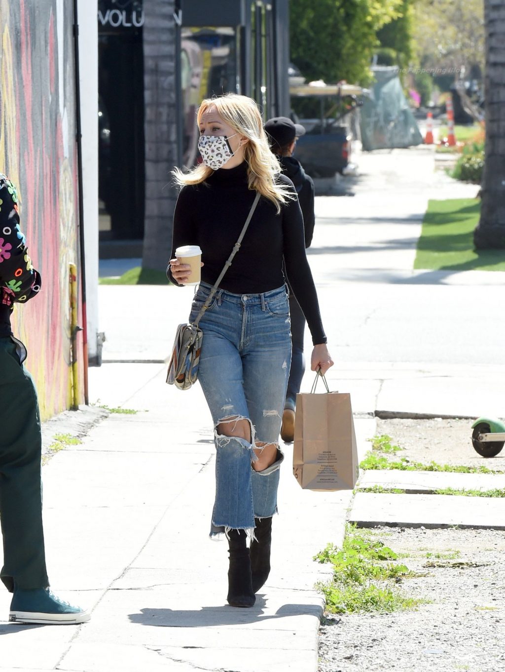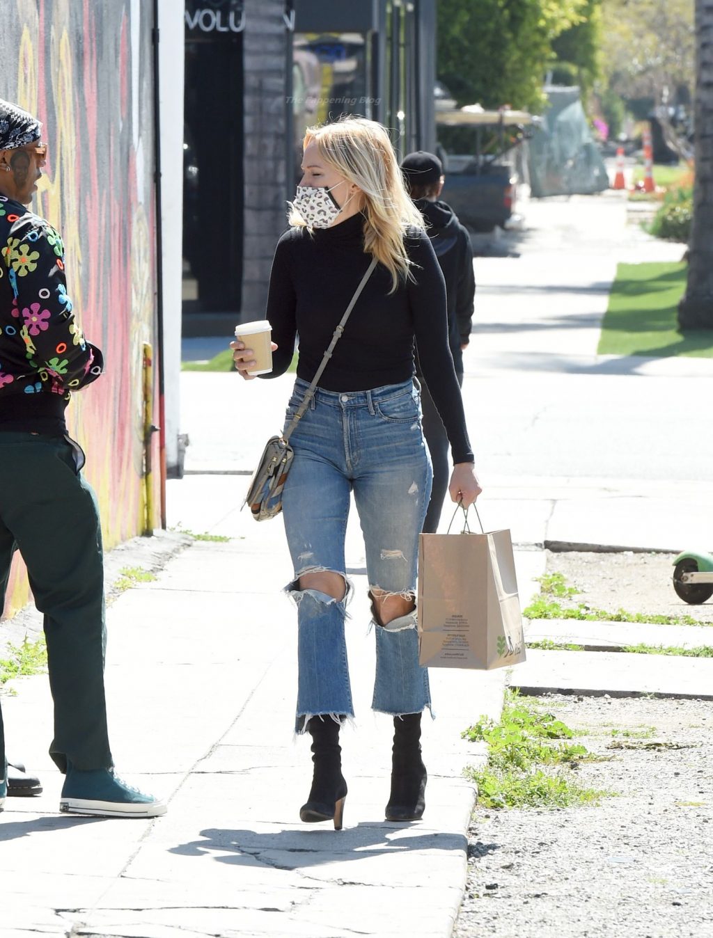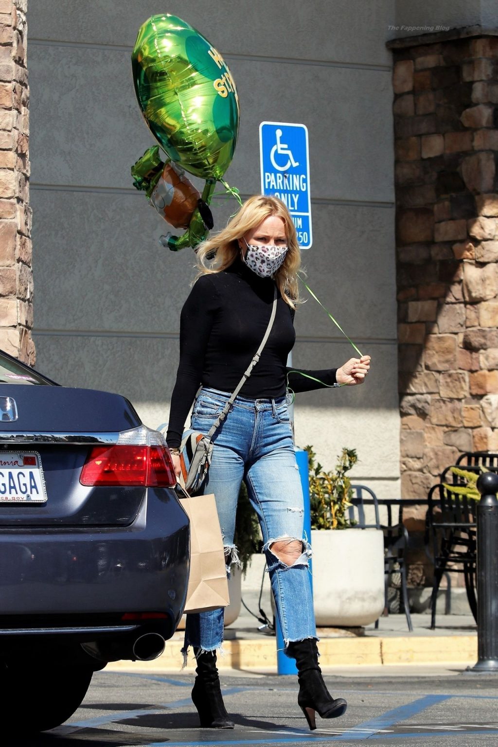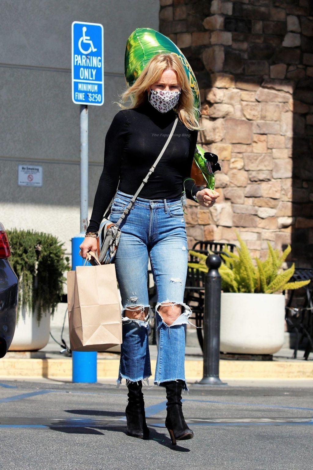 Malin Akerman esce da un mercato di Los Angeles con grandi palloncini verdi in celebrazione della Festa di San Patrizio, 17/03/2021.