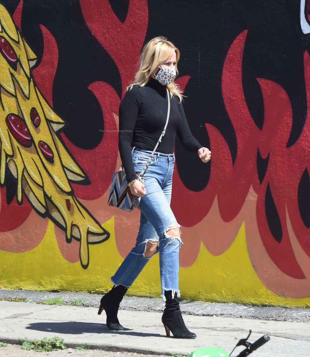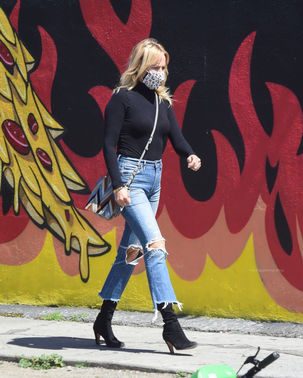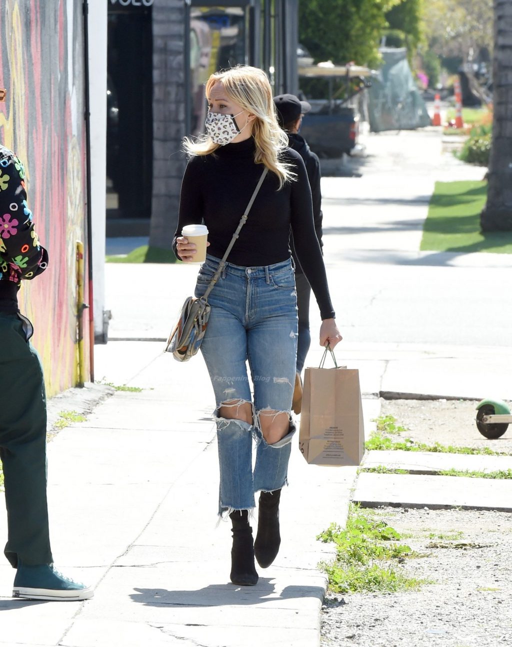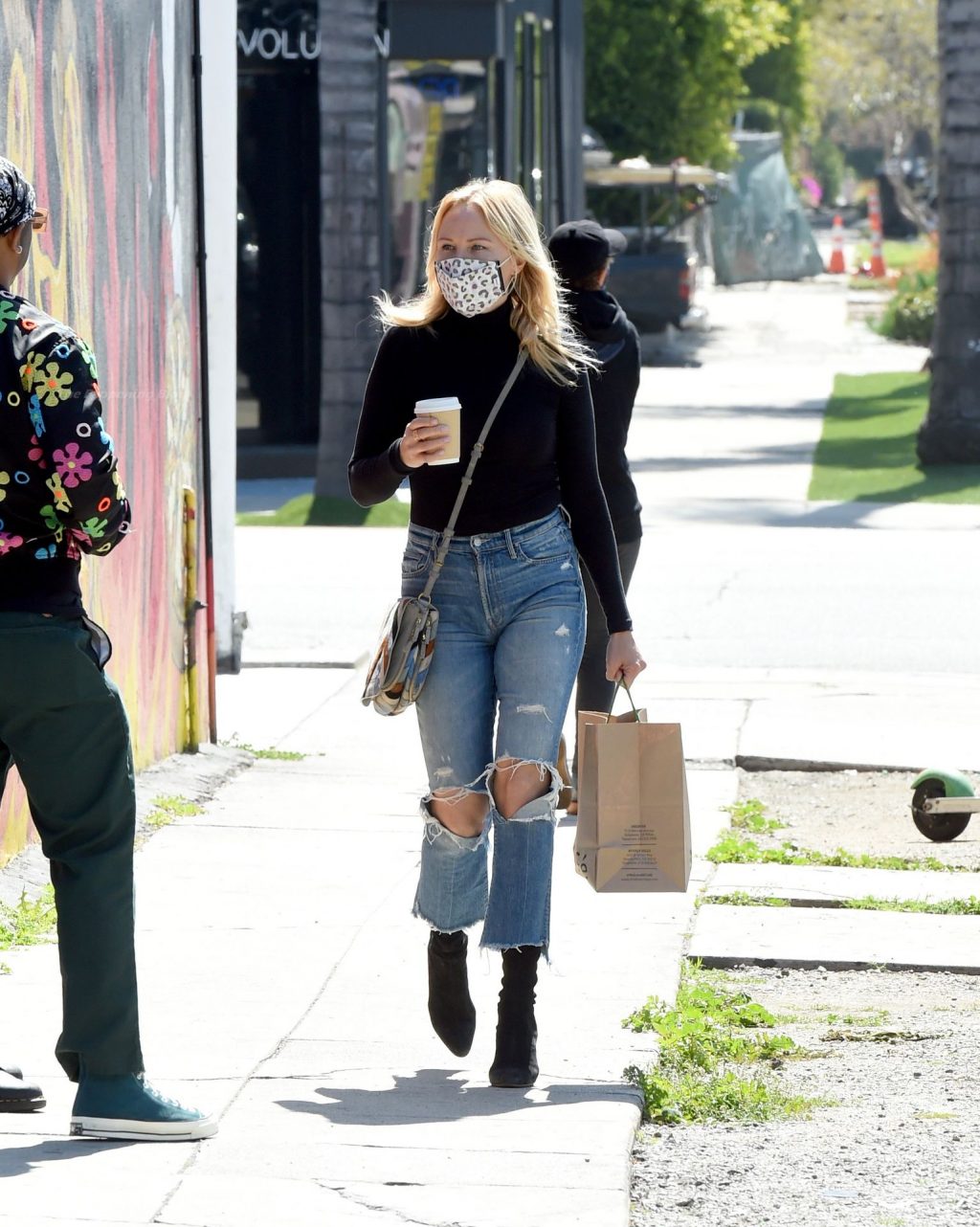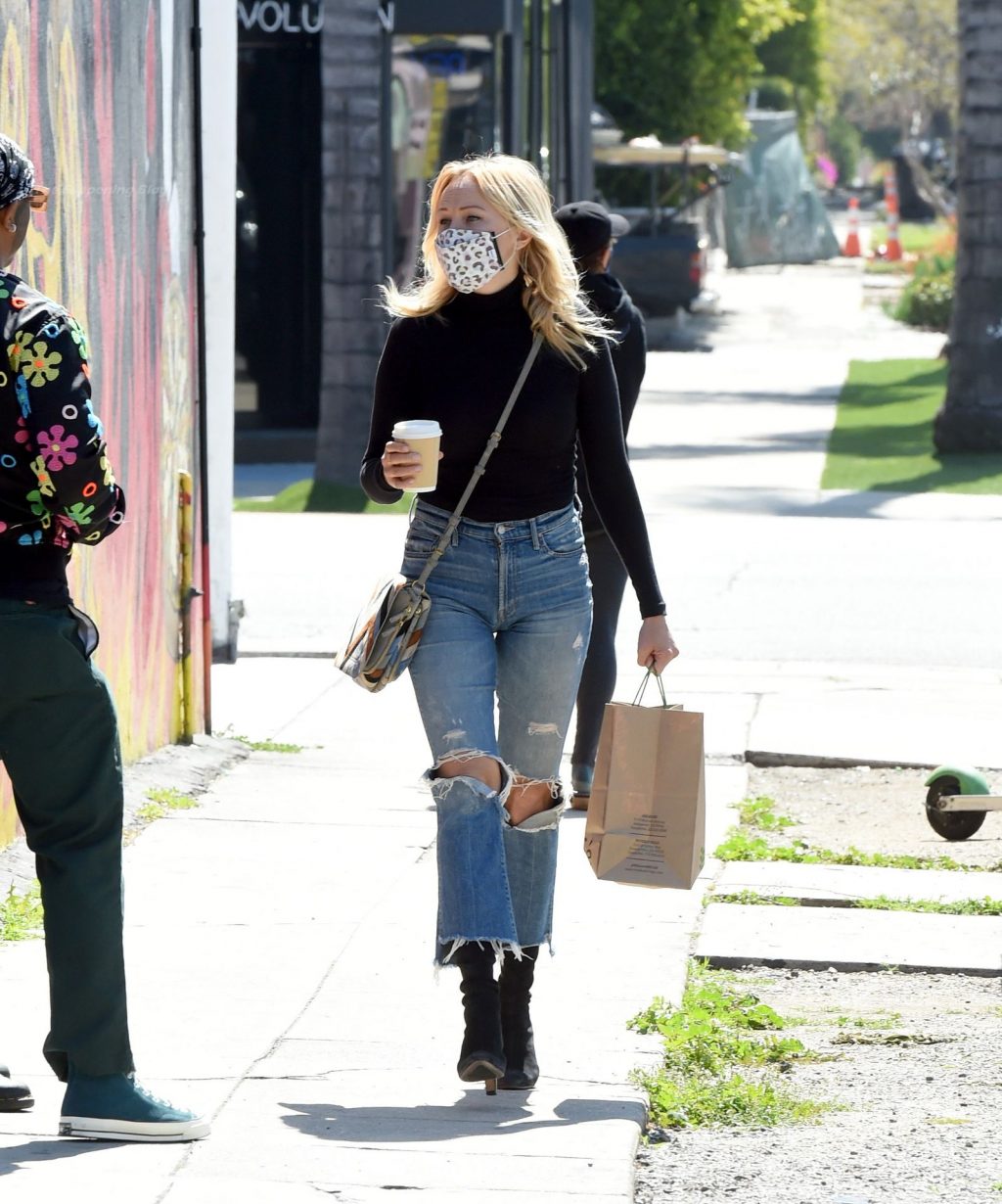 L’attrice di 42 anni indossa jeans blu strappati, stivali neri e una maglia nera a maniche lunghe.