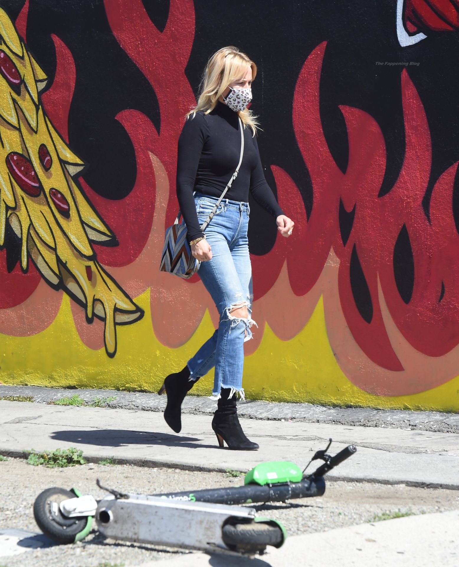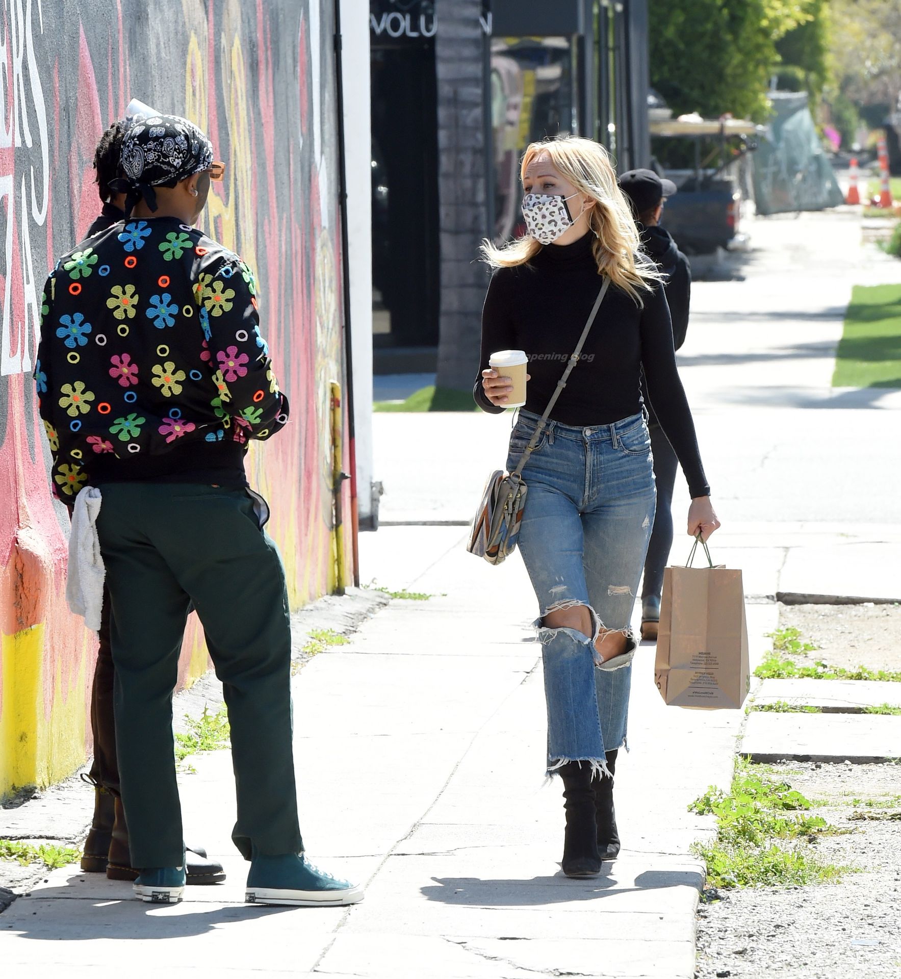 L’attrice di 42 anni indossa jeans blu strappati, stivali neri e una maglia nera a maniche lunghe.