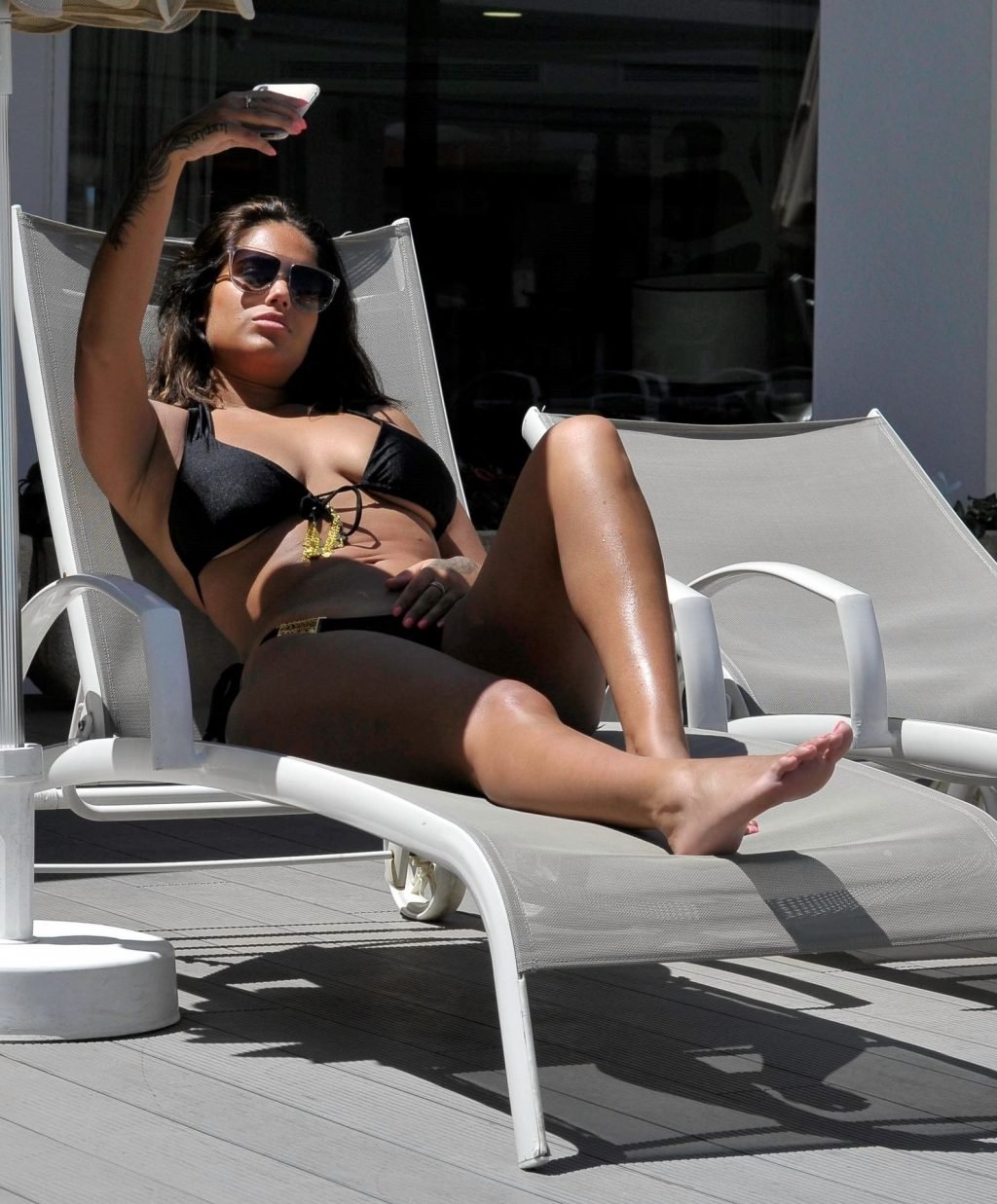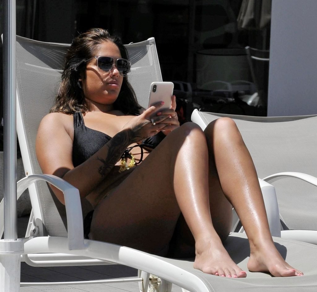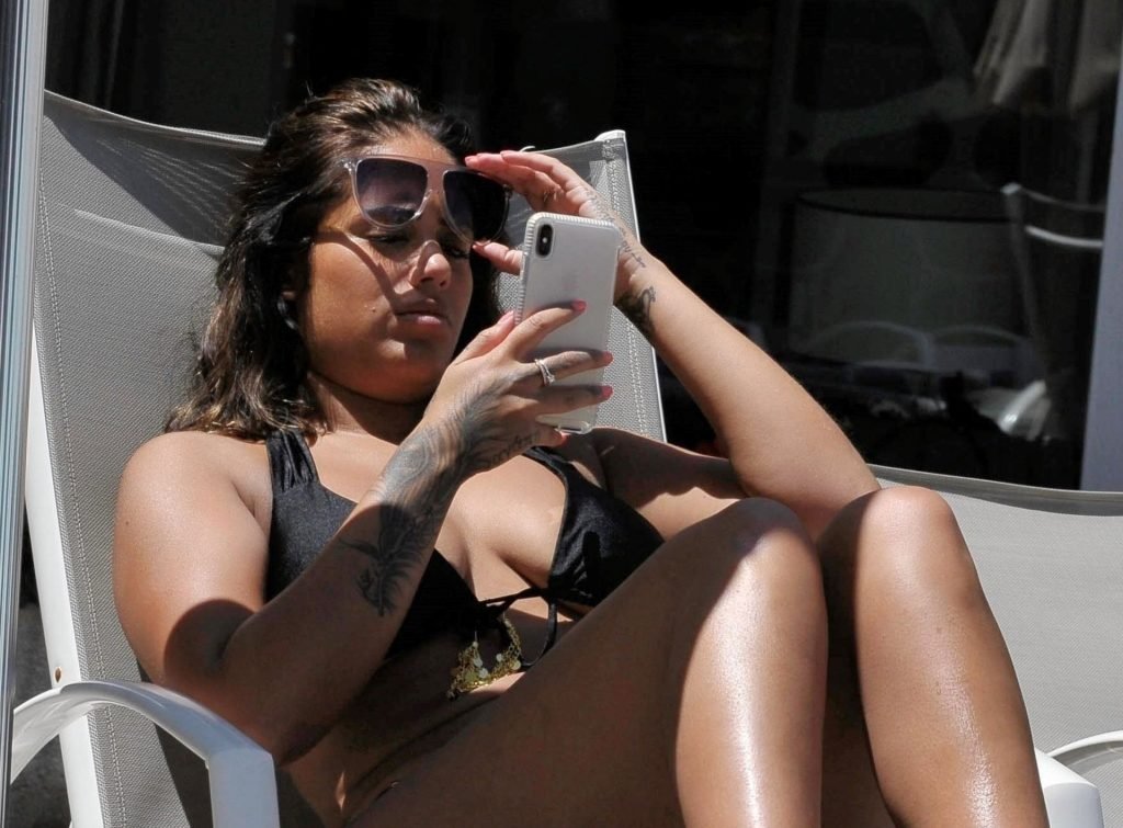 Malin Andersson di Love Island è stata fotografata in bikini nero mentre si scattava selfie a bordo piscina prima di fare shopping a Ibiza, 27/05/2019.