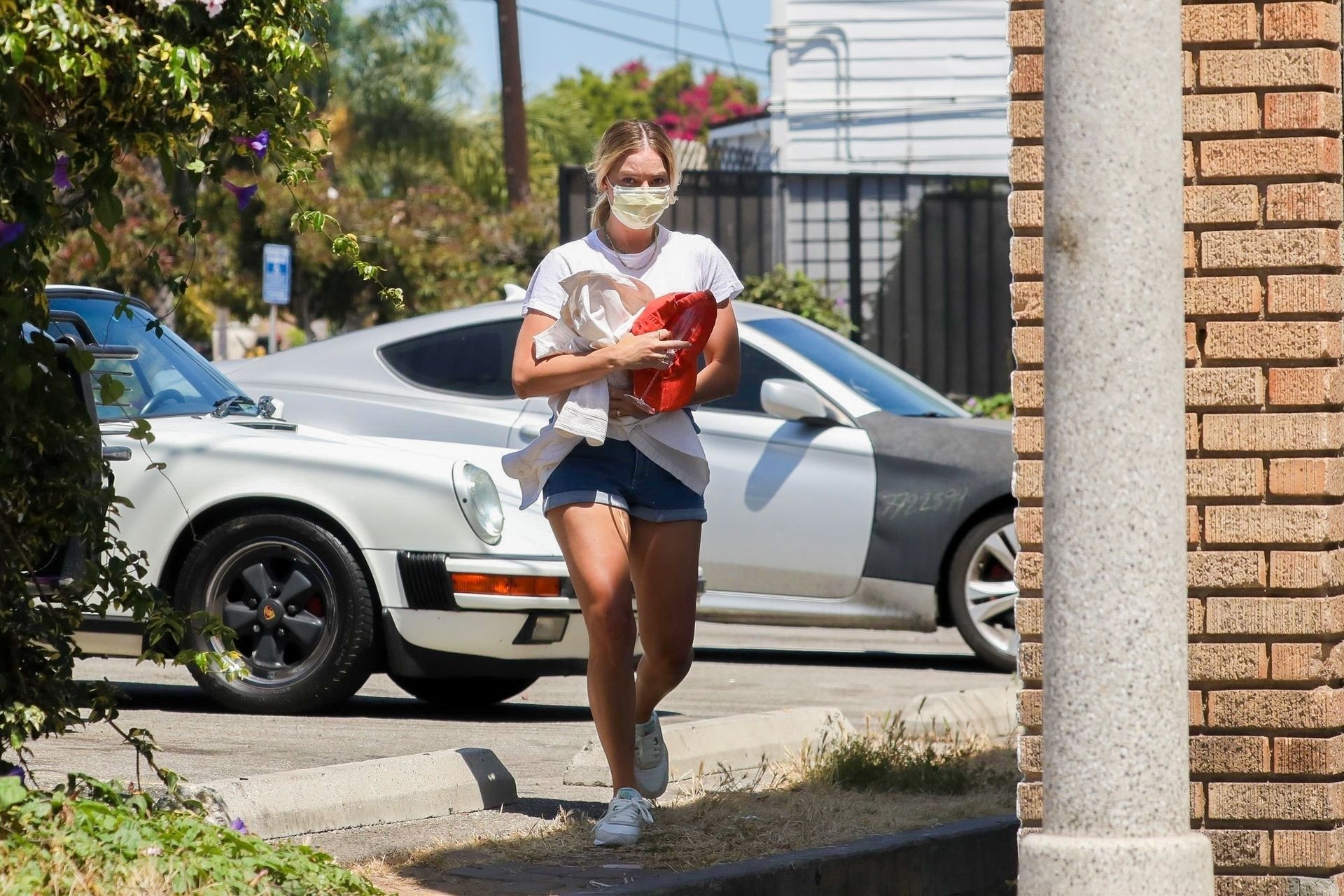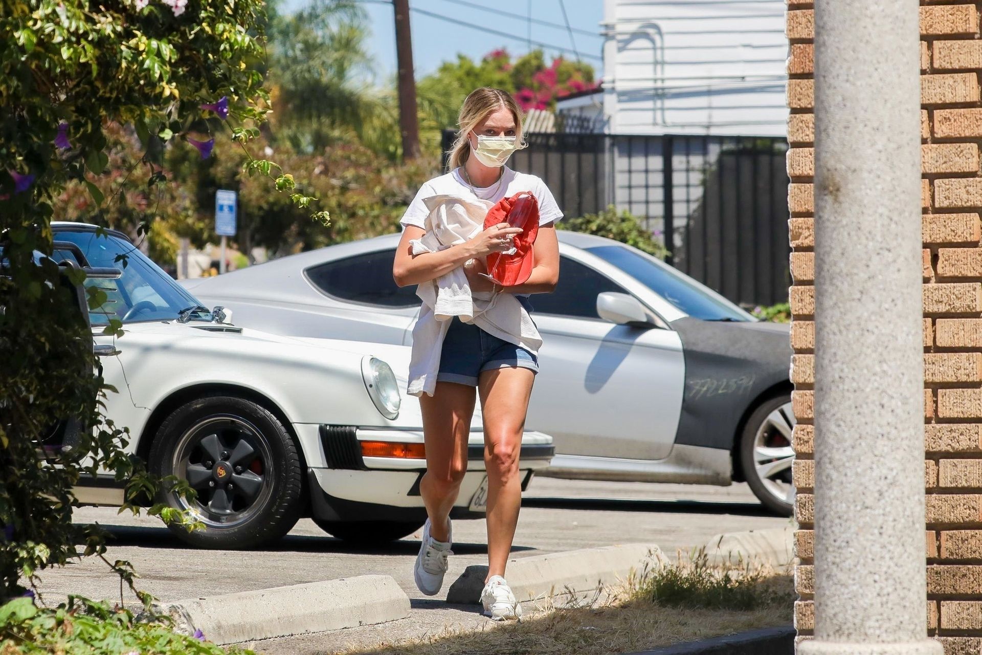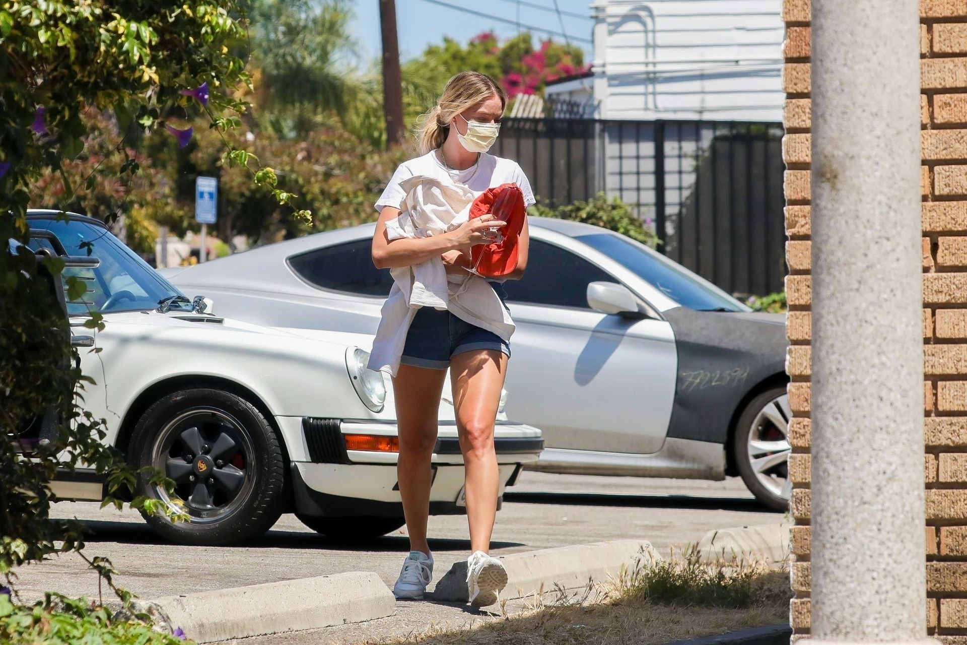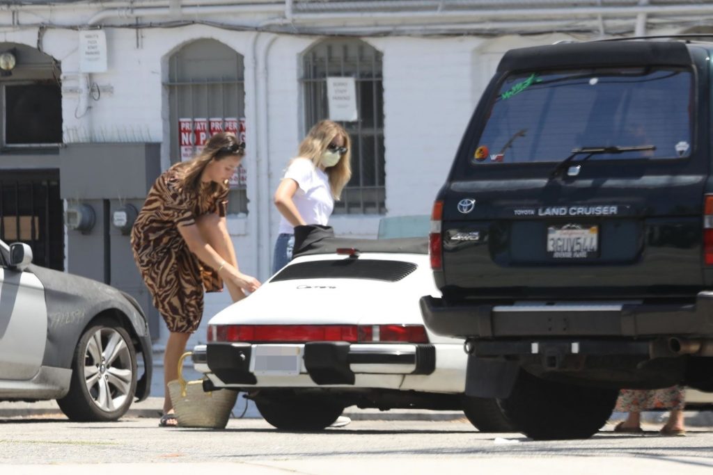 L’attrice Margot Robbie esce dal sedile posteriore della Porsche d’epoca del suo amico indossando una maschera e pantaloncini di jeans, mentre si dirigono verso un ufficio a Santa Monica nel pomeriggio di domenica (luglio 2020).
