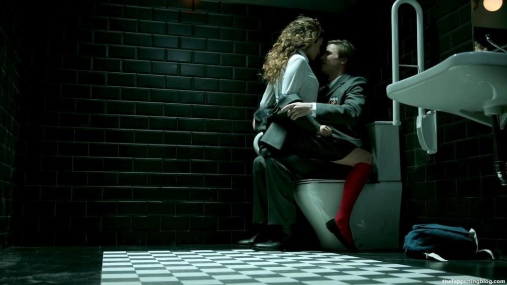 In the first one, we can see María Pedraza kissing with a guy in a restroom, sitting in his lap, while he’s taking her skirt up and unbuttons her shirt. Then the guy takes out a phone for a selfie, moving her bra open to expose her nude boob, and snaps a picture before she quickly covers it up and gets angry.