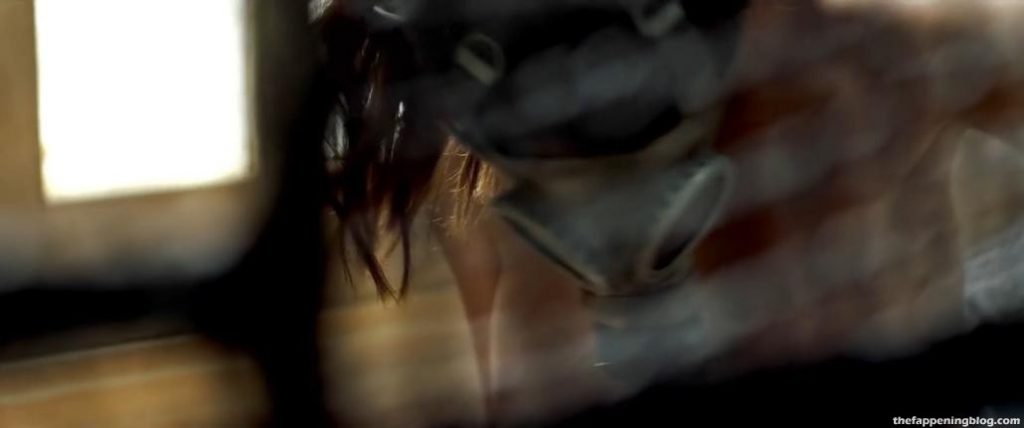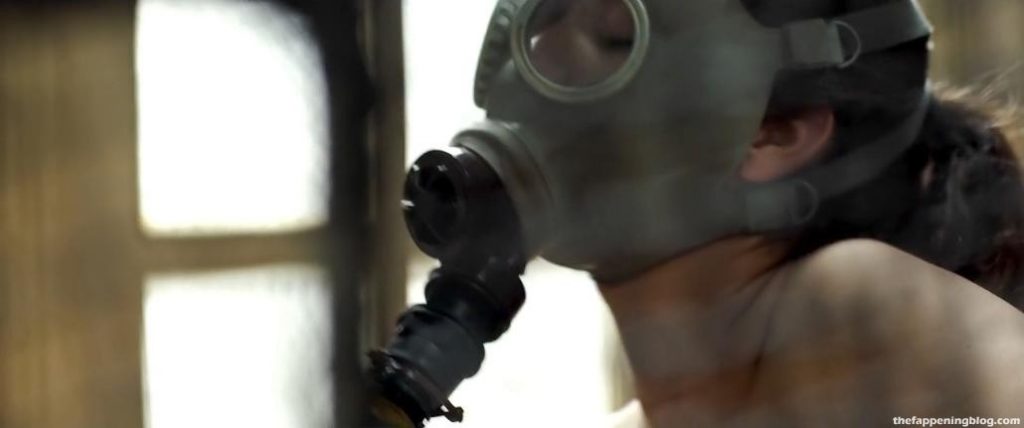María Pedraza and a guy both are wearing gas masks that are attached together with a hose as they have sex in an abandoned building with her riding him while breathing each other’s air back and forth through the masks all while giving us glimpses of her breasts until they notice the elevator start descending causing the guy to worry they might get caught.