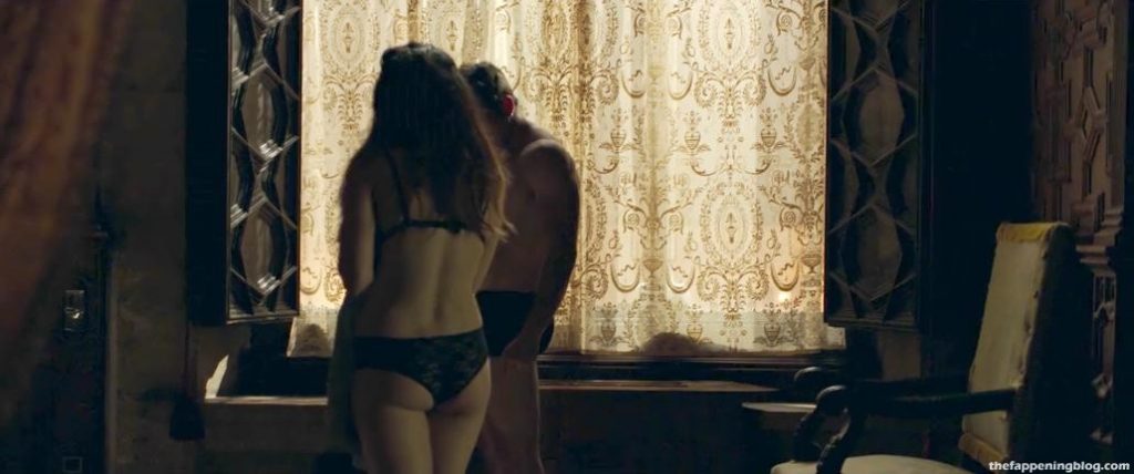 María Pedraza is making out with a guy on a bed until they get interrupted and then sitting up in a see-through black bra that shows a bit of her nipples underneath before she stands up in skimpy black panties and gives us a look at her ass as she walks across the room over to the guy.