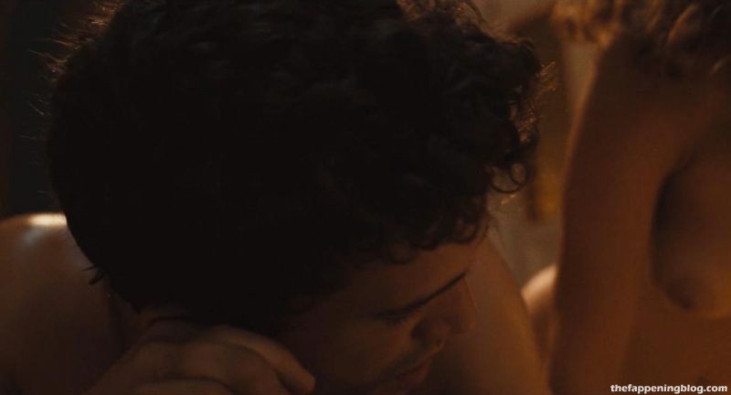 María Pedraza is wearing a beige bra as she climbs into a guy’s lap and starts having sex while riding him sitting up and then seen without the bra showing a bit of the side of her breast until finally they fall back with him on top of her giving us a quick glimpse of her left nipple.