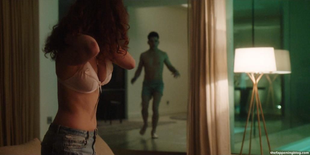 María Pedraza is making out with a guy on a bed until they get interrupted and then sitting up in a see-through black bra that shows a bit of her nipples underneath before she stands up in skimpy black panties and gives us a look at her ass as she walks across the room over to the guy.