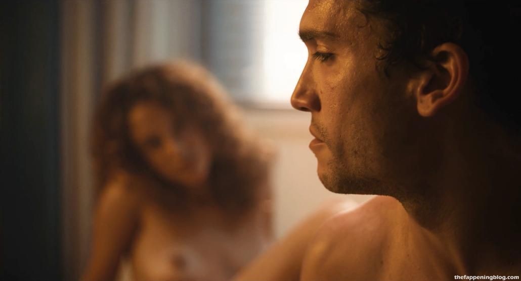María Pedraza nude is lying on her side in bed. She is showing a side boob as the guy strokes her back to wake her up. She then talks to the guy and rolls over to face him, revealing her breasts in the process.