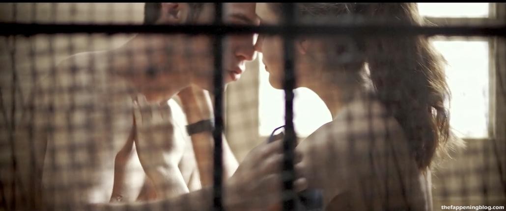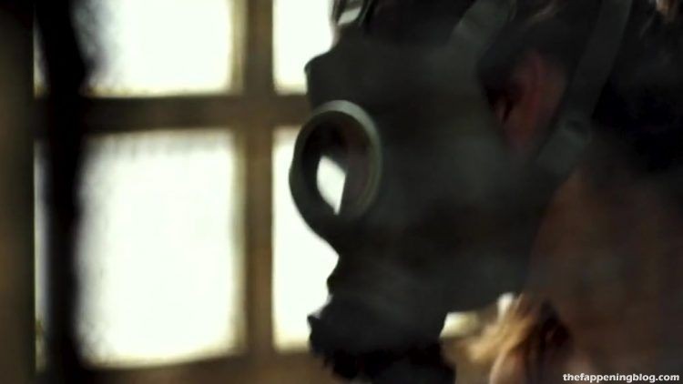 María Pedraza and a guy both are wearing gas masks that are attached together with a hose as they have sex in an abandoned building with her riding him while breathing each other’s air back and forth through the masks all while giving us glimpses of her breasts until they notice the elevator start descending causing the guy to worry they might get caught.