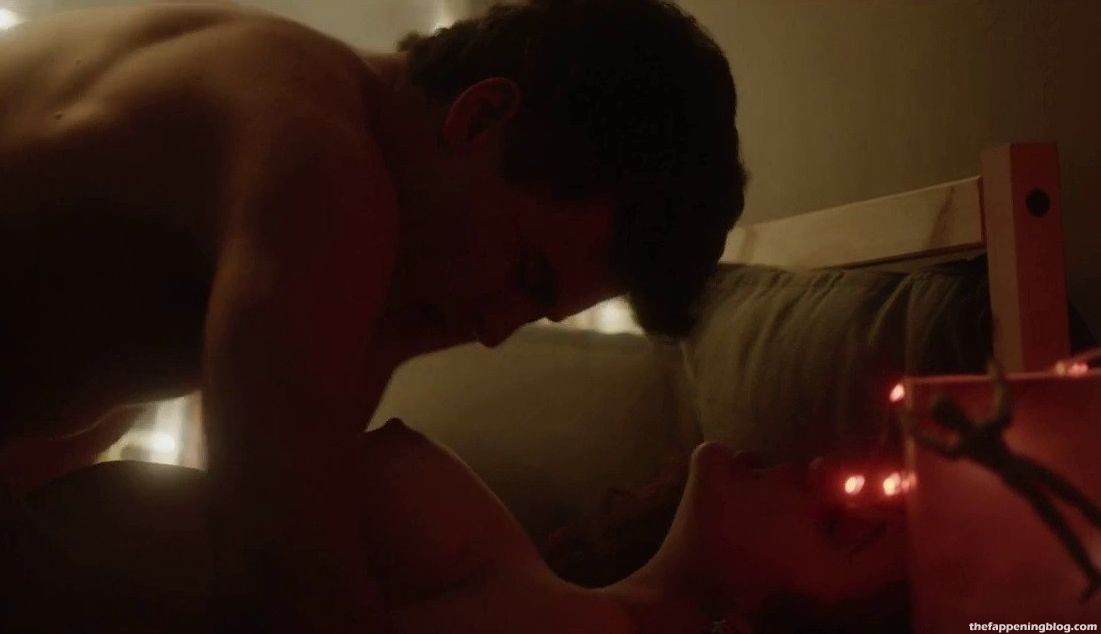 María Pedraza is wearing a beige bra as she climbs into a guy’s lap and starts having sex while riding him sitting up and then seen without the bra showing a bit of the side of her breast until finally they fall back with him on top of her giving us a quick glimpse of her left nipple.