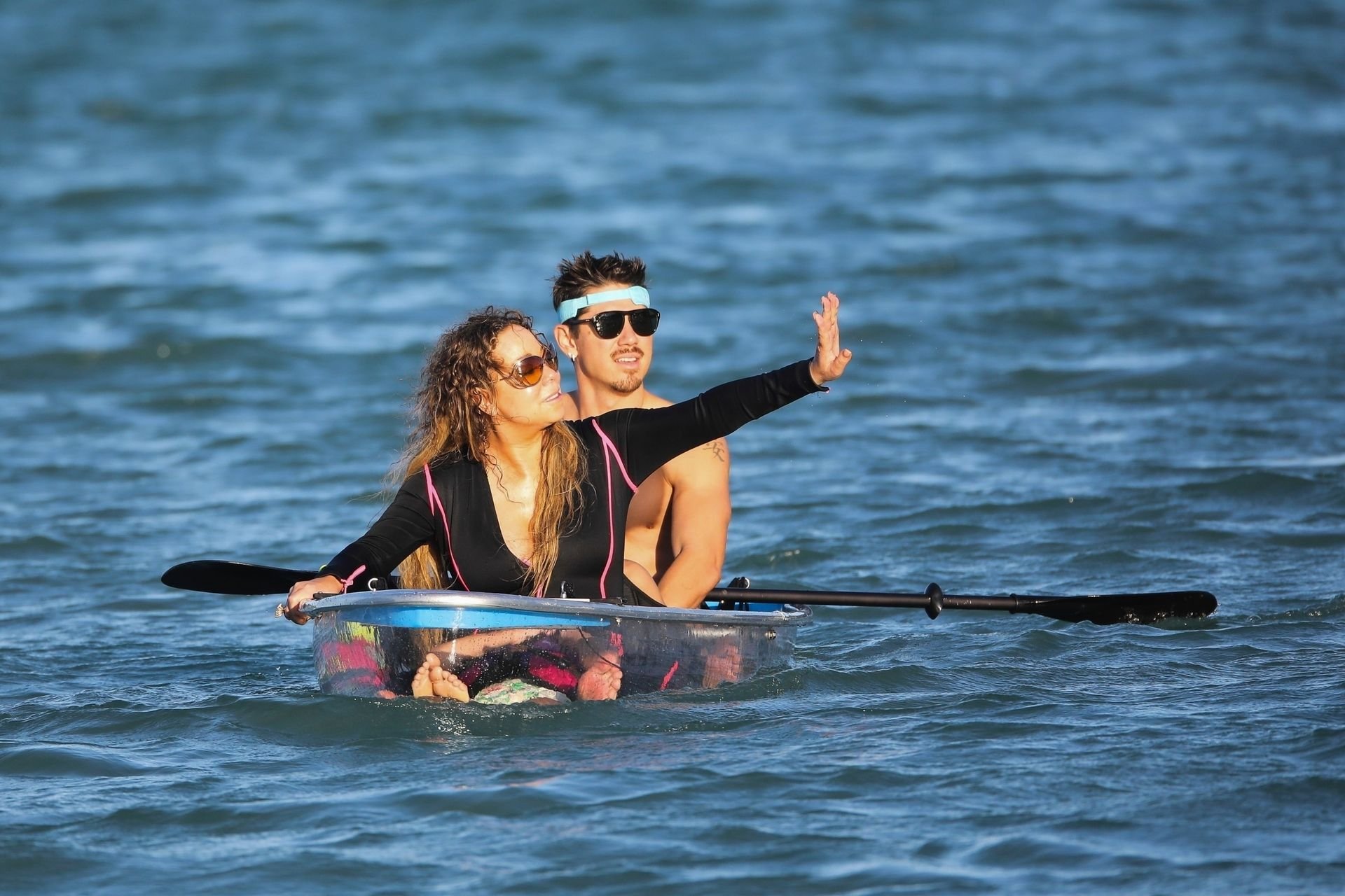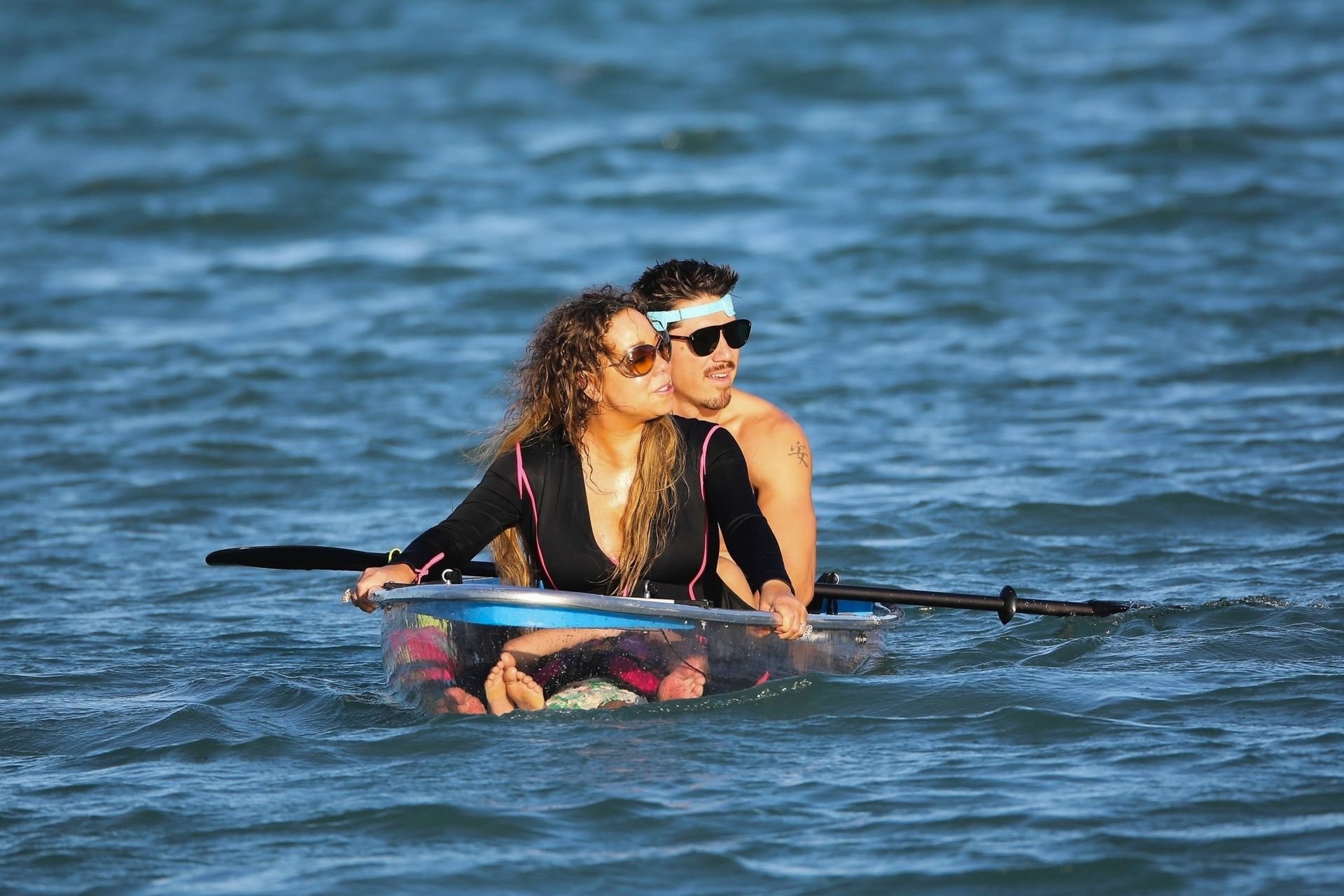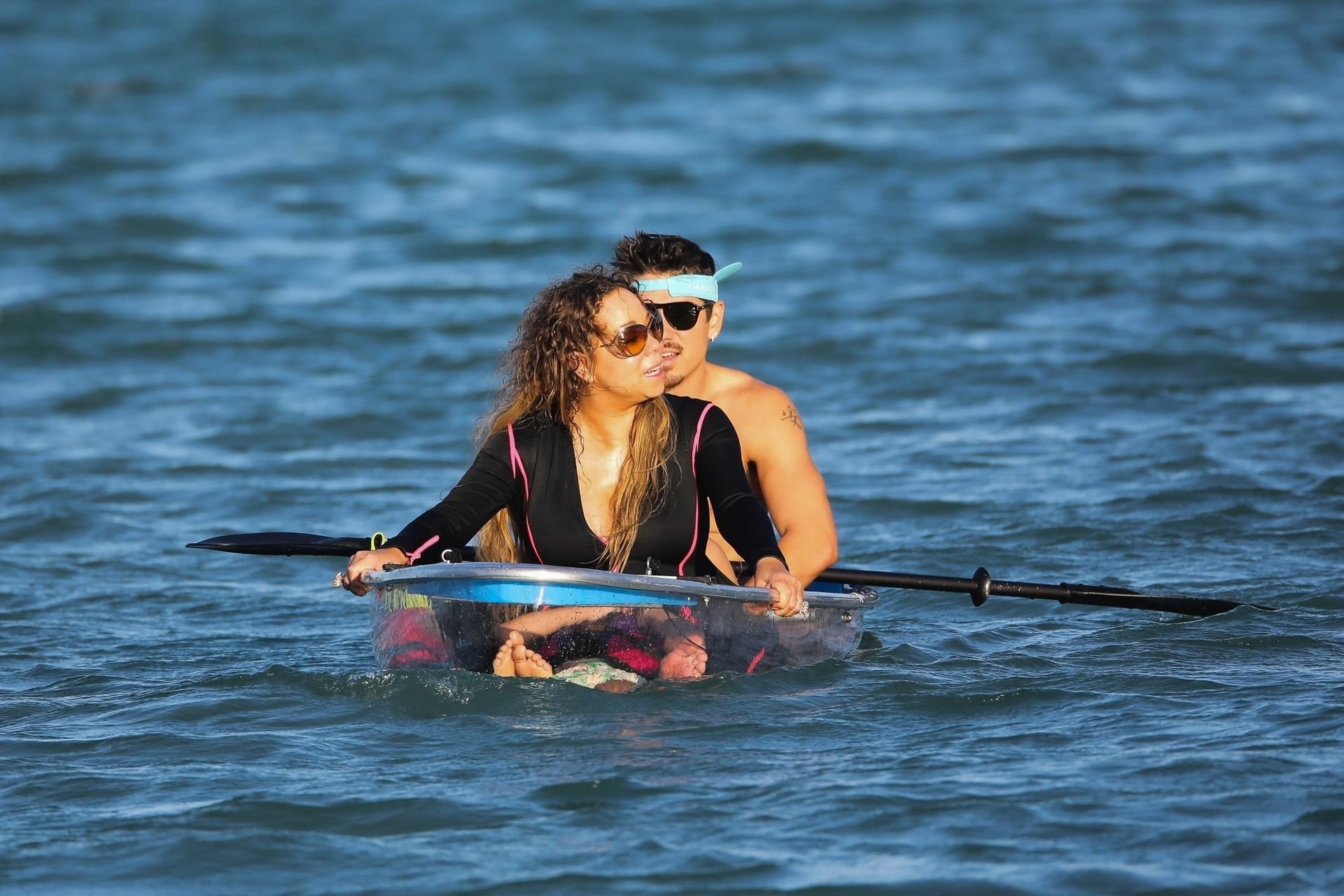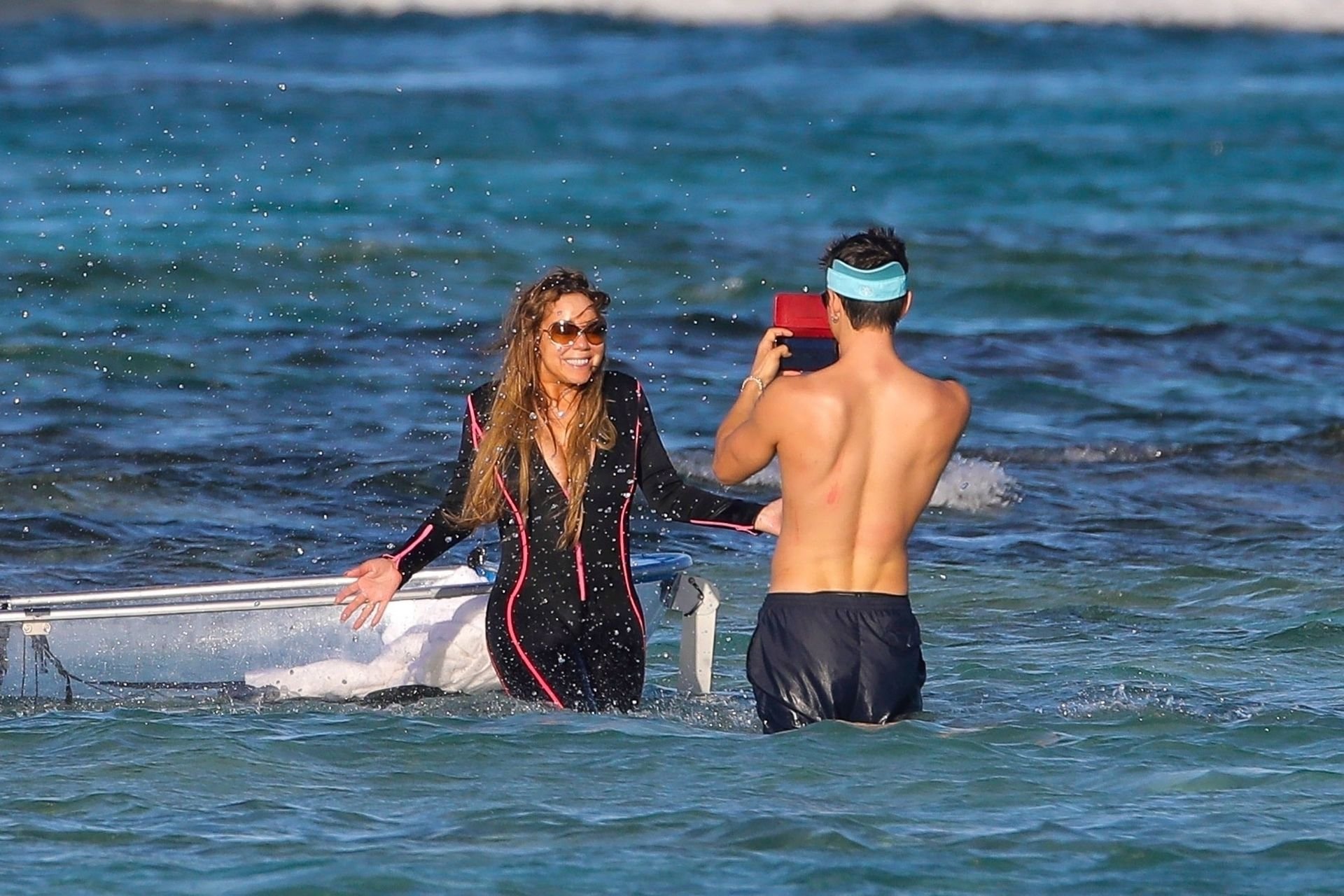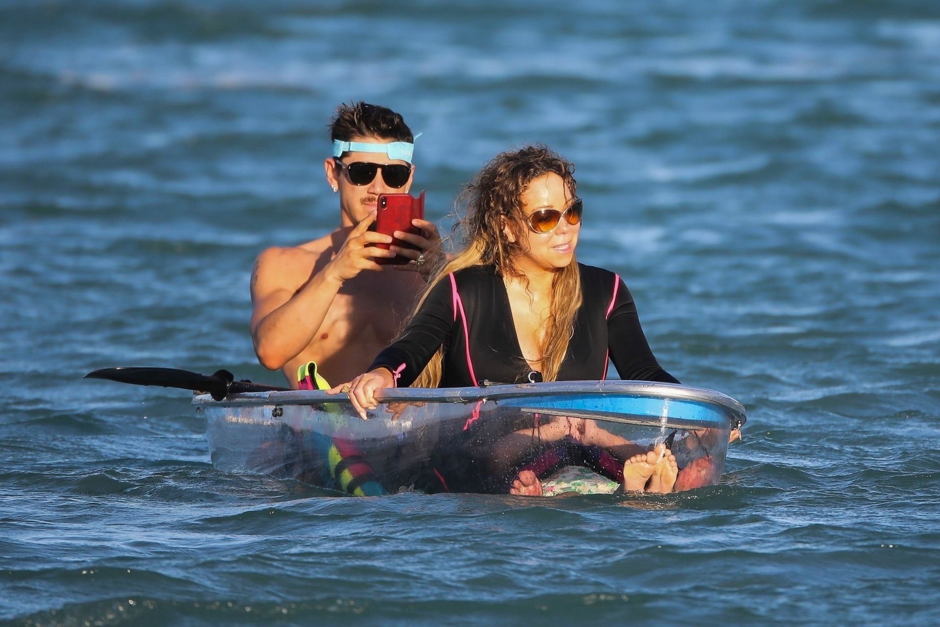 Mariah Carey (48) e Bryan Tanaka (35) si scattano qualche selfie mentre si godono il caldo sole in famiglia alla Grand Cul de Sac Lagoon a St. Barth, con i due figli di Mariah, Moroccan e Monroe, 01/03/2019. Mariah è senza trucco in una muta nera mentre si rilassa in una barca con fondo trasparente.