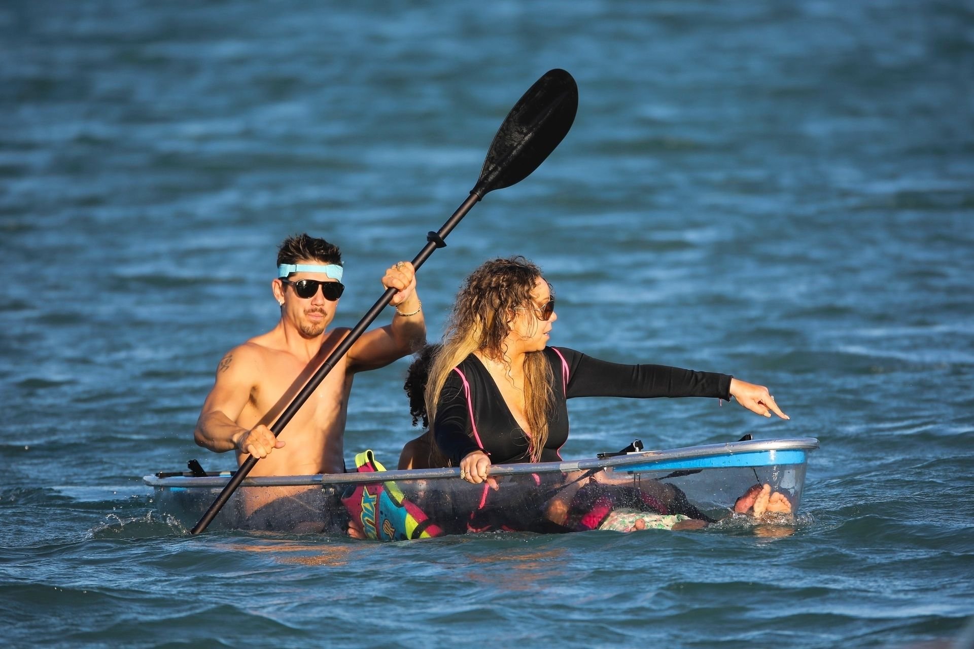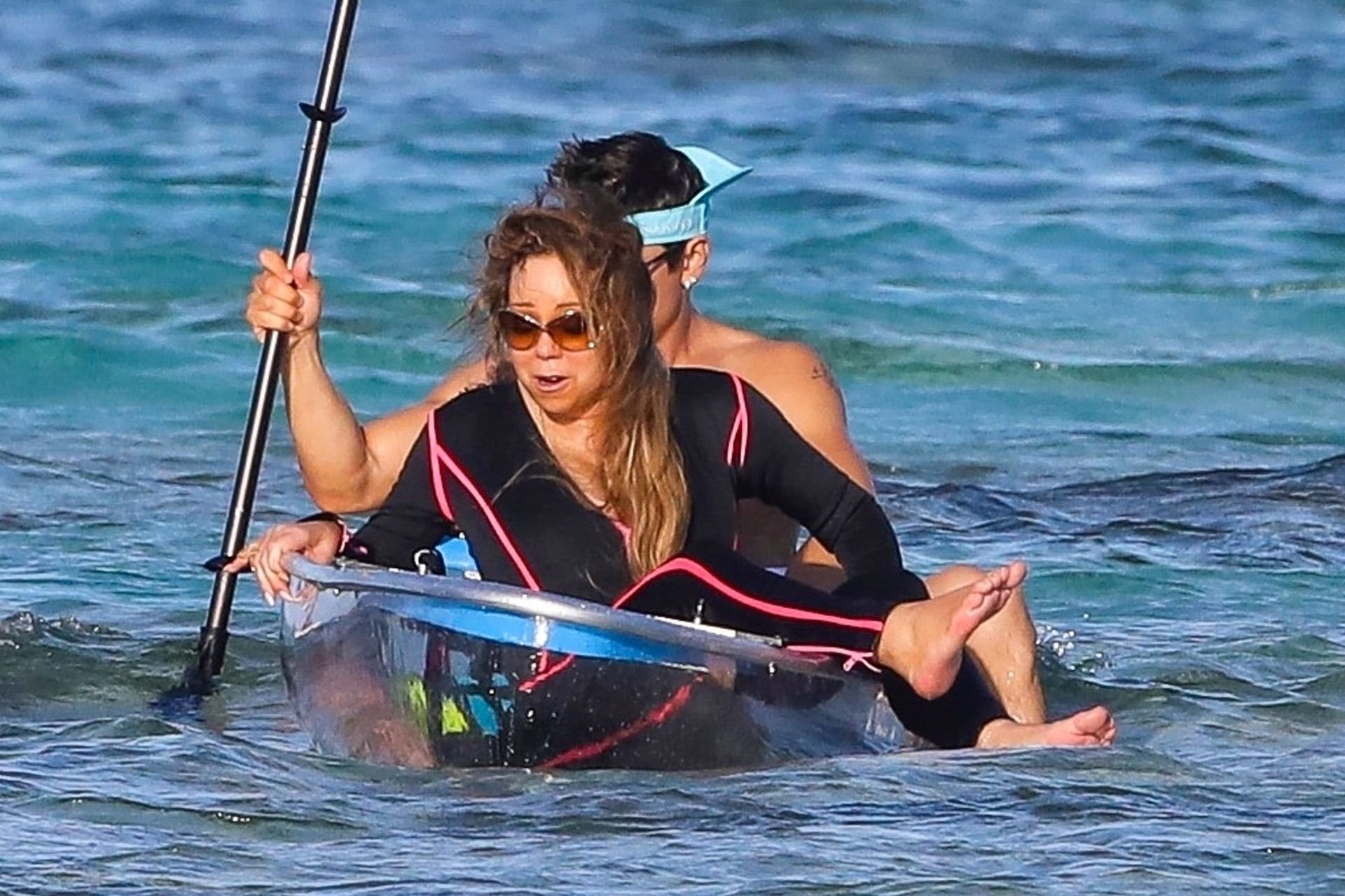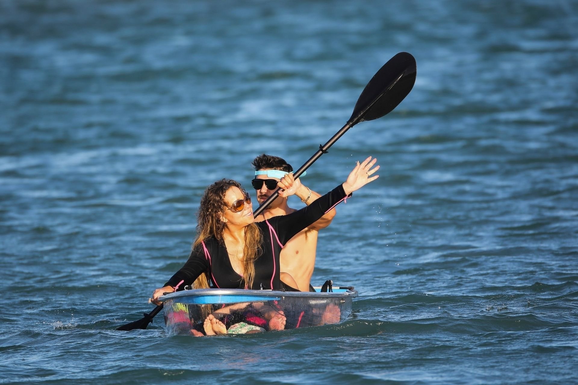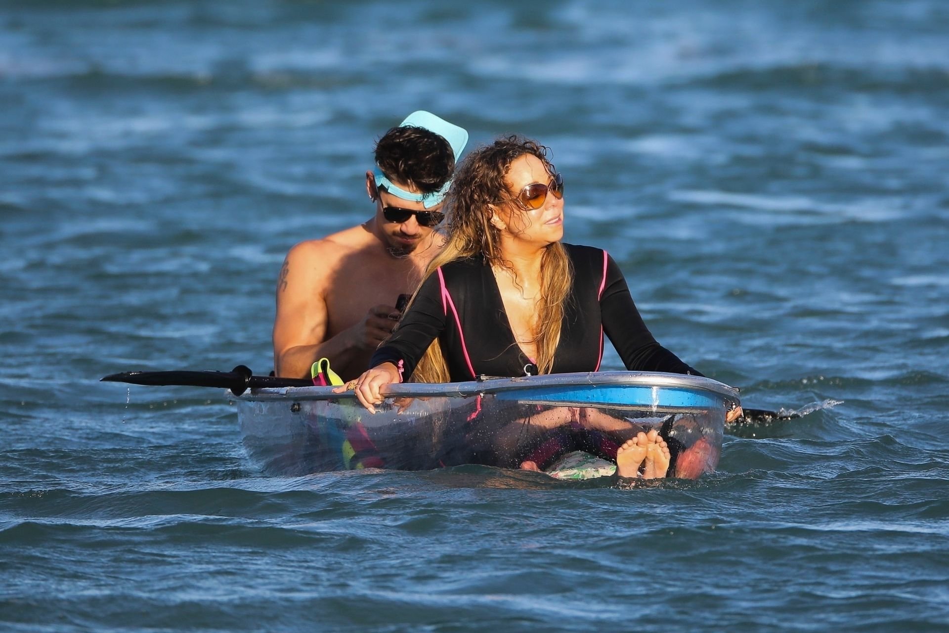 Mariah Carey (48) e Bryan Tanaka (35) si scattano qualche selfie mentre si godono il caldo sole in famiglia alla Grand Cul de Sac Lagoon a St. Barth, con i due figli di Mariah, Moroccan e Monroe, 01/03/2019. Mariah è senza trucco in una muta nera mentre si rilassa in una barca con fondo trasparente.