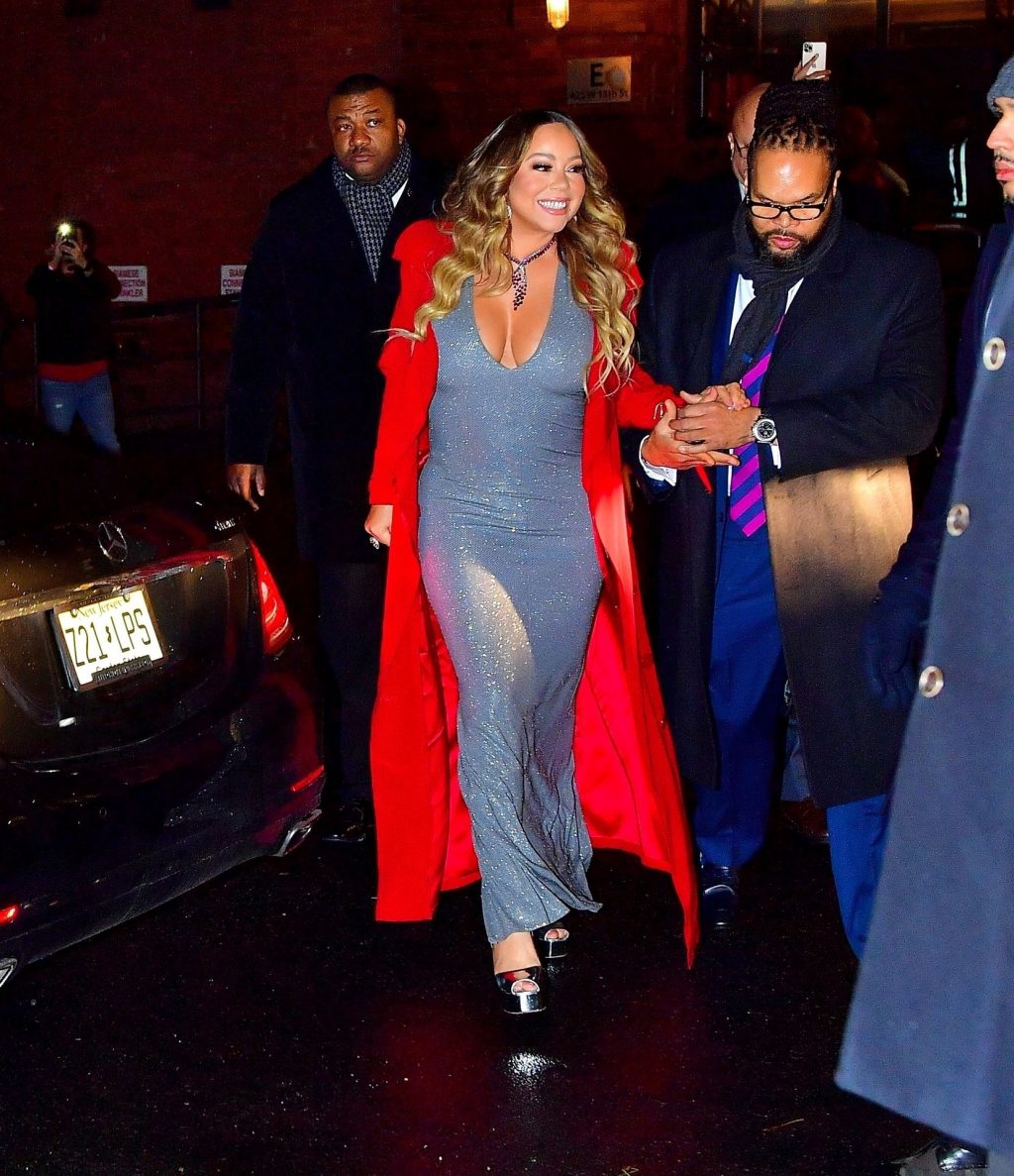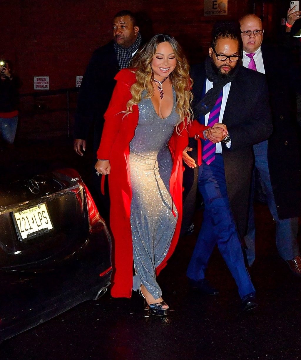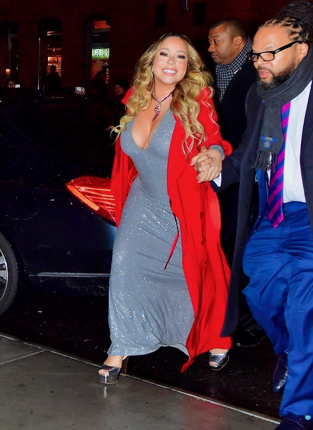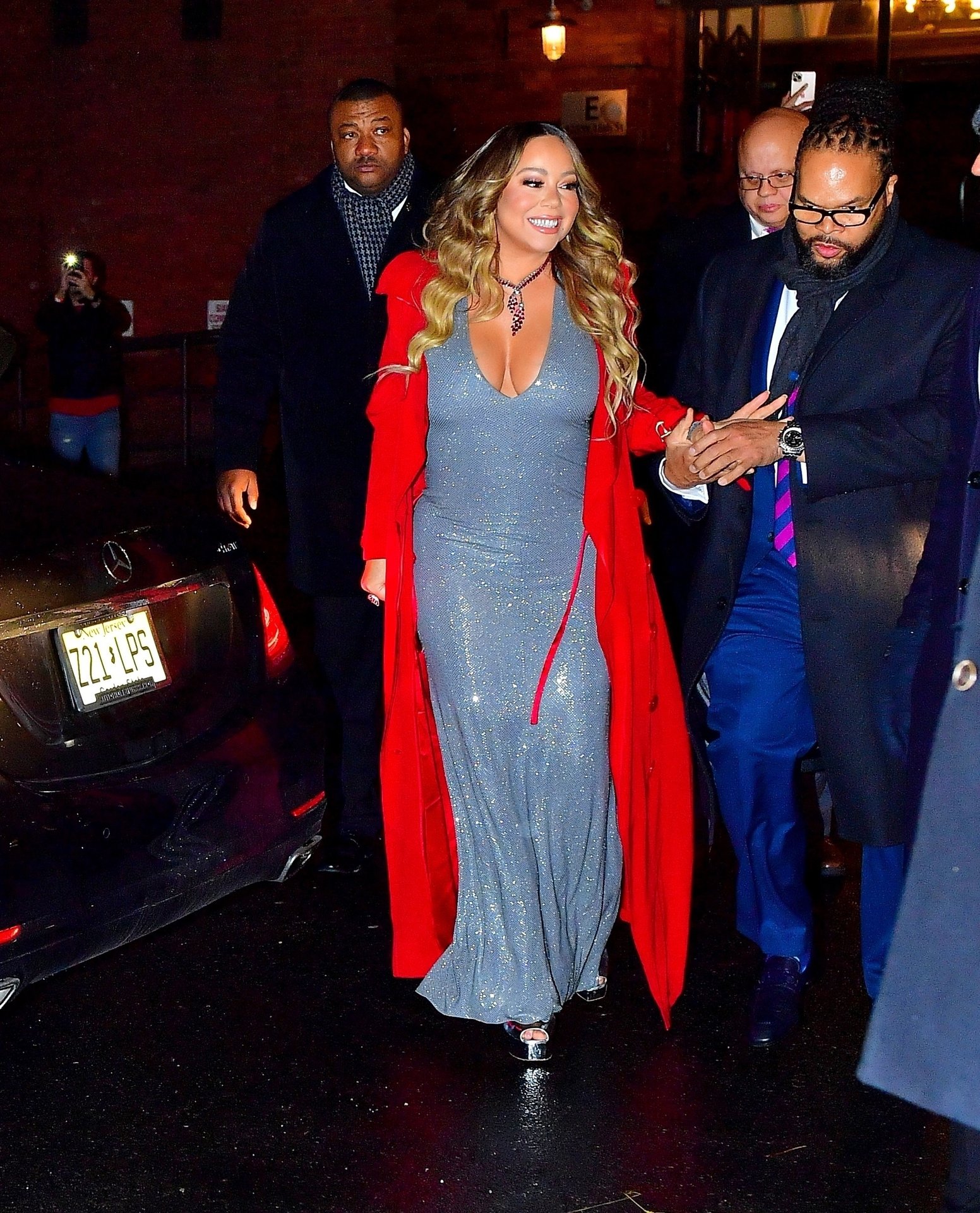 Festosa Mariah Carey esce con un abito argento e un soprabito rosso per celebrare il 25° anniversario della sua hit natalizia “All I Want For Christmas Is You” a New York, 17/12/2019.
