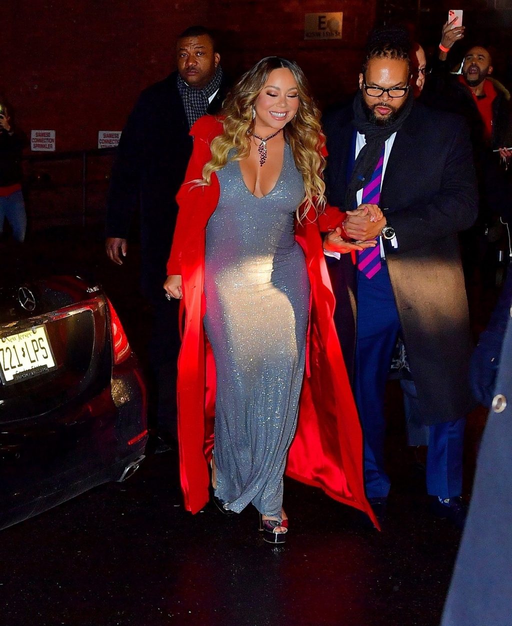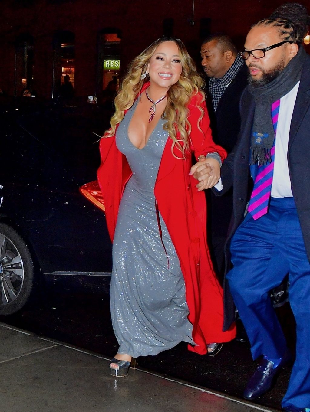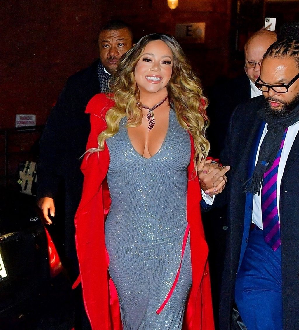 Festosa Mariah Carey esce con un abito argento e un soprabito rosso per celebrare il 25° anniversario della sua hit natalizia “All I Want For Christmas Is You” a New York, 17/12/2019.