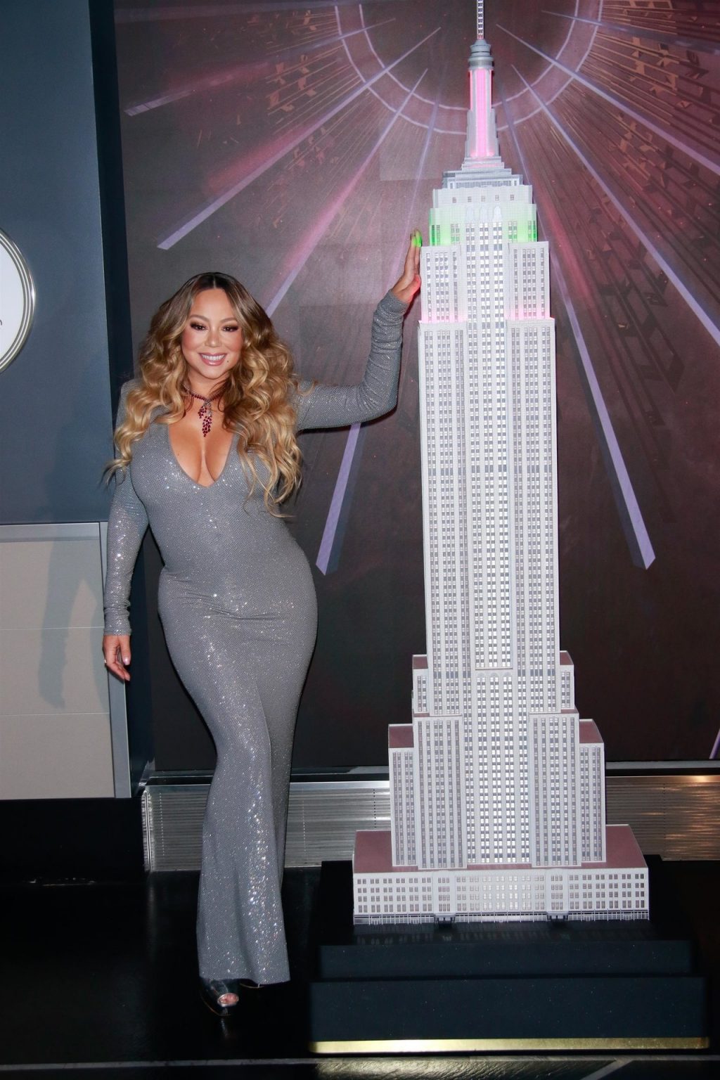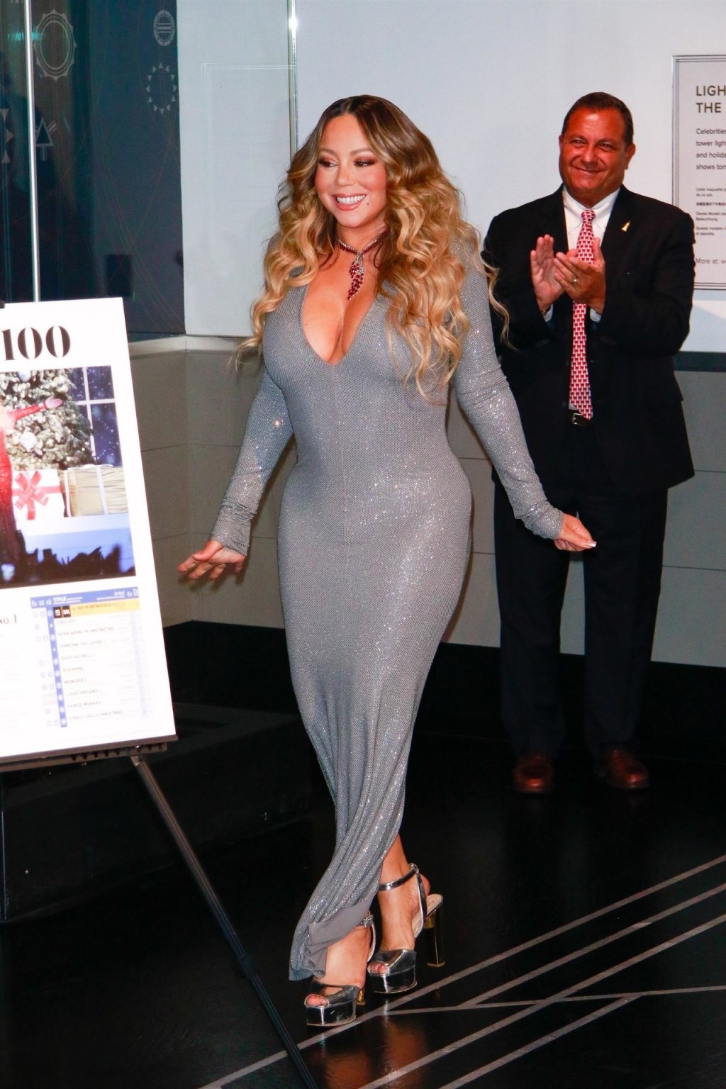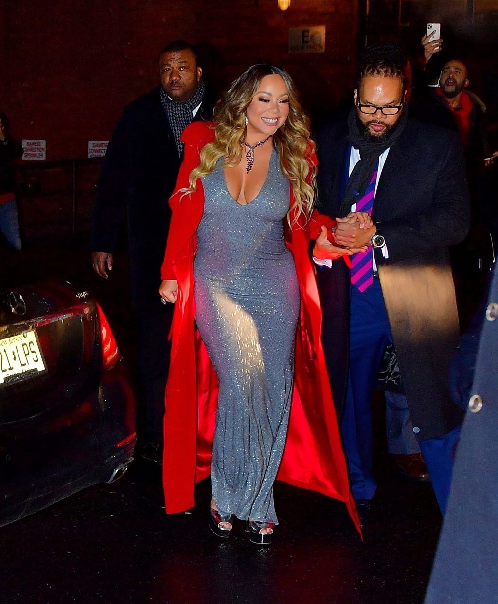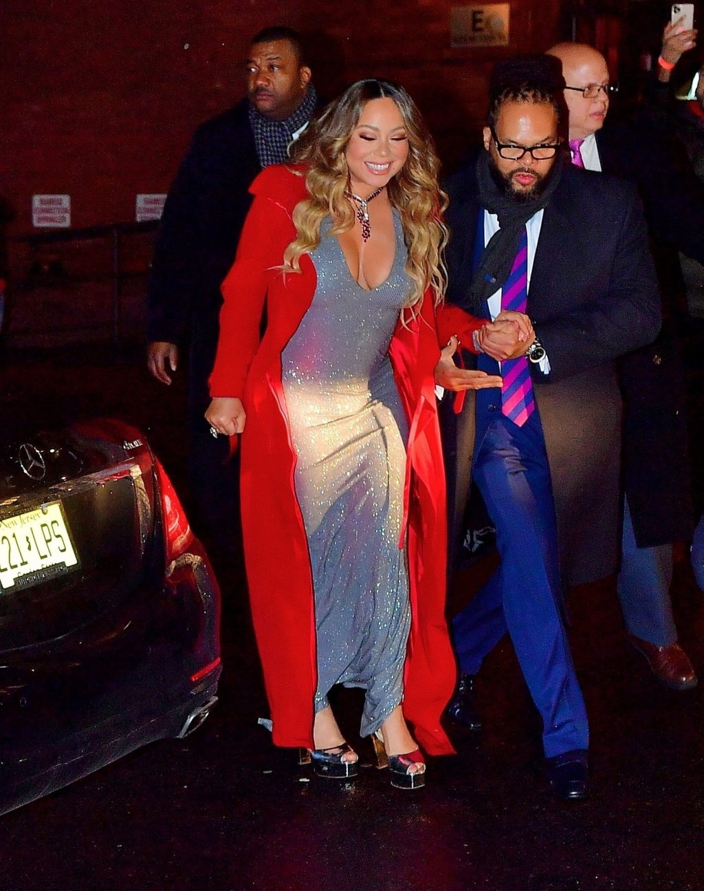 Festosa Mariah Carey esce con un abito argento e un soprabito rosso per celebrare il 25° anniversario della sua hit natalizia “All I Want For Christmas Is You” a New York, 17/12/2019.