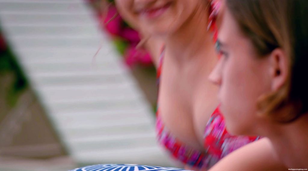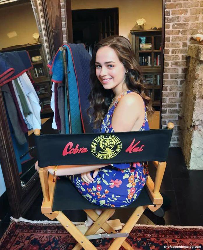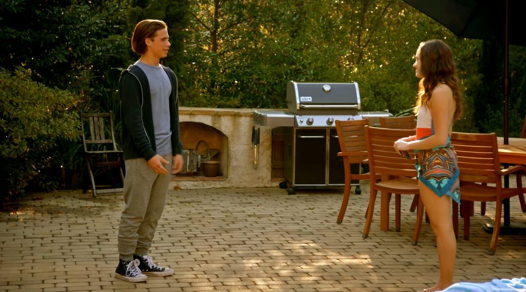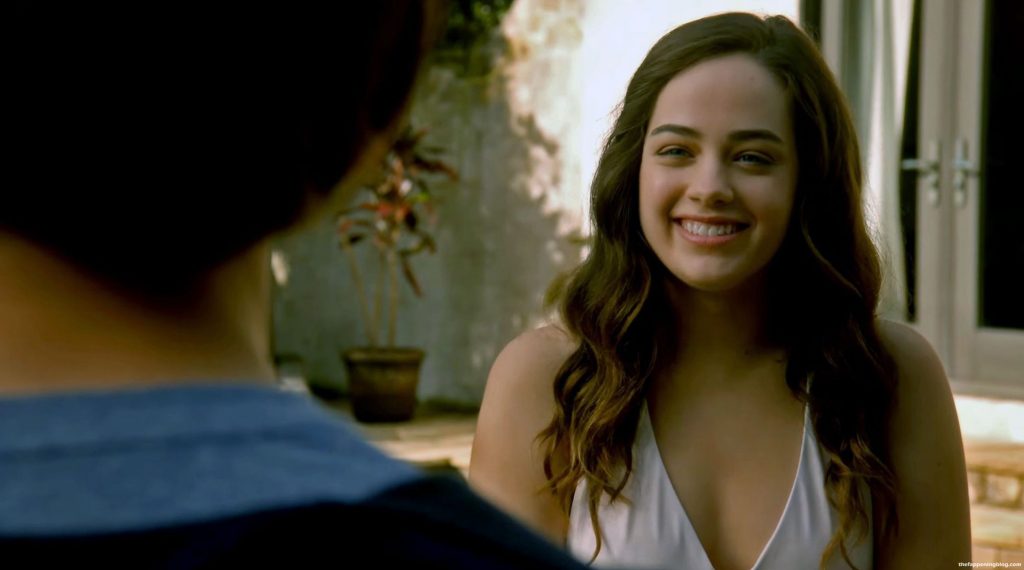 The first two scenes you’re about to see are from a new TV series called “Cobra Kai”. Mary Mouser is lying on a lounge chair by the pool when a man comes to the backyard, causing her to stand up and talk to him, showing her hard nipples, and offering a little peek of her dark nipples under her swimsuit, in front of her dad and talking to both of them.