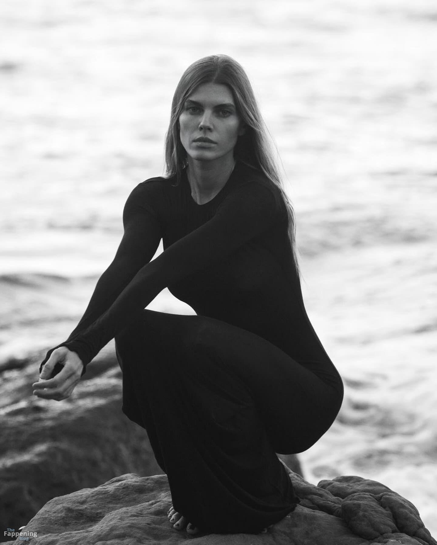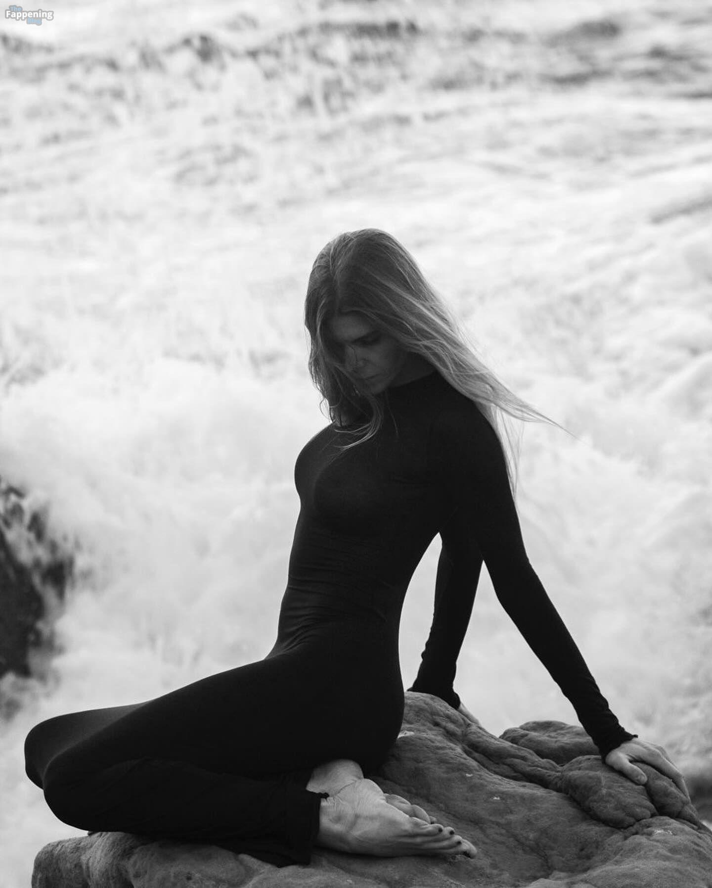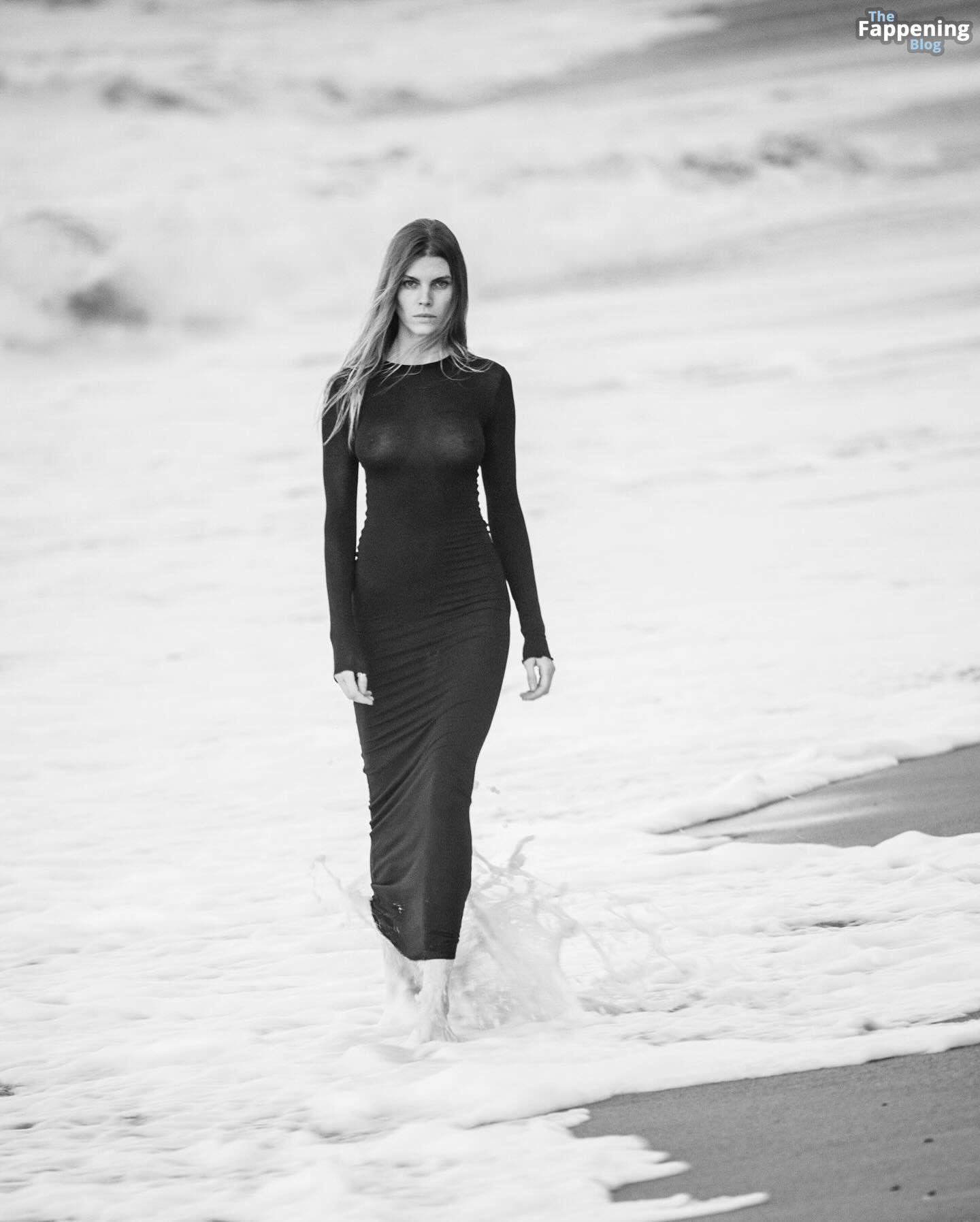 Maryna Linchuk è fotografata sulla spiaggia, indossando un abito attillato e trasparente che non lascia nulla all’immaginazione. Sta mettendo in mostra il suo petto nudo.