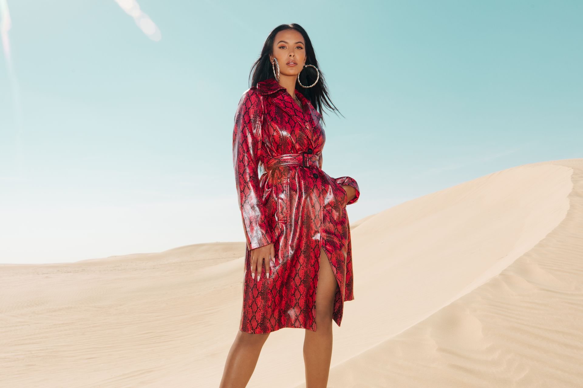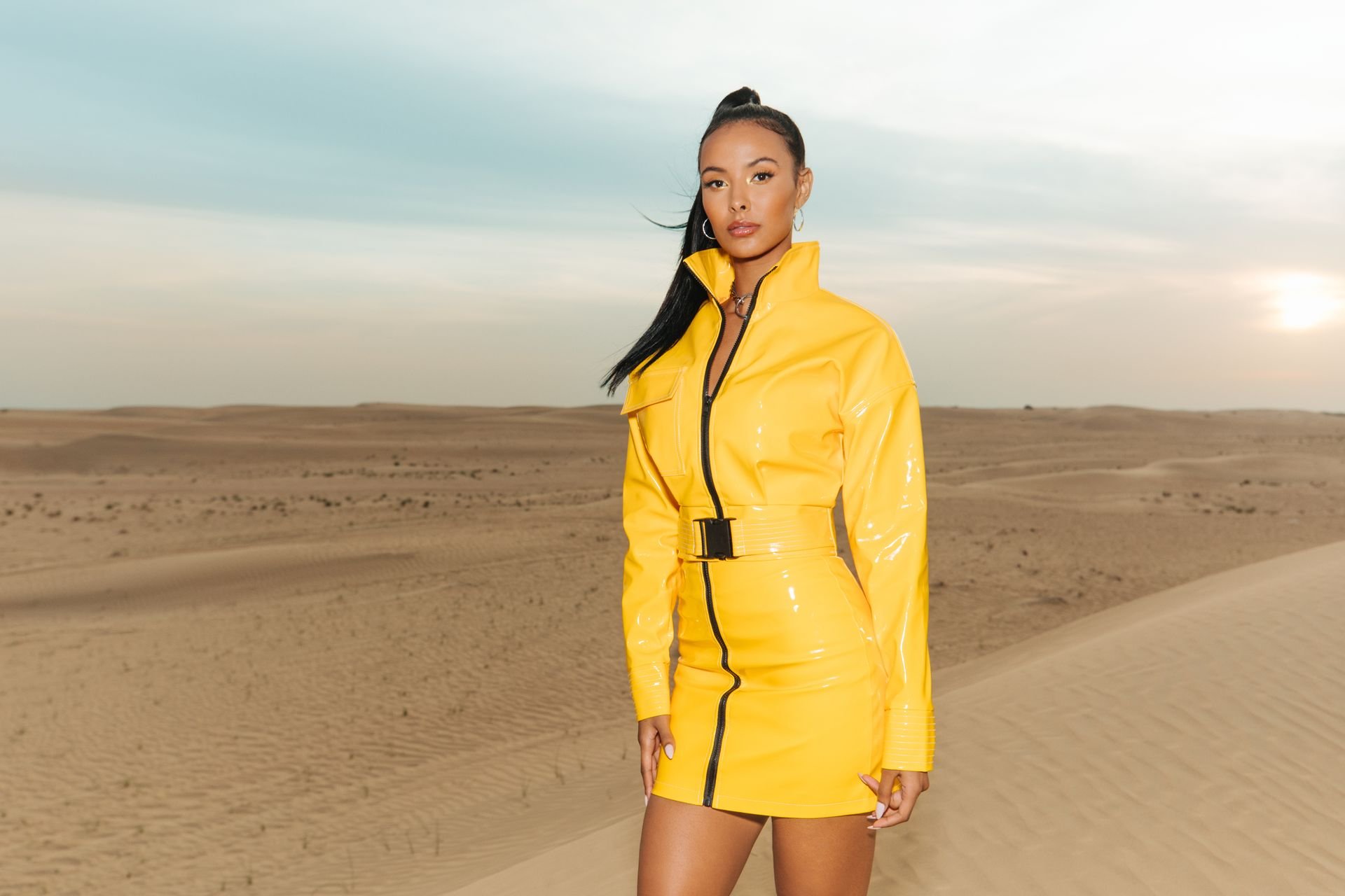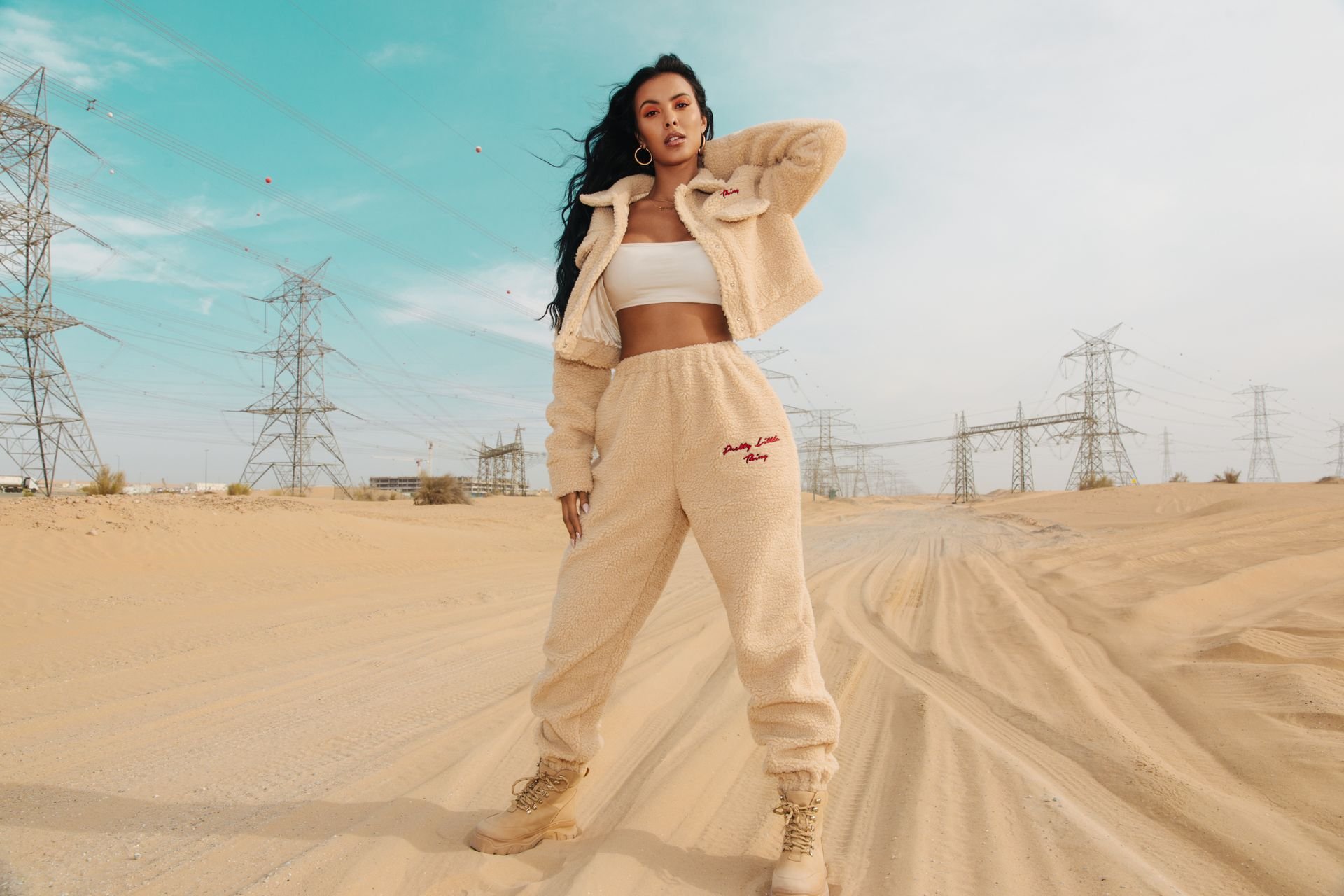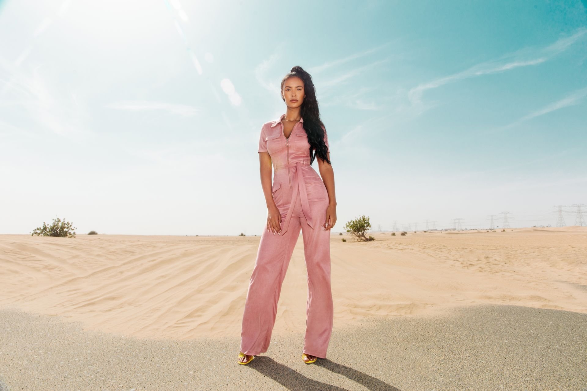 La modella Maya Jama ha collaborato con PrettyLittleThing per lanciare la sua seconda collezione di abbigliamento con il marchio di moda online, che include tute, vestiti e pantaloni da jogging.