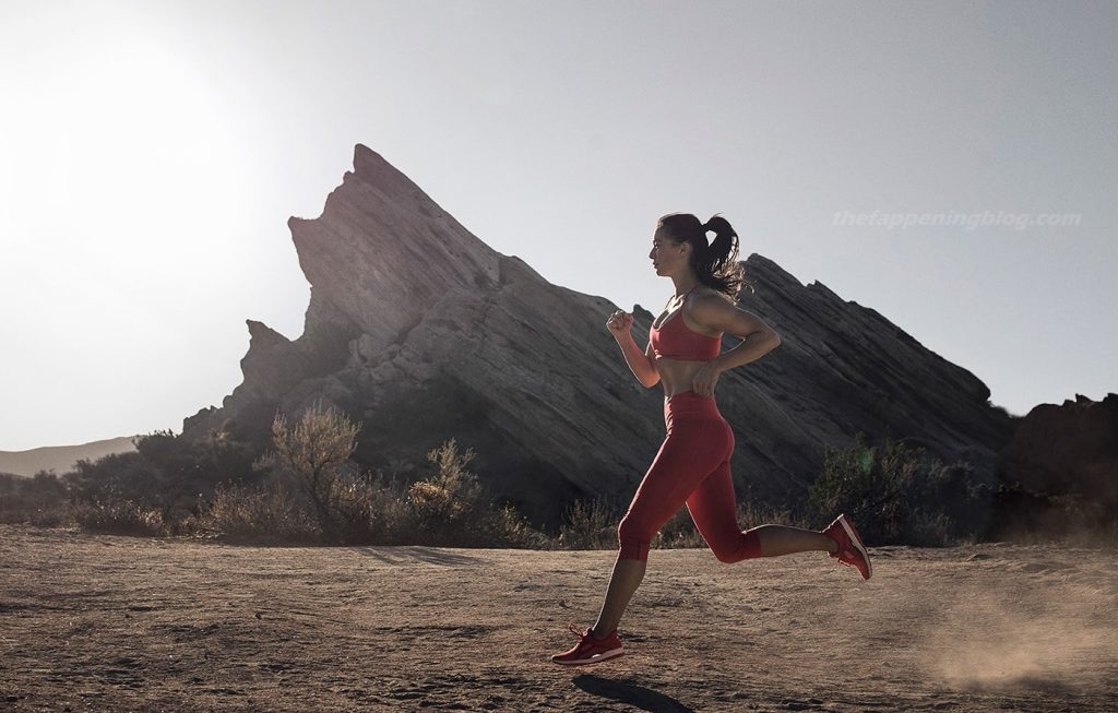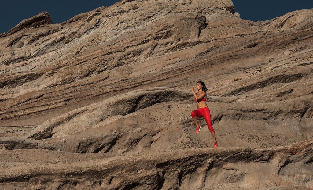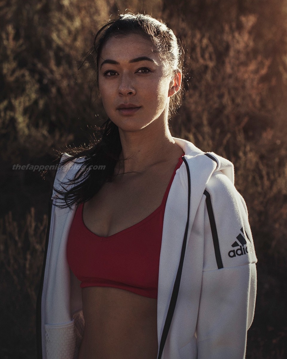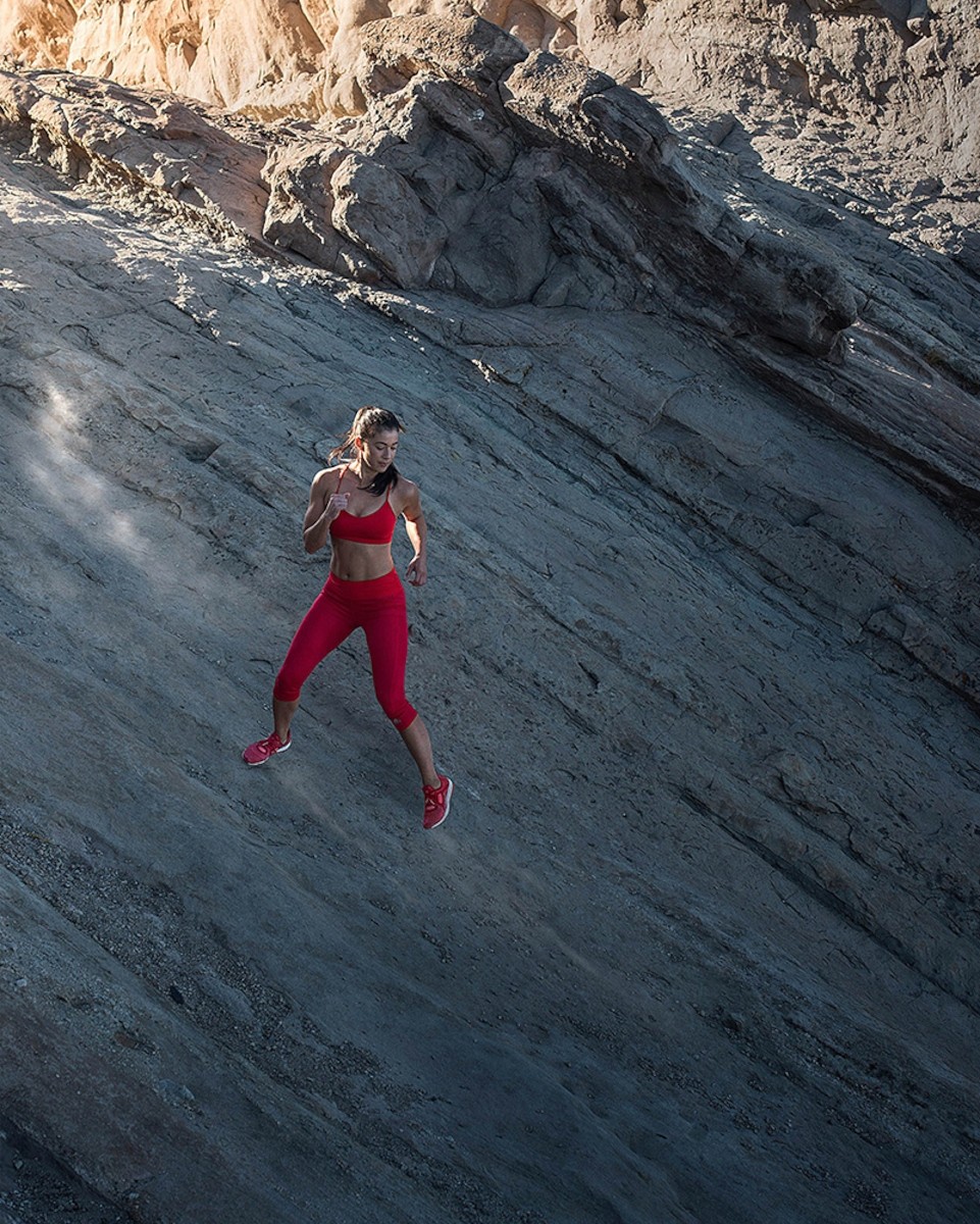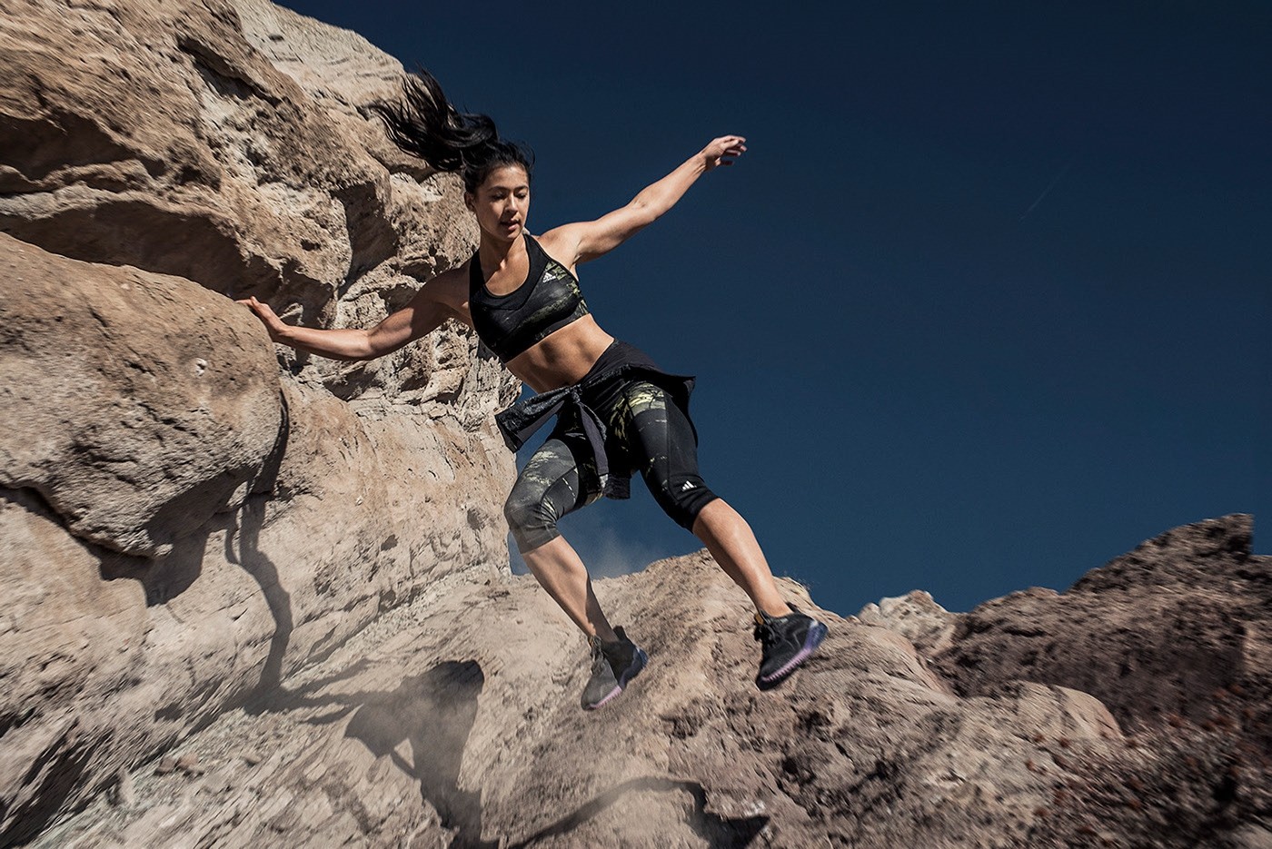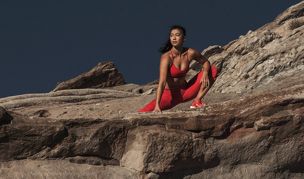 Ballerina americana, attrice, modella e ambasciatrice Adidas Meagan Kong posa durante un allenamento su un terreno roccioso in un servizio fotografico di Franz Steiner.