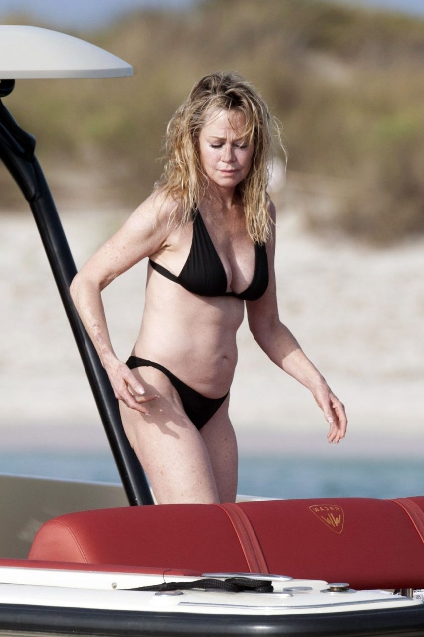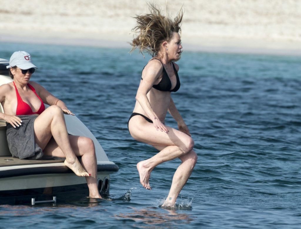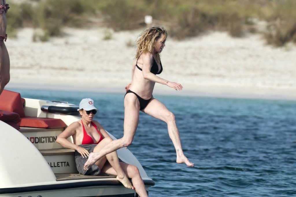 L’attrice americana Melanie Griffith, 61 anni, si gode una giornata al mare e su uno yacht di lusso con amici a Formentera, 07/04/2019. Melanie sembrava felice e rilassata, è saltata in mare ed è andata a nuotare indossando un bikini nero.