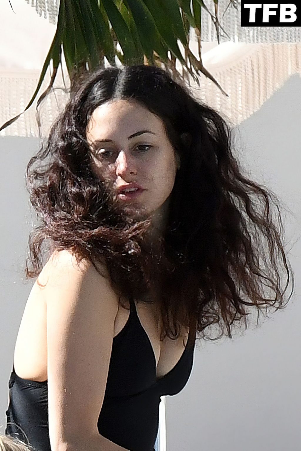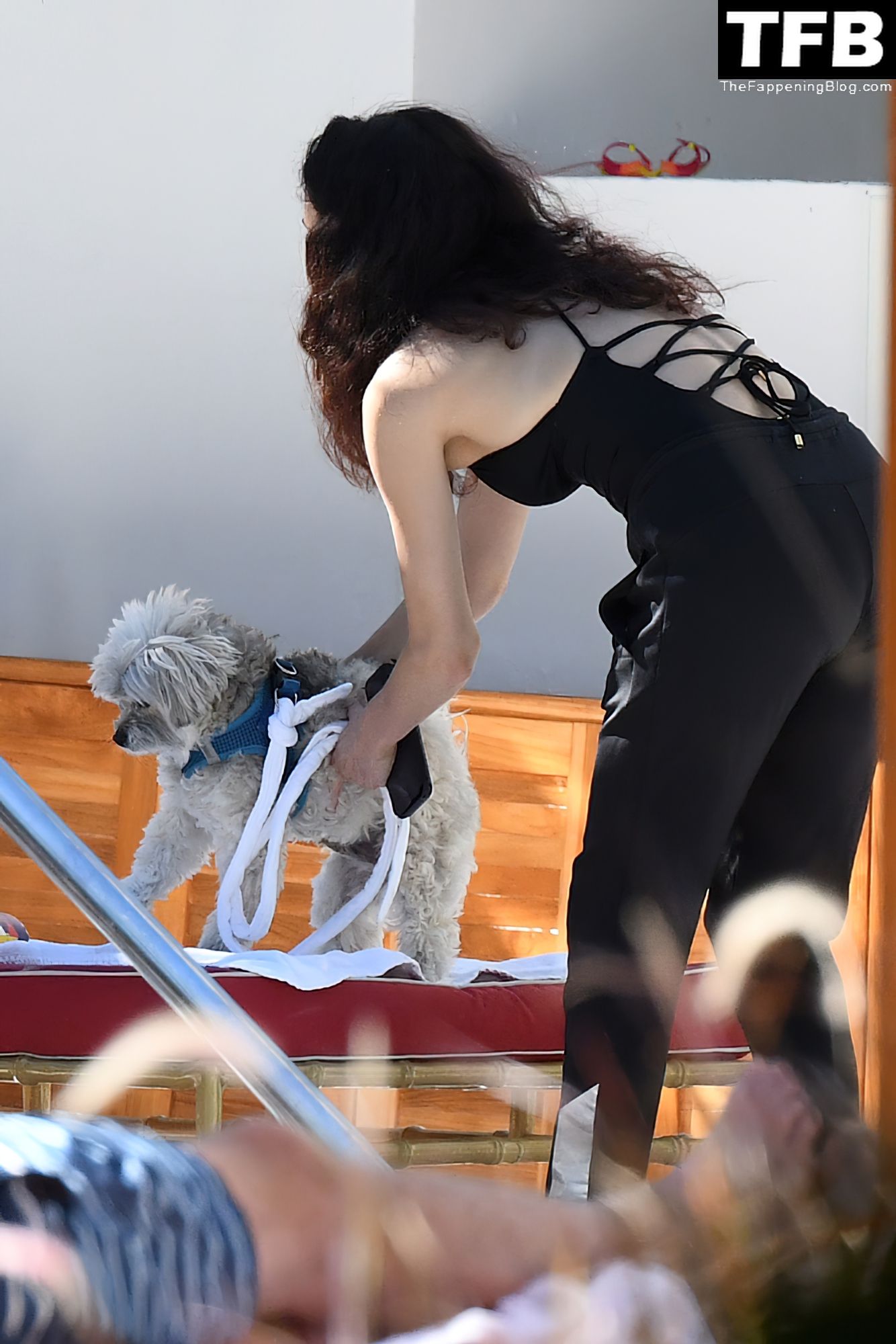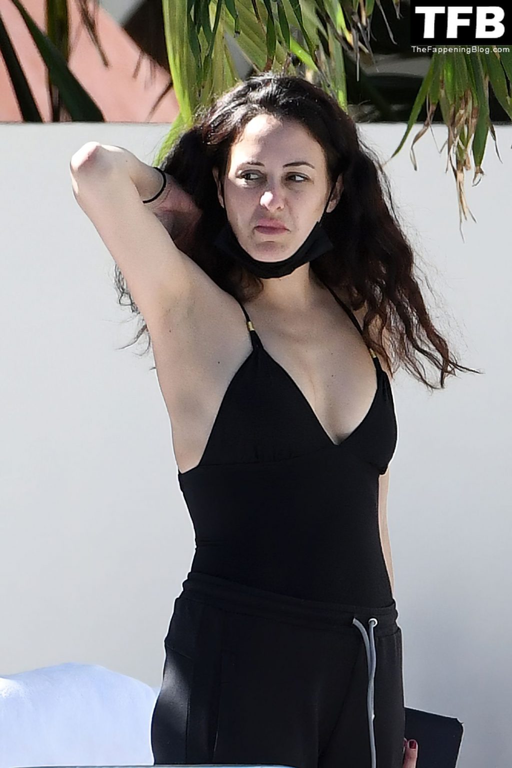 La fidanzata di Mick Jagger, Melanie Hamrick, indossa un costume da bagno nero mentre si rilassa a bordo piscina con il loro figlio Deveraux Jagger a Miami, 23/11/2021.