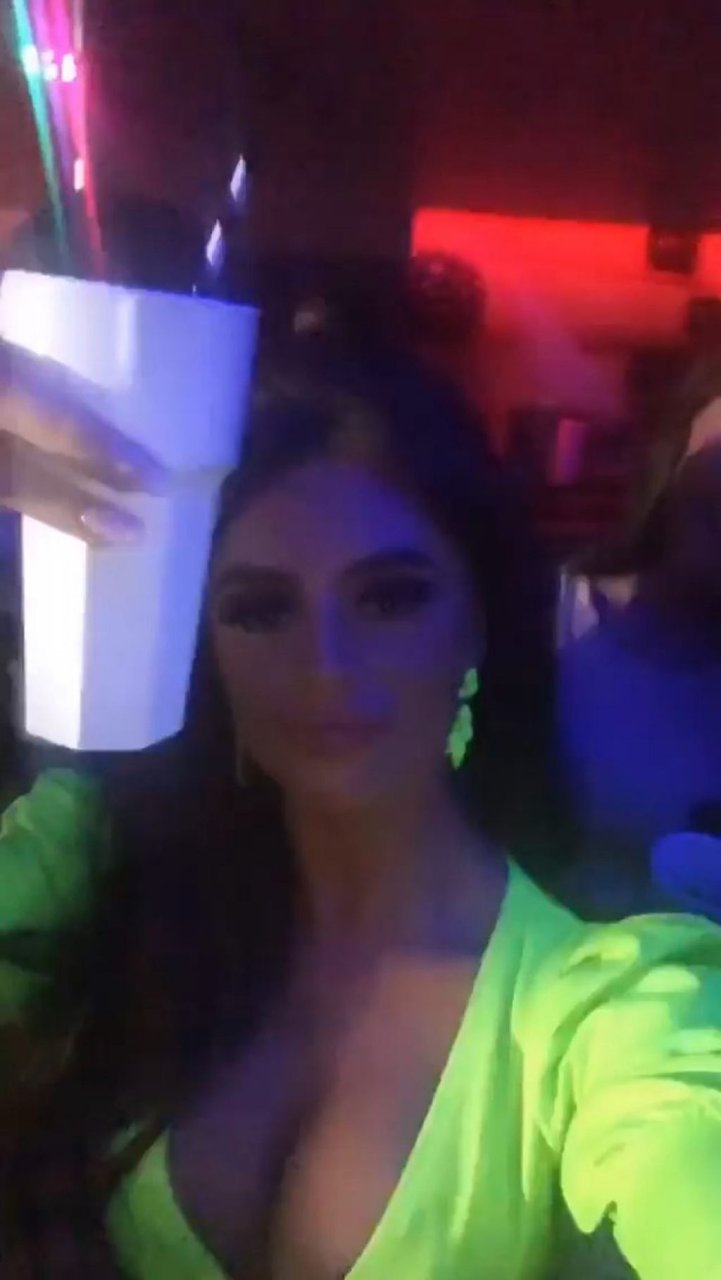 La star di “Absolutely Ascot” Mia Sully fa un arrivo glamour in un vestito verde tossico, mostrando il suo décolleté, alla festa di chiusura di Absolutely Ascot a Londra, 13/09/2019.
