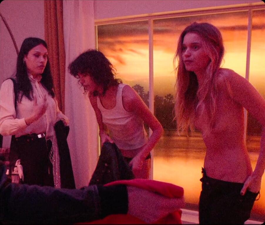 Abbey Lee e Mica Argañaraz sono entrambe senza maglietta mentre si cambiano dietro le quinte di un set cinematografico, le ragazze finiscono in mutandine (Abbey a destra, Mica a sinistra con una canottiera e capezzoli visibili all’inizio).