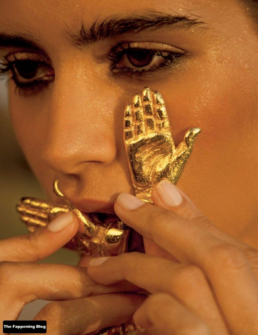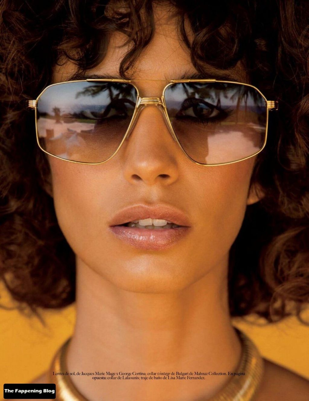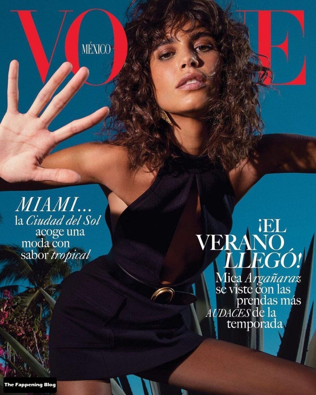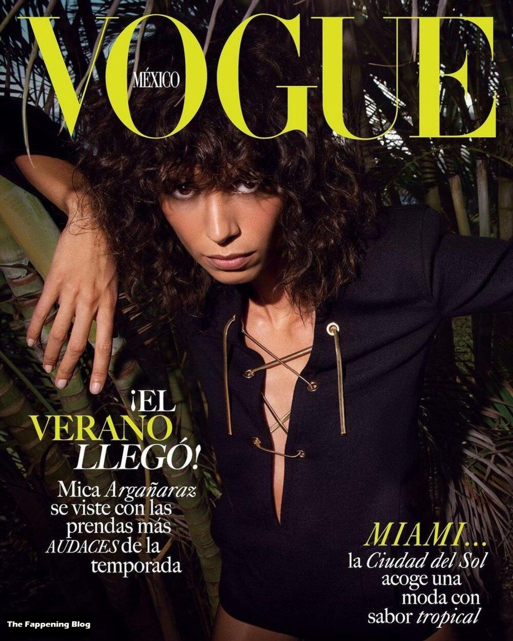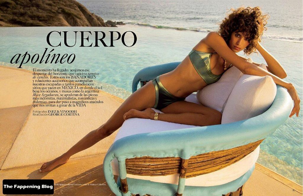 La modella Mica Arganaraz mostra il suo fondoschiena nudo e piatto, posa a seno nudo e in bikini in un servizio fotografico per Vogue Mexico (2021).