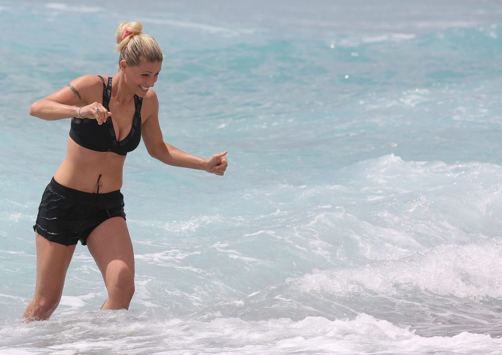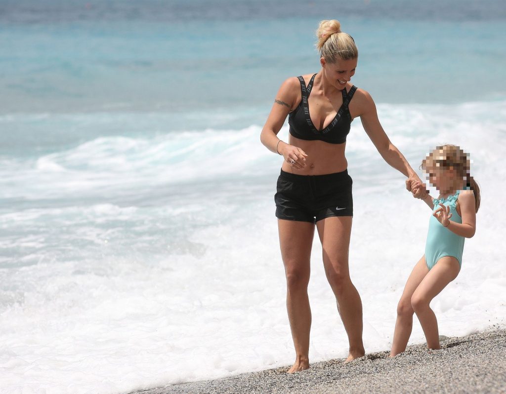 Michelle Hunziker, svizzera-italiana con un seno prosperoso (43 anni), si sta bagnando nel mare con le sue figlie a Varigotti, 06/06/2020.