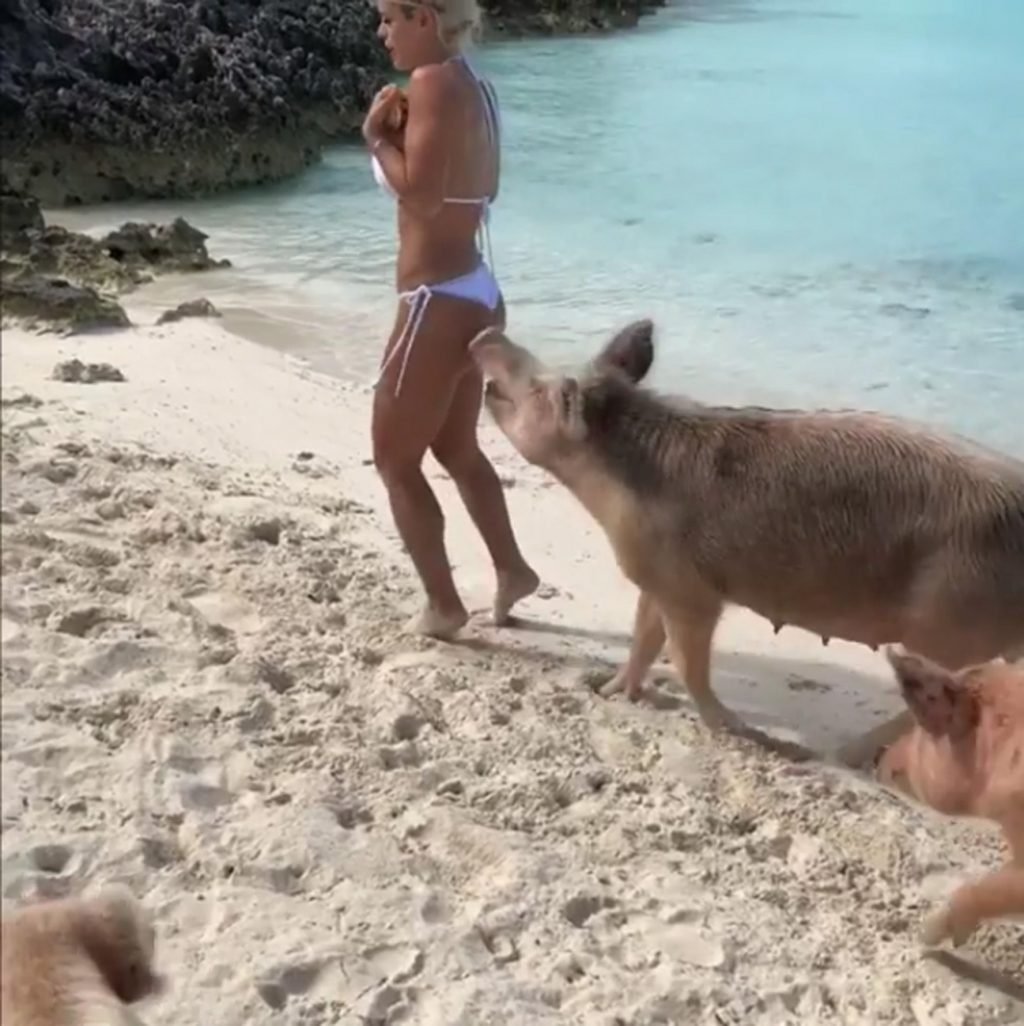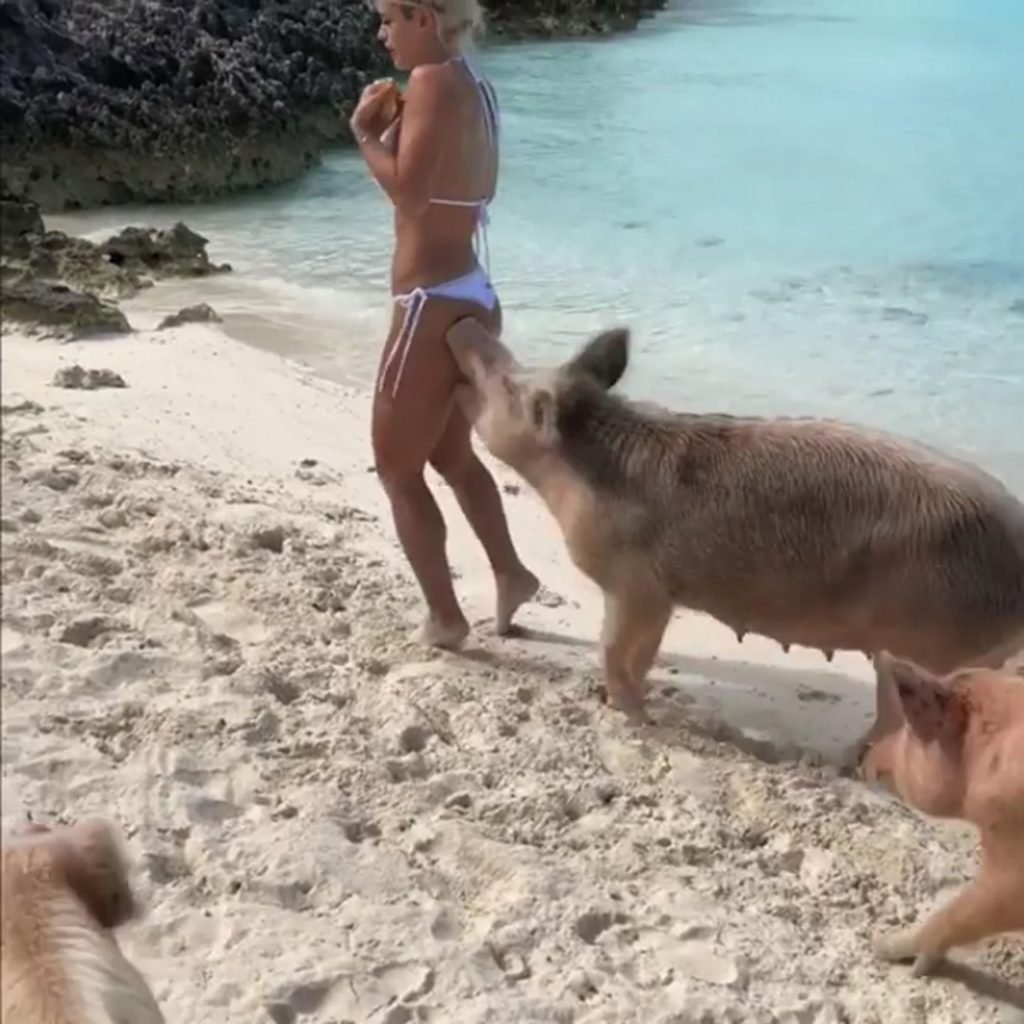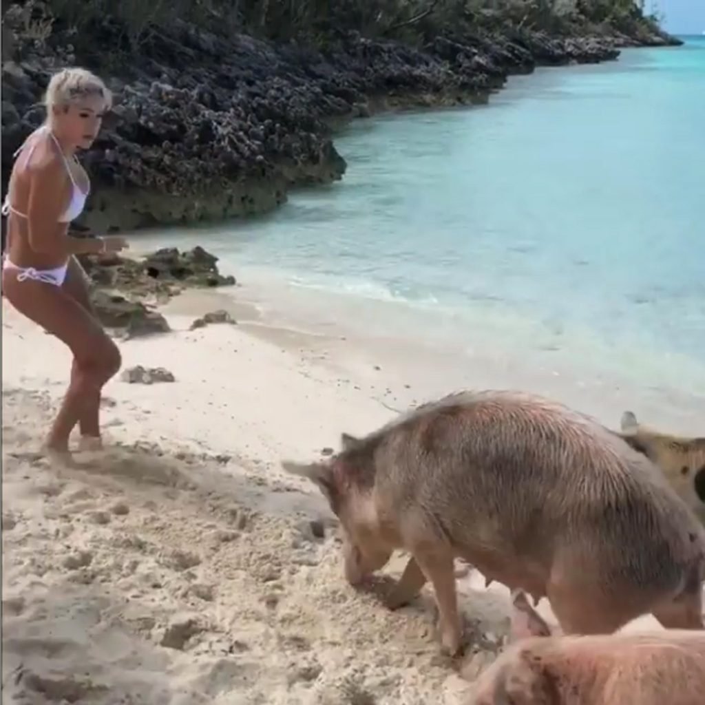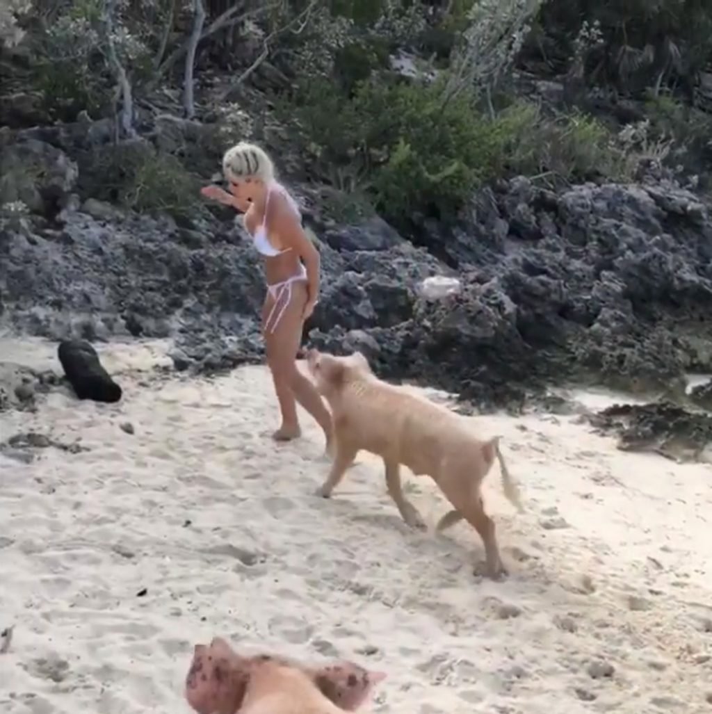 Immagini tratte dal filmato del momento in cui la modella di Instagram Michelle Lewin è stata morsicata sul sedere da un cinghiale selvatico su una spiaggia alle Bahamas, 02/11/2019.