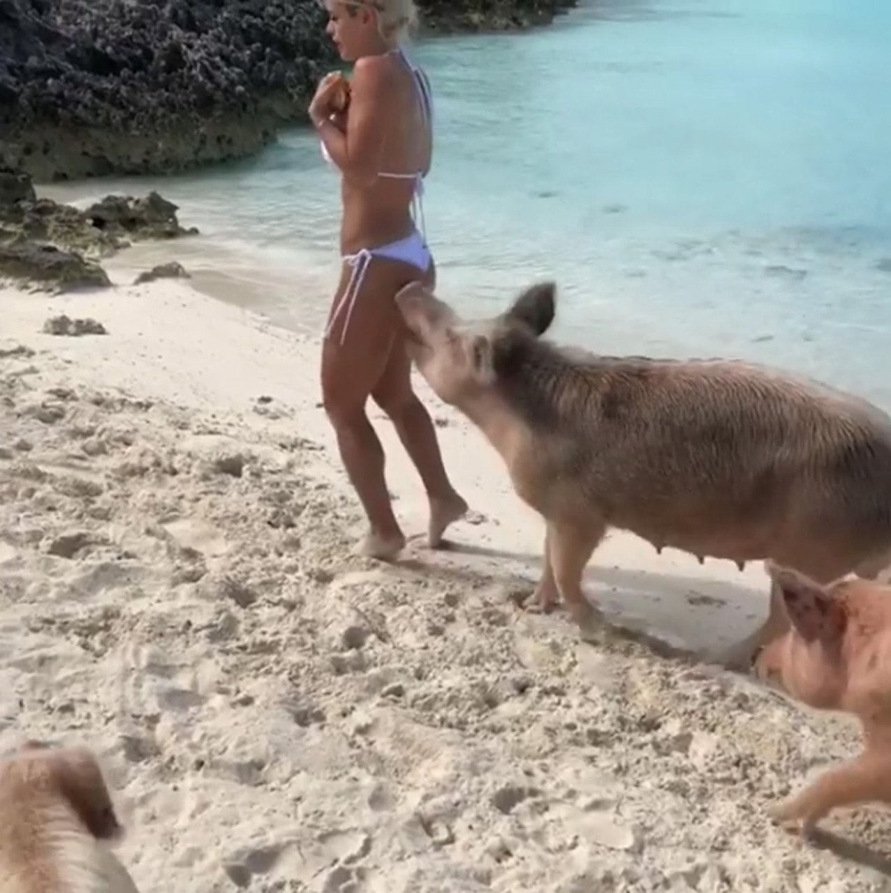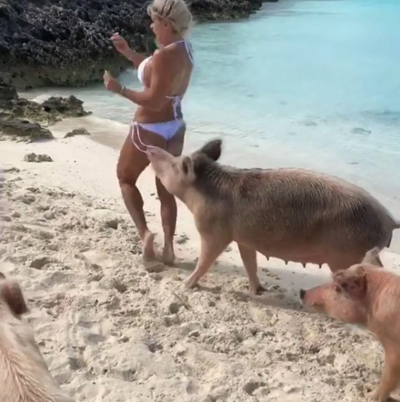 Immagini tratte dal filmato del momento in cui la modella di Instagram Michelle Lewin è stata morsicata sul sedere da un cinghiale selvatico su una spiaggia alle Bahamas, 02/11/2019.