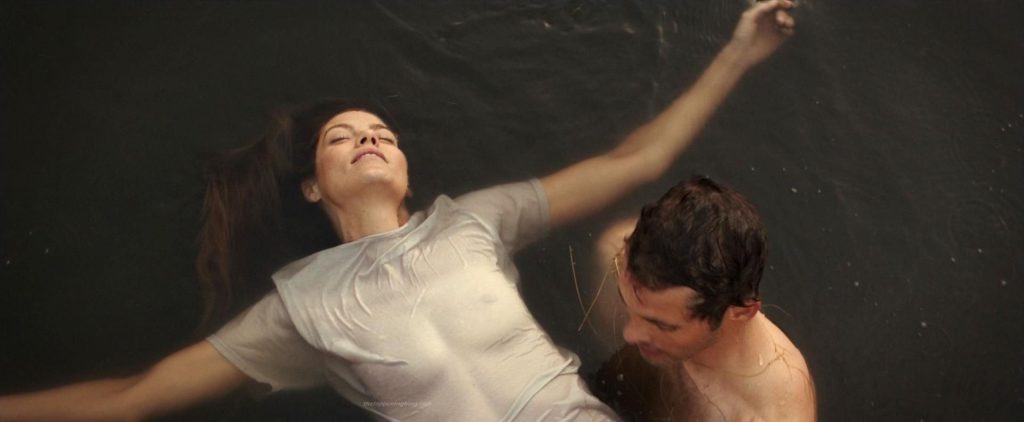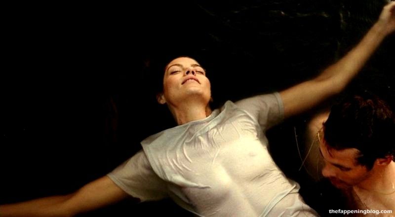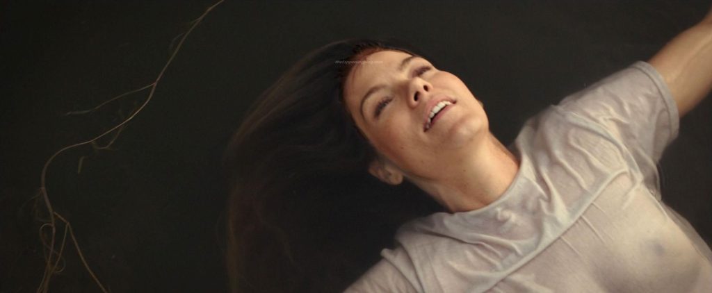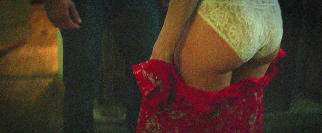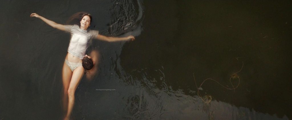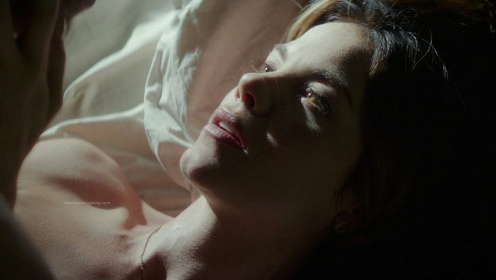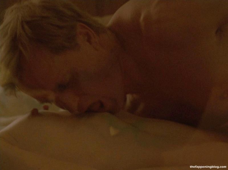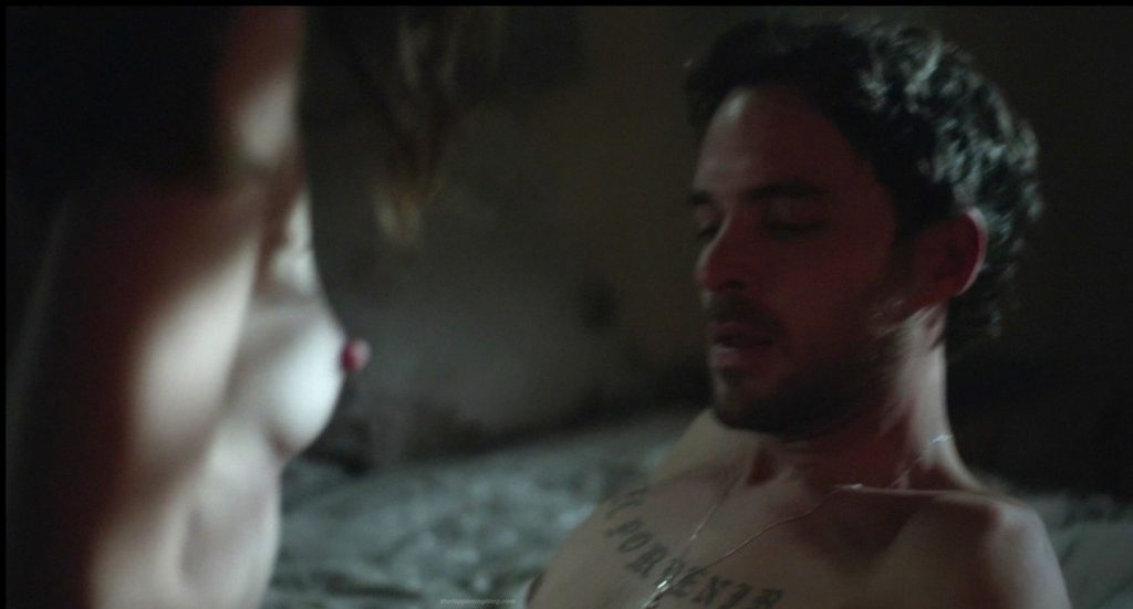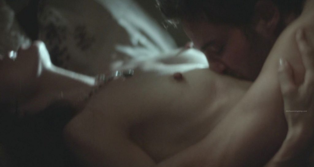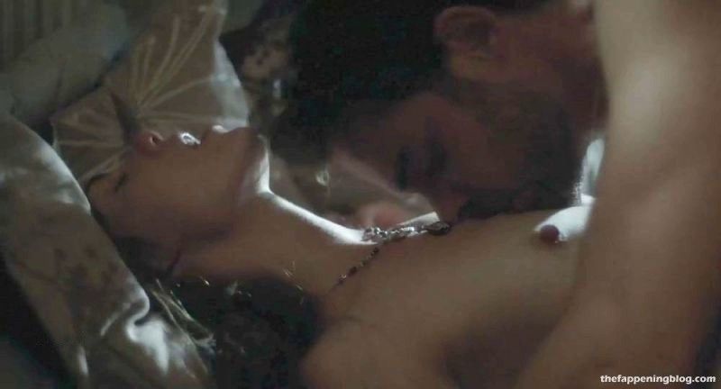 Monaghan si muove senza maglietta su un letto mentre cerca di coccolare un uomo, mostrandoci diversi scorci dei suoi capezzoli nel processo.