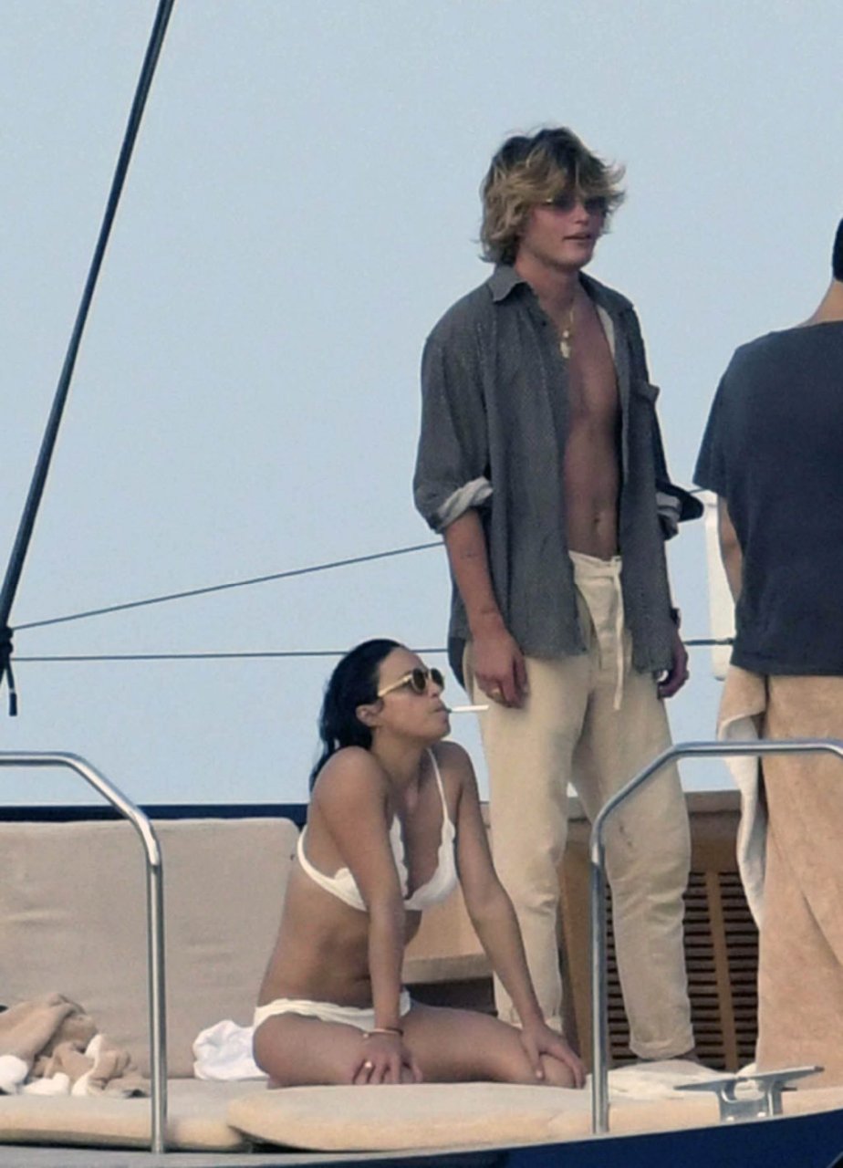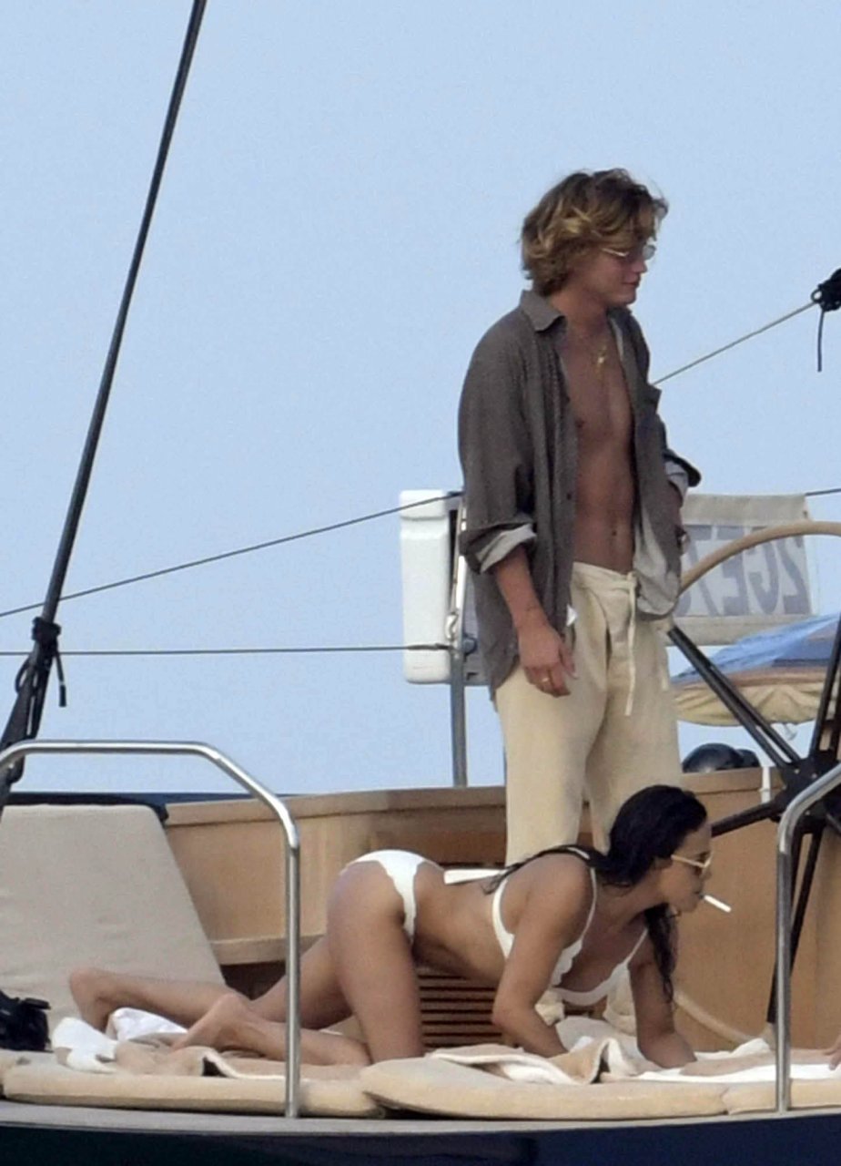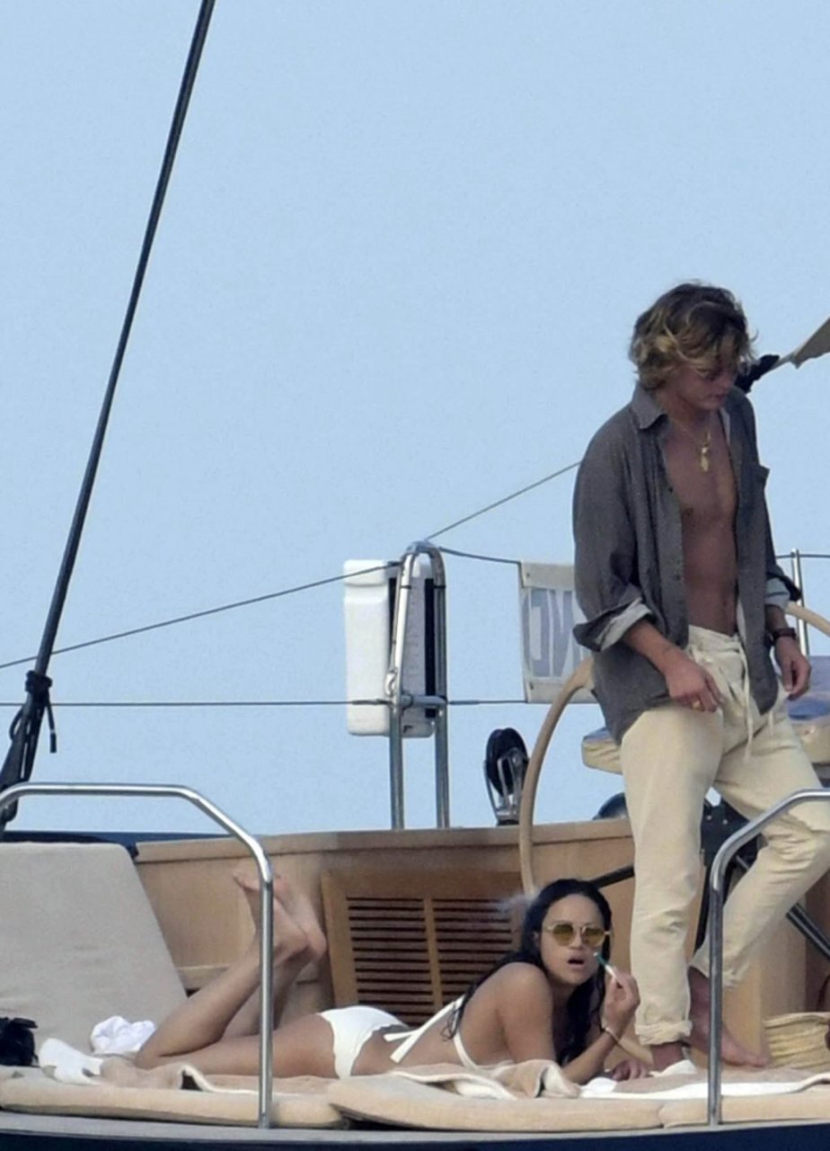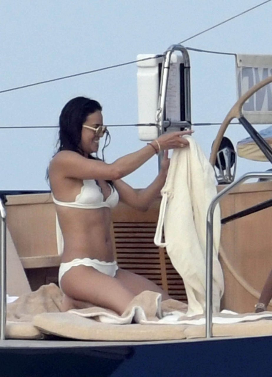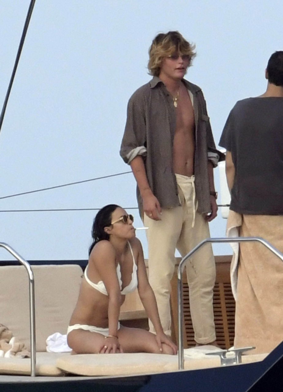Una Michelle Rodriguez mozzafiato mostra il suo corpo in bikini insieme al modello australiano Jordan Barrett su uno yacht in Sardegna, 08/08/2018. La coppia è stata vista mentre si godeva del vino bianco sulla loro barca.