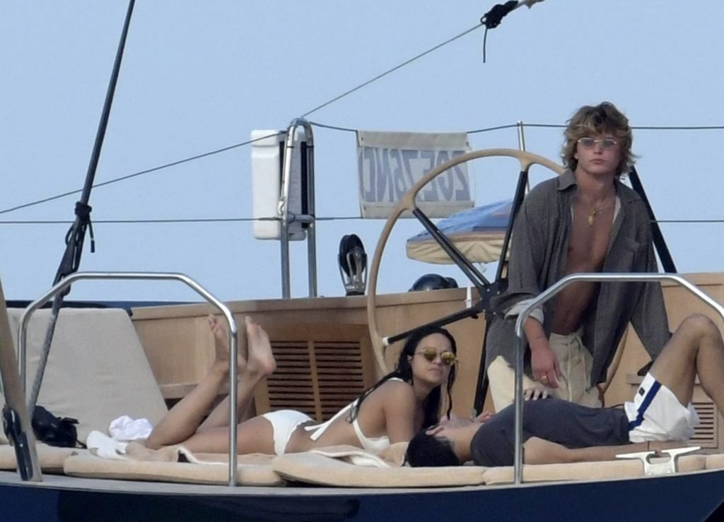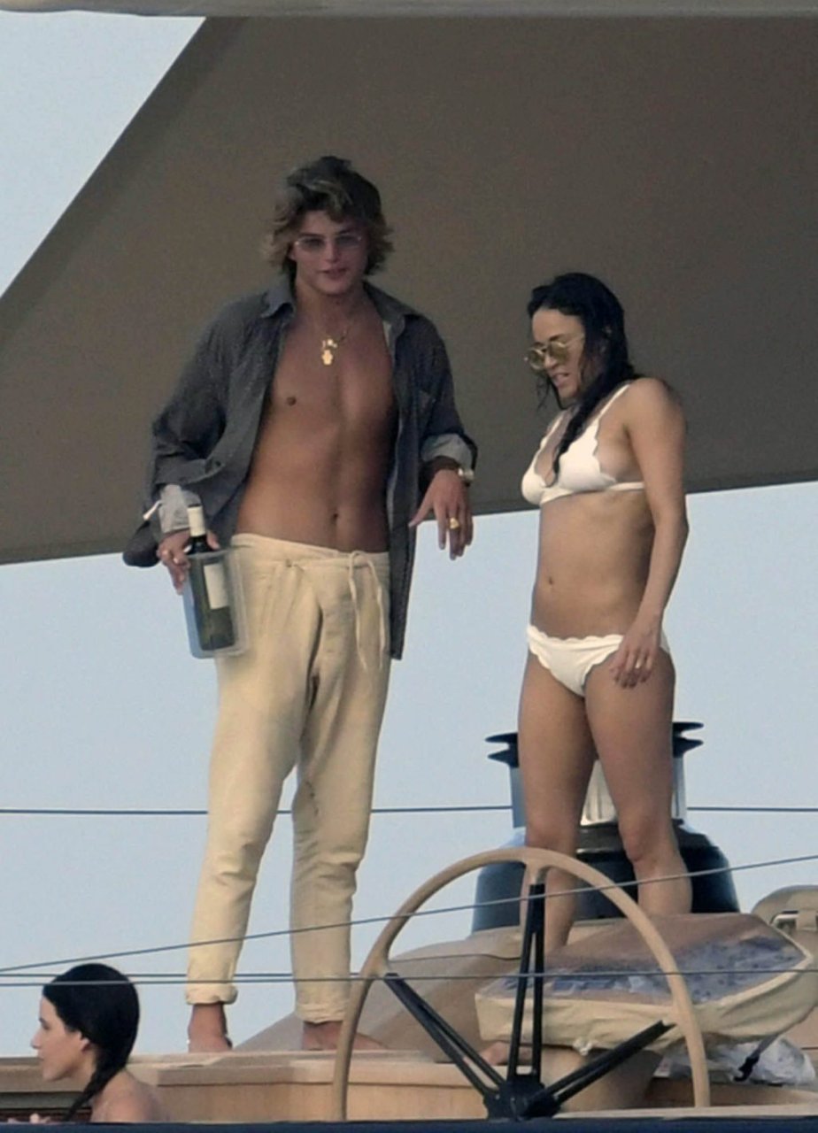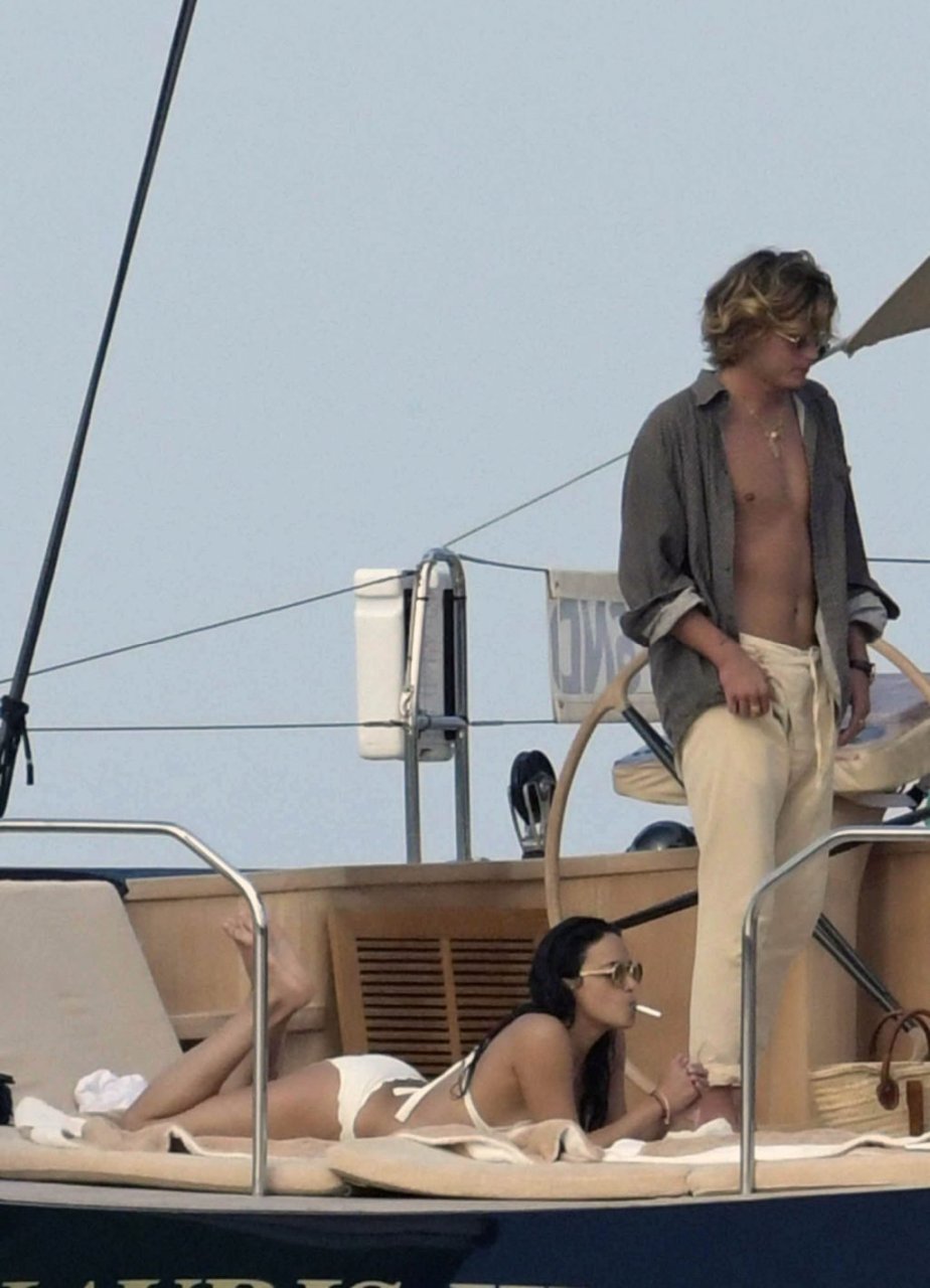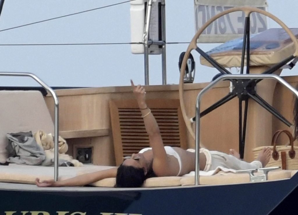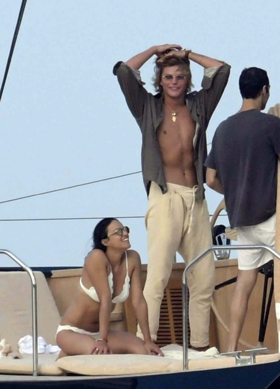 Una Michelle Rodriguez mozzafiato mostra il suo corpo in bikini insieme al modello australiano Jordan Barrett su uno yacht in Sardegna, 08/08/2018. La coppia è stata vista mentre si godeva del vino bianco sulla loro barca.