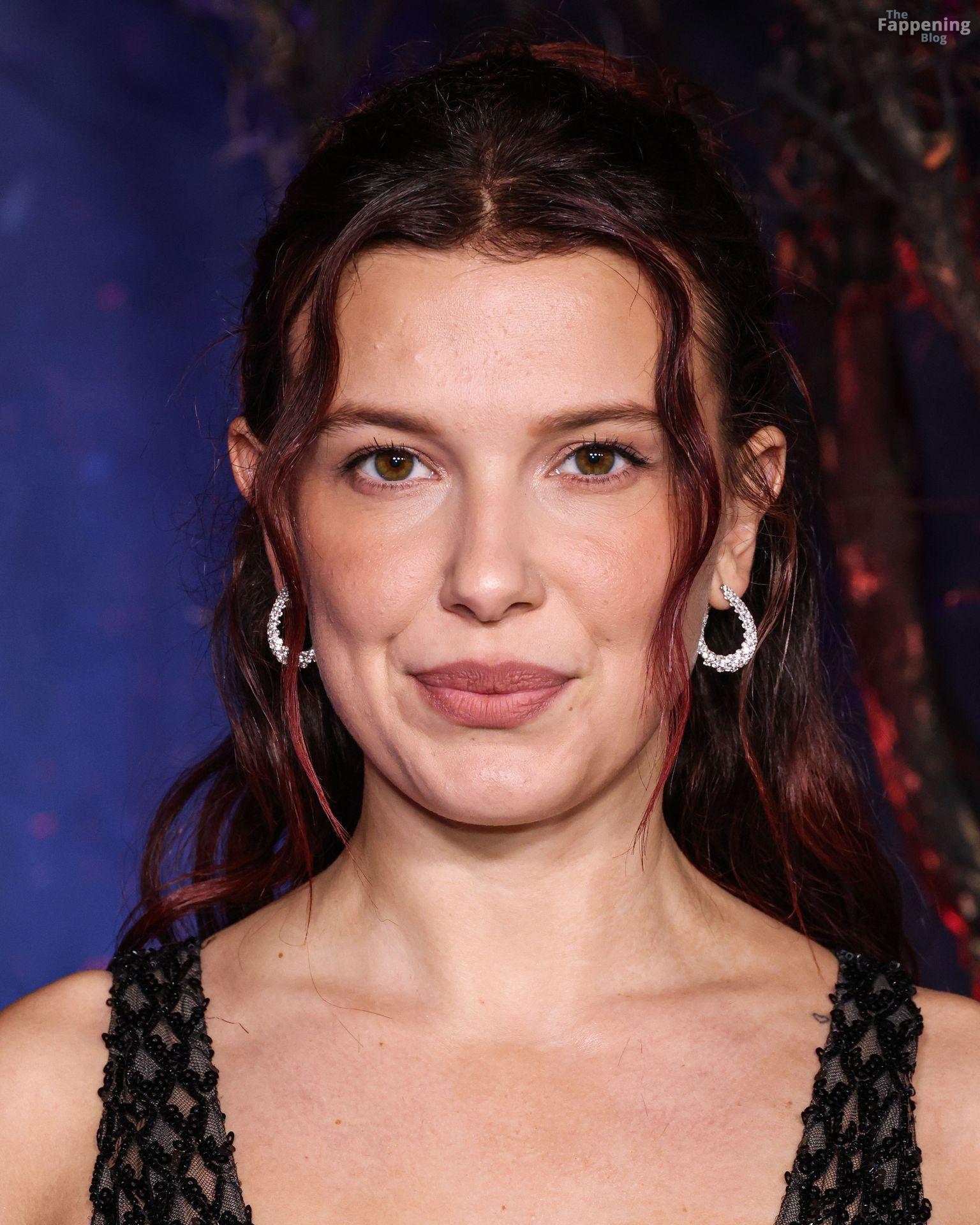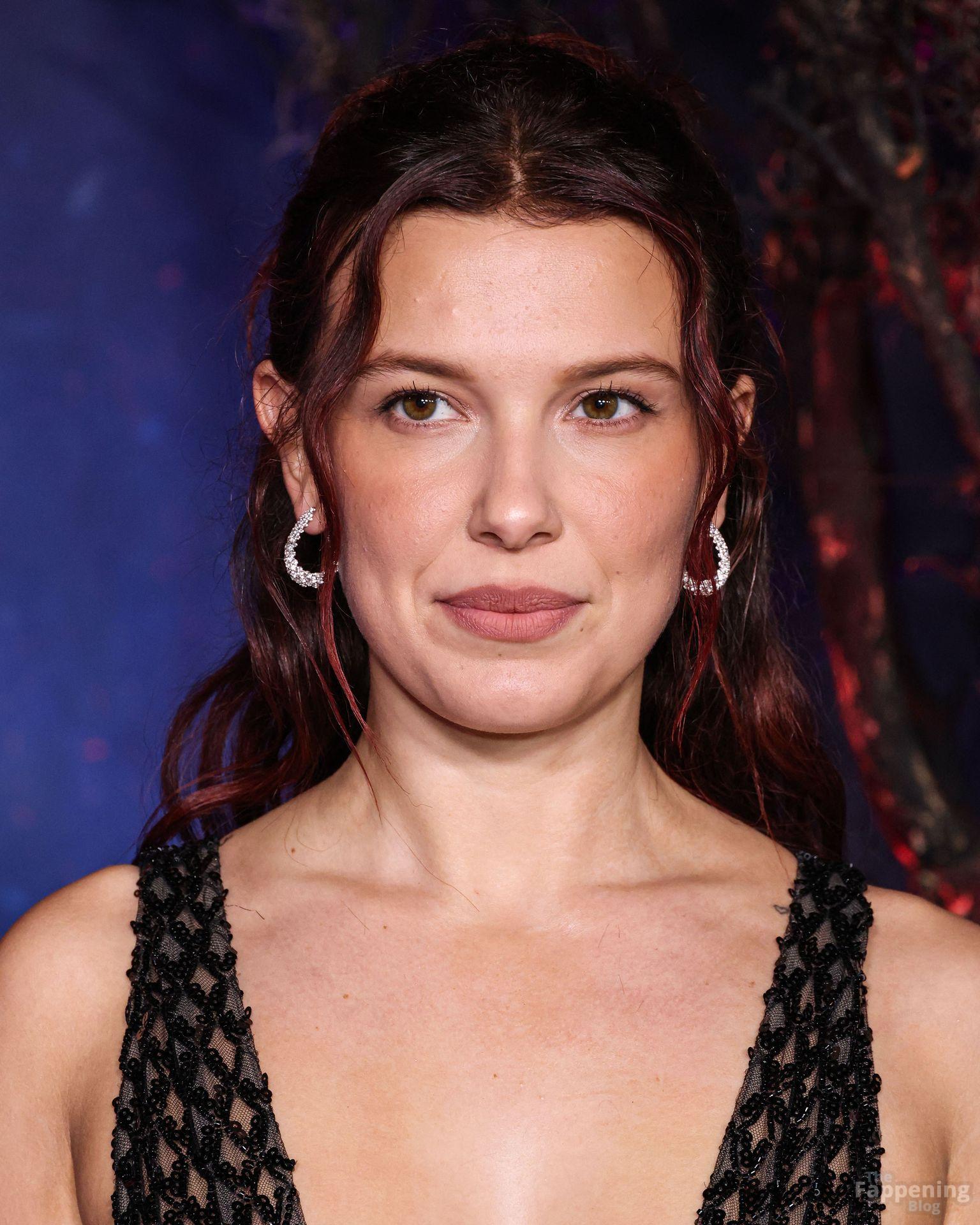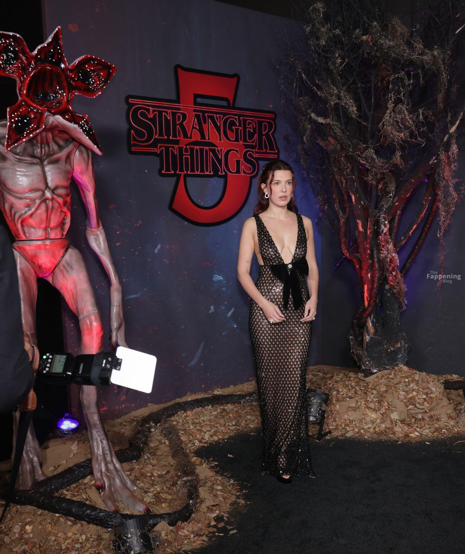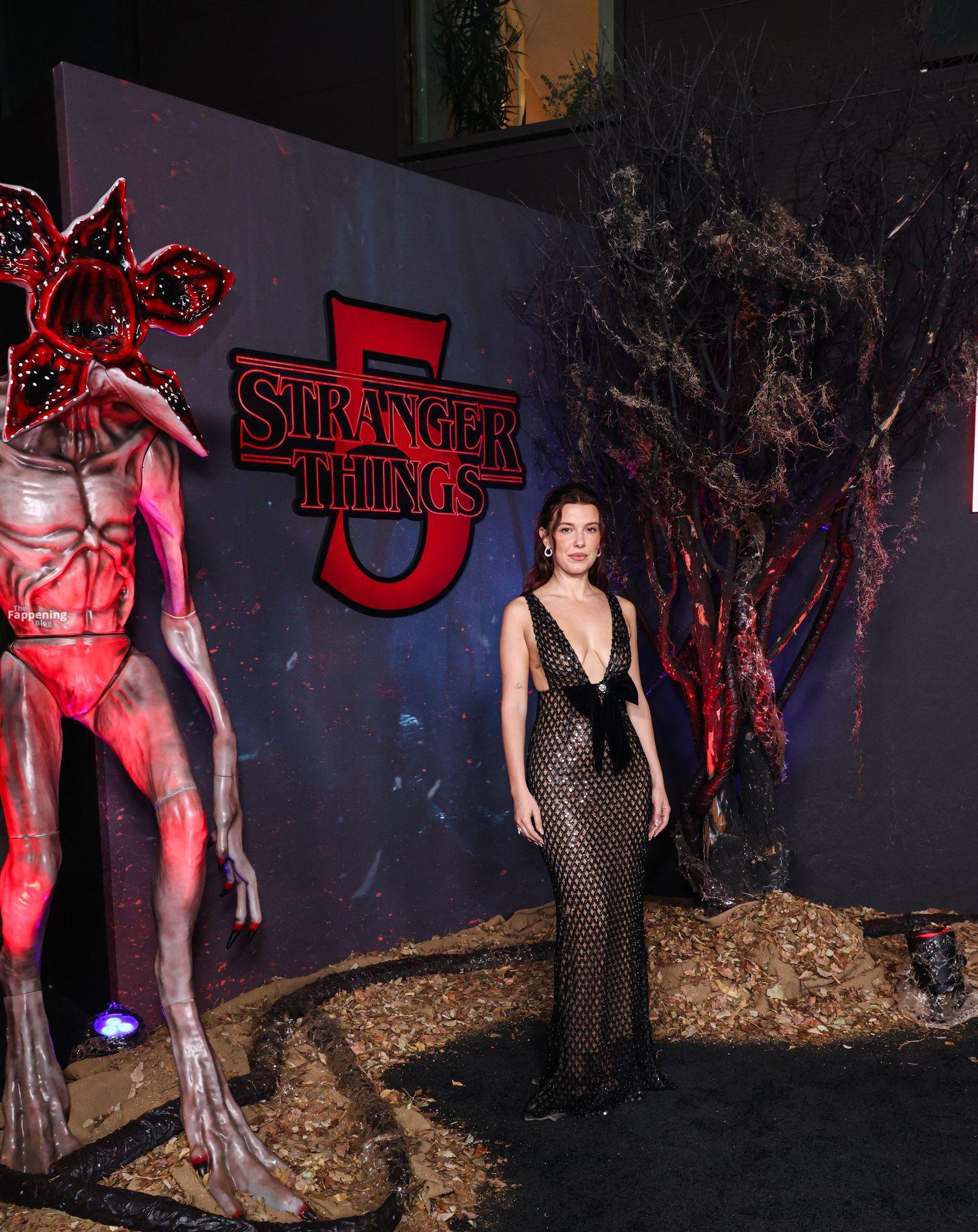 Millie Bobby Brown si è presentata all’evento FYC della quinta stagione di Stranger Things a Hollywood, indossando un abito nero trasparente con paillettes e una scollatura profonda che metteva in mostra il suo seno.