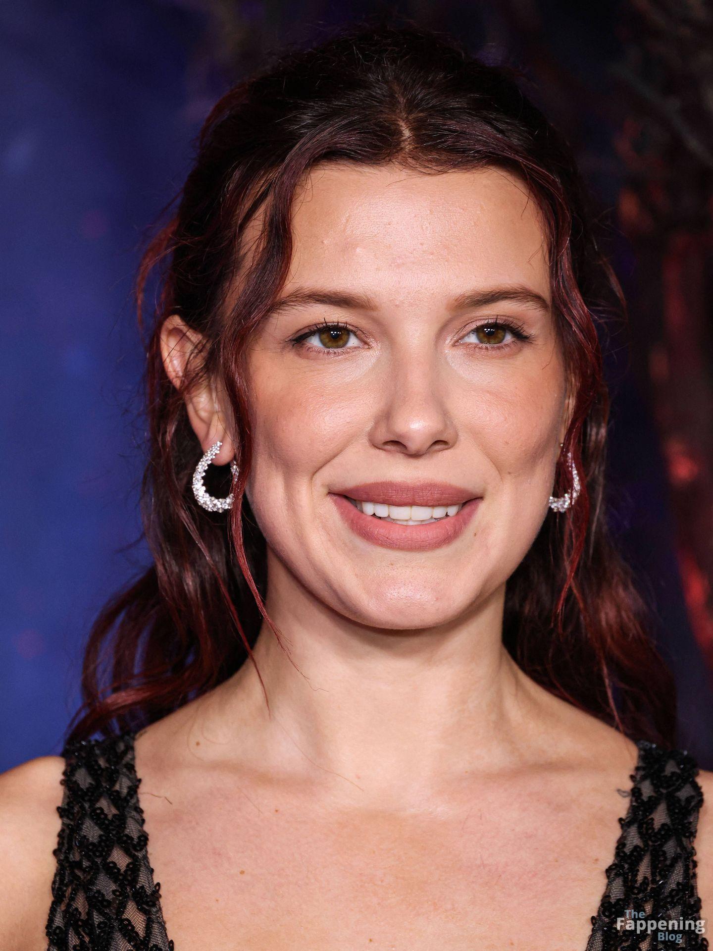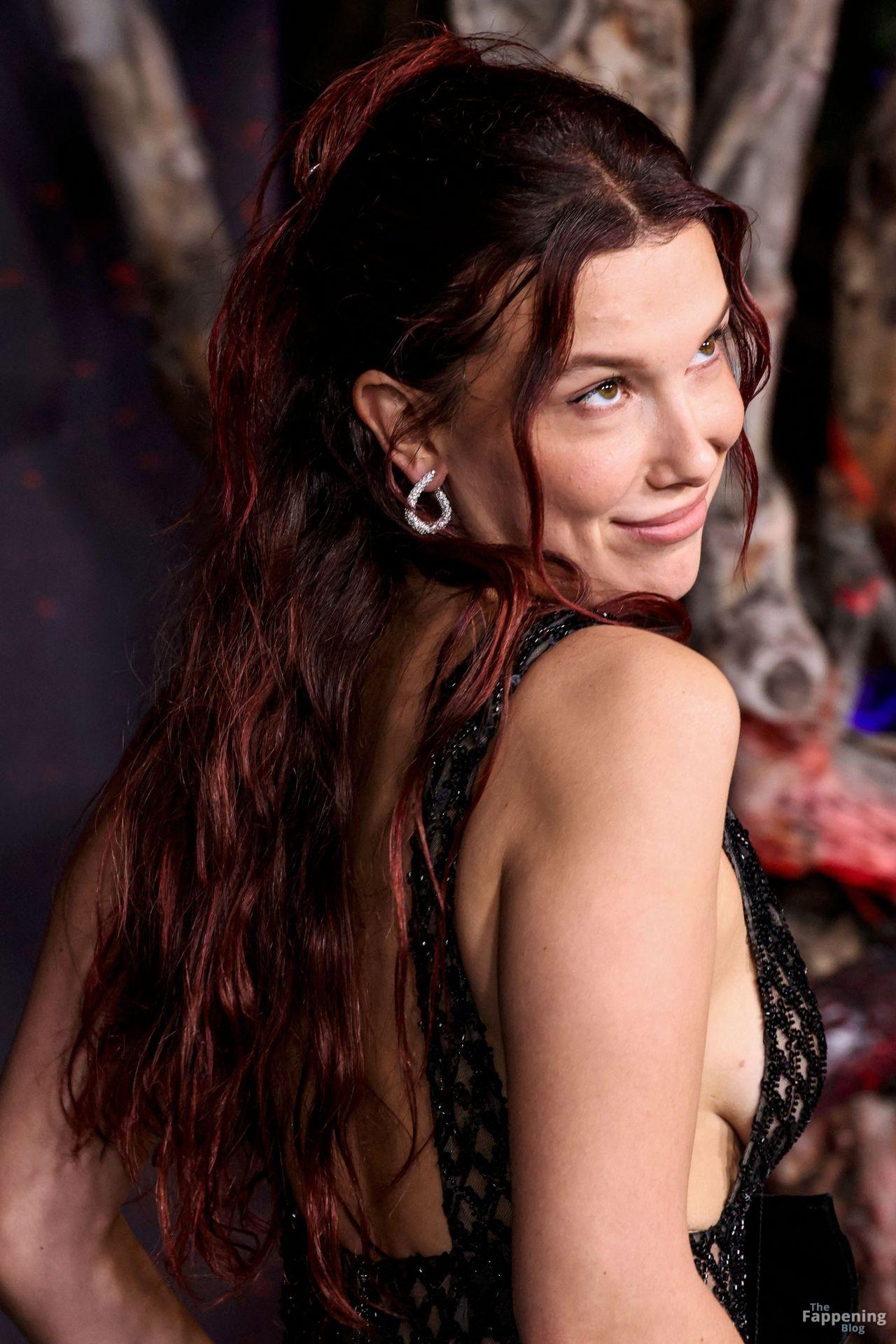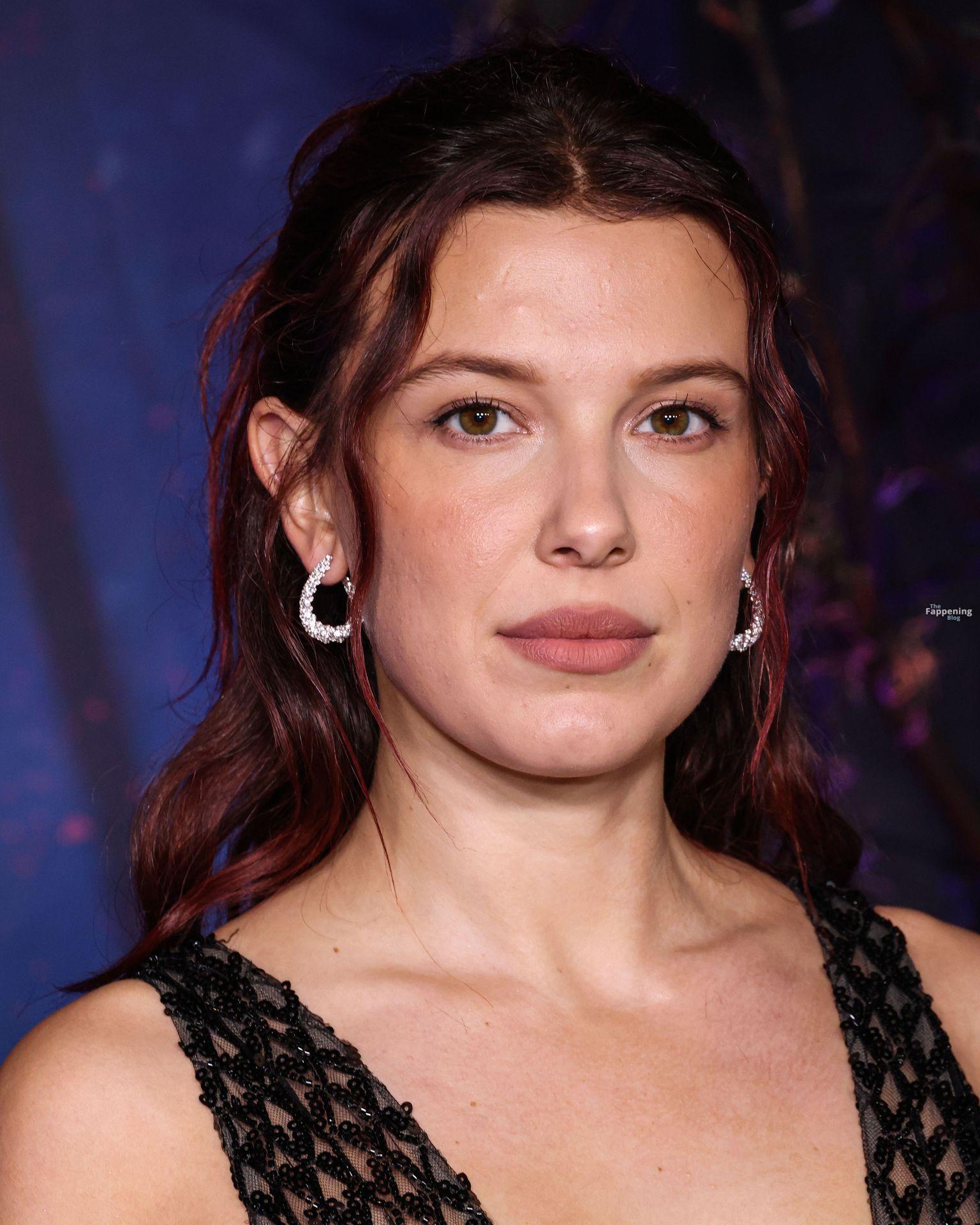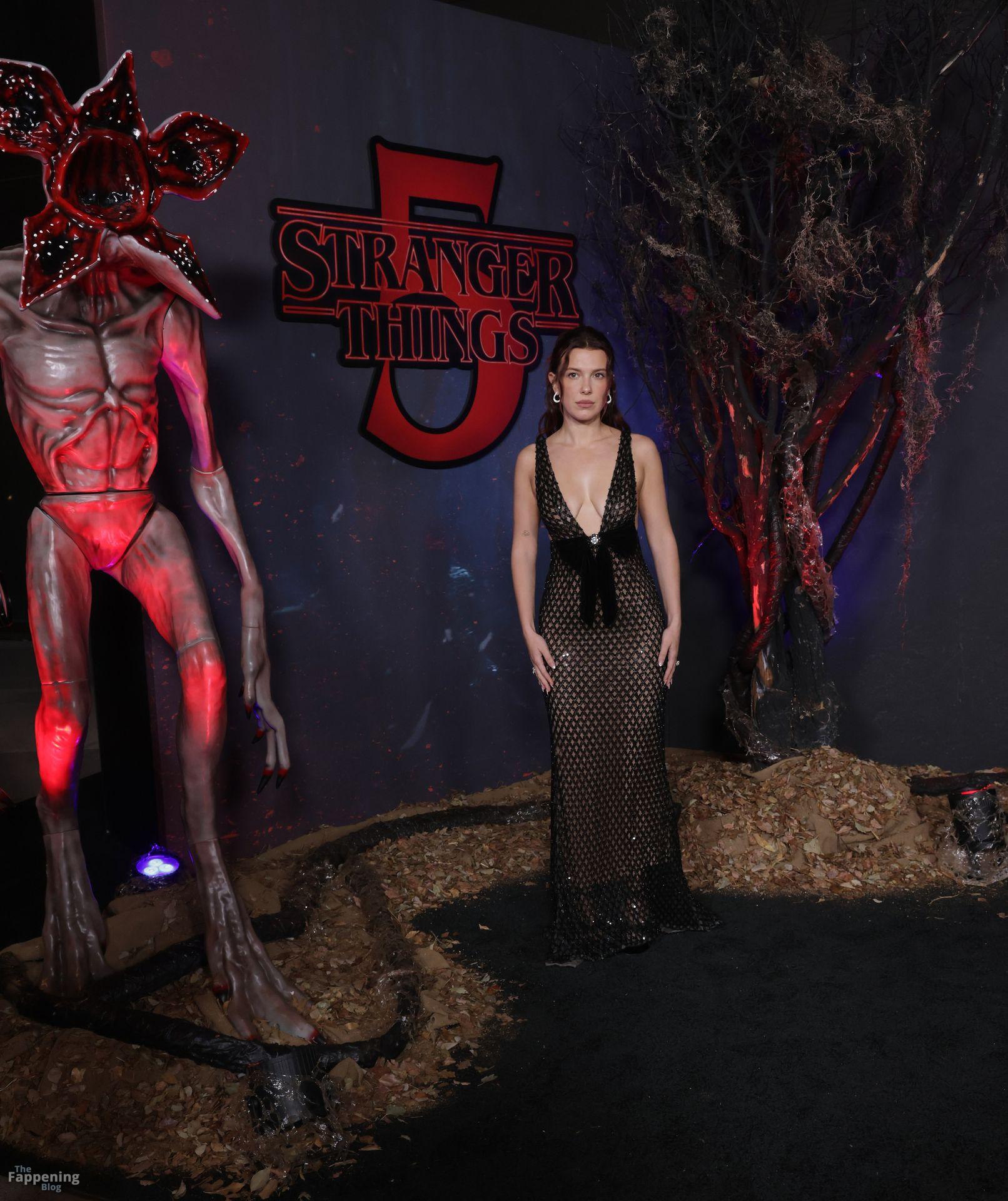 Millie Bobby Brown si è presentata all’evento FYC della quinta stagione di Stranger Things a Hollywood, indossando un abito nero trasparente con paillettes e una scollatura profonda che metteva in mostra il suo seno.