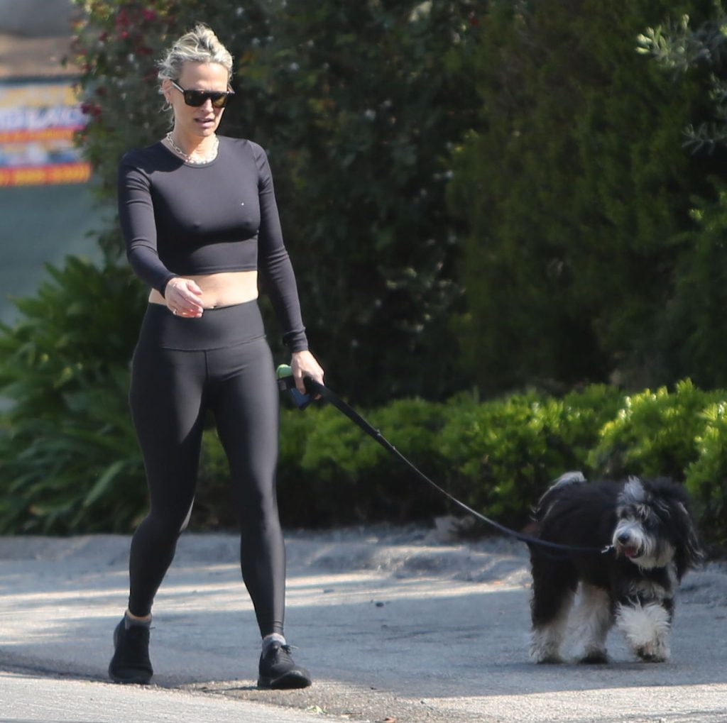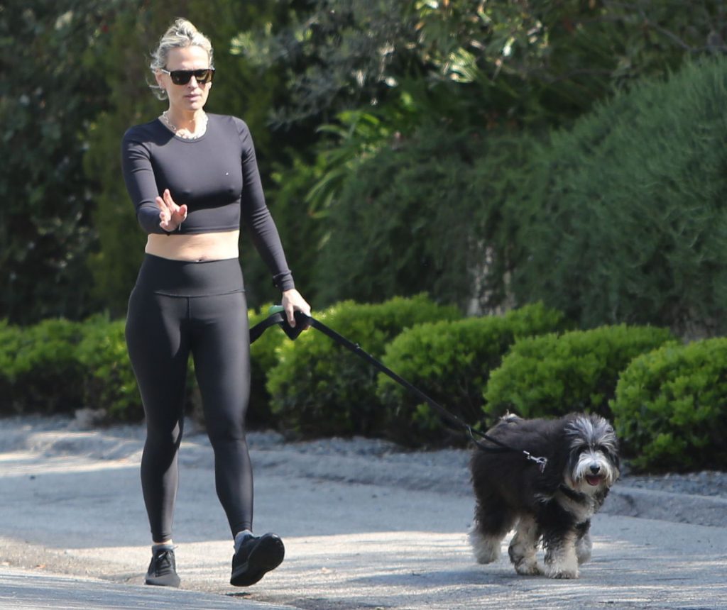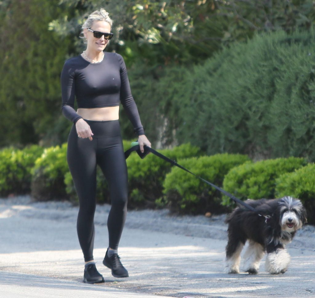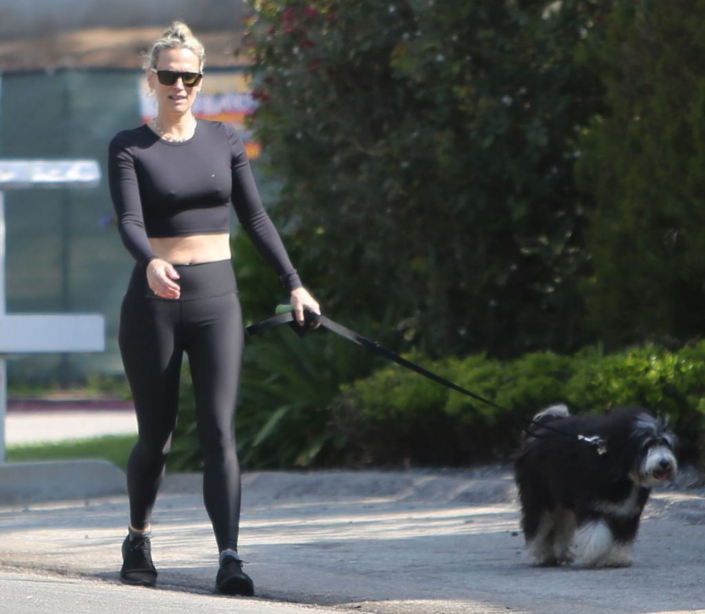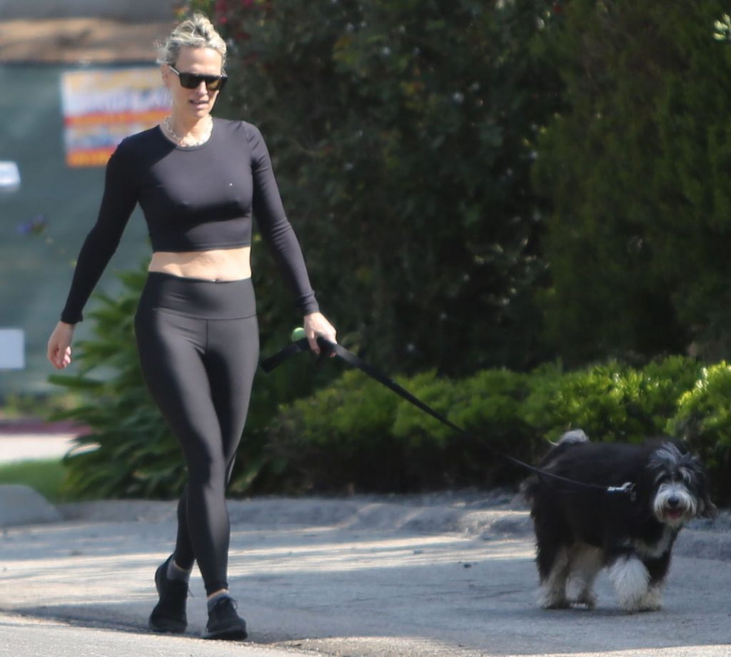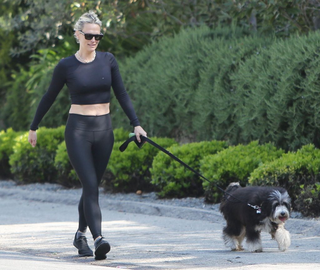 Model mom Molly Sims looks striking walking dog in Los Angeles amid Corona Virus lockdown stay at home order March 29, 2020.