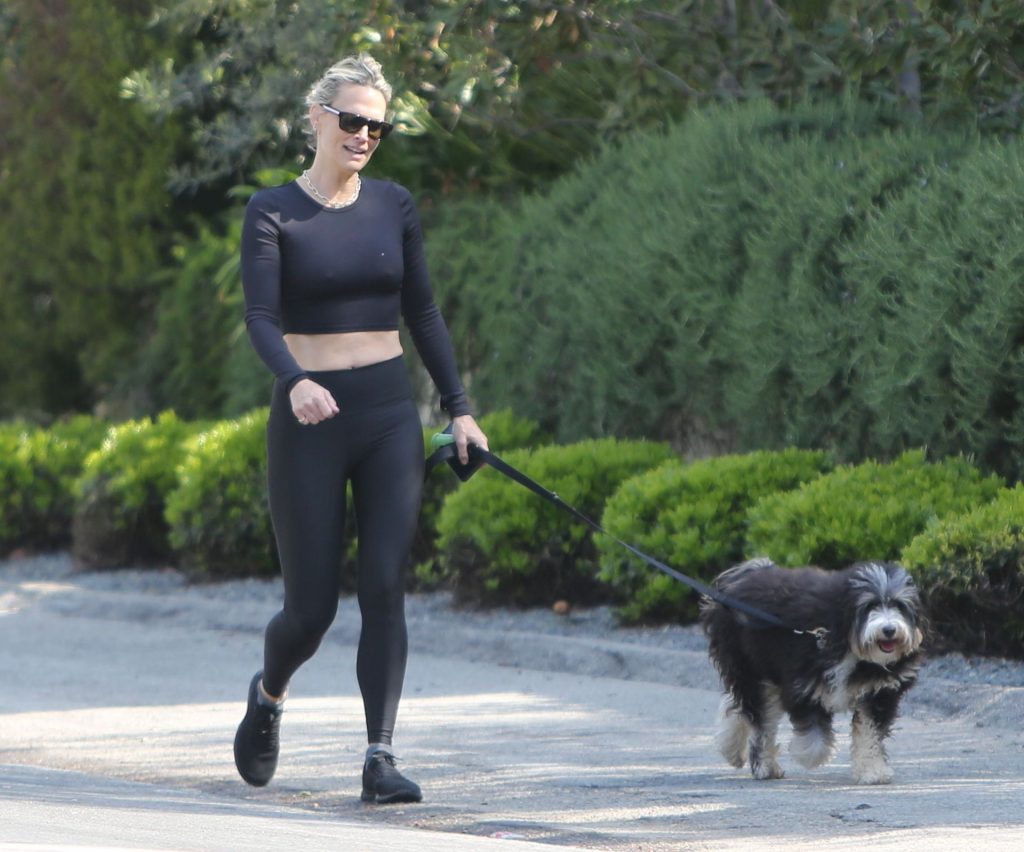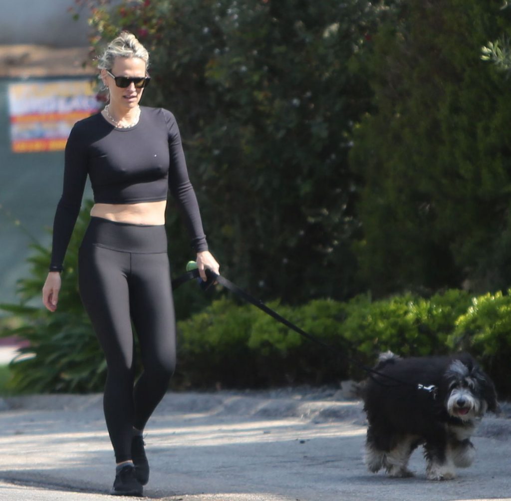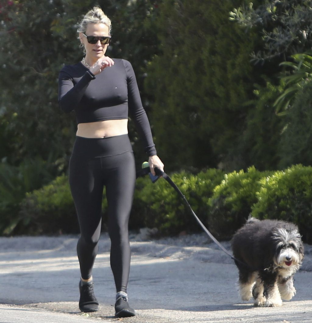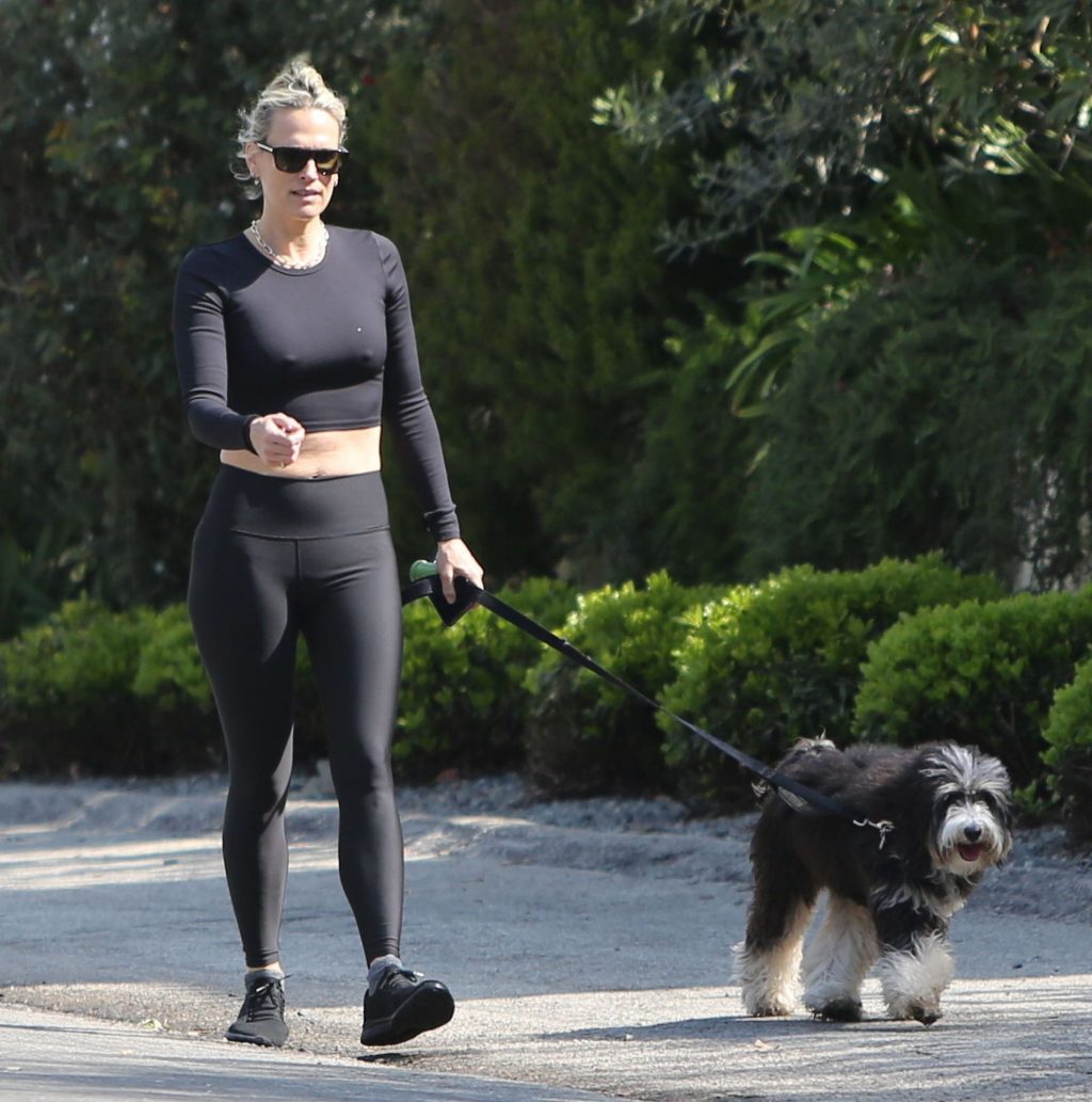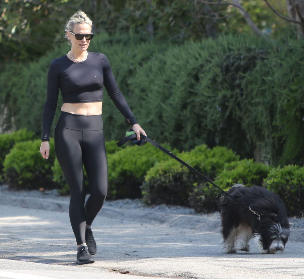 Model mom Molly Sims looks striking walking dog in Los Angeles amid Corona Virus lockdown stay at home order March 29, 2020.