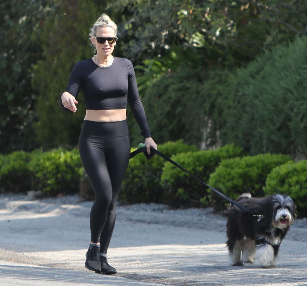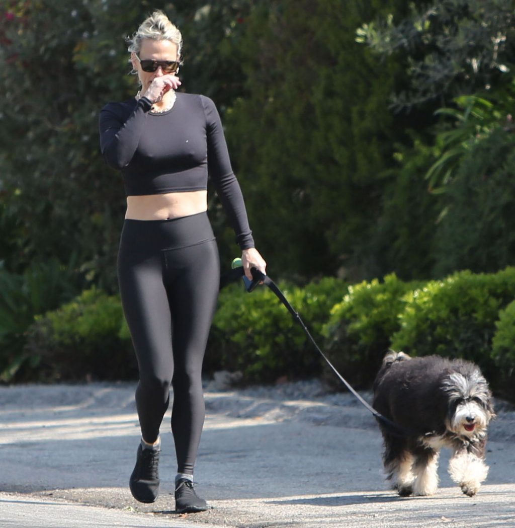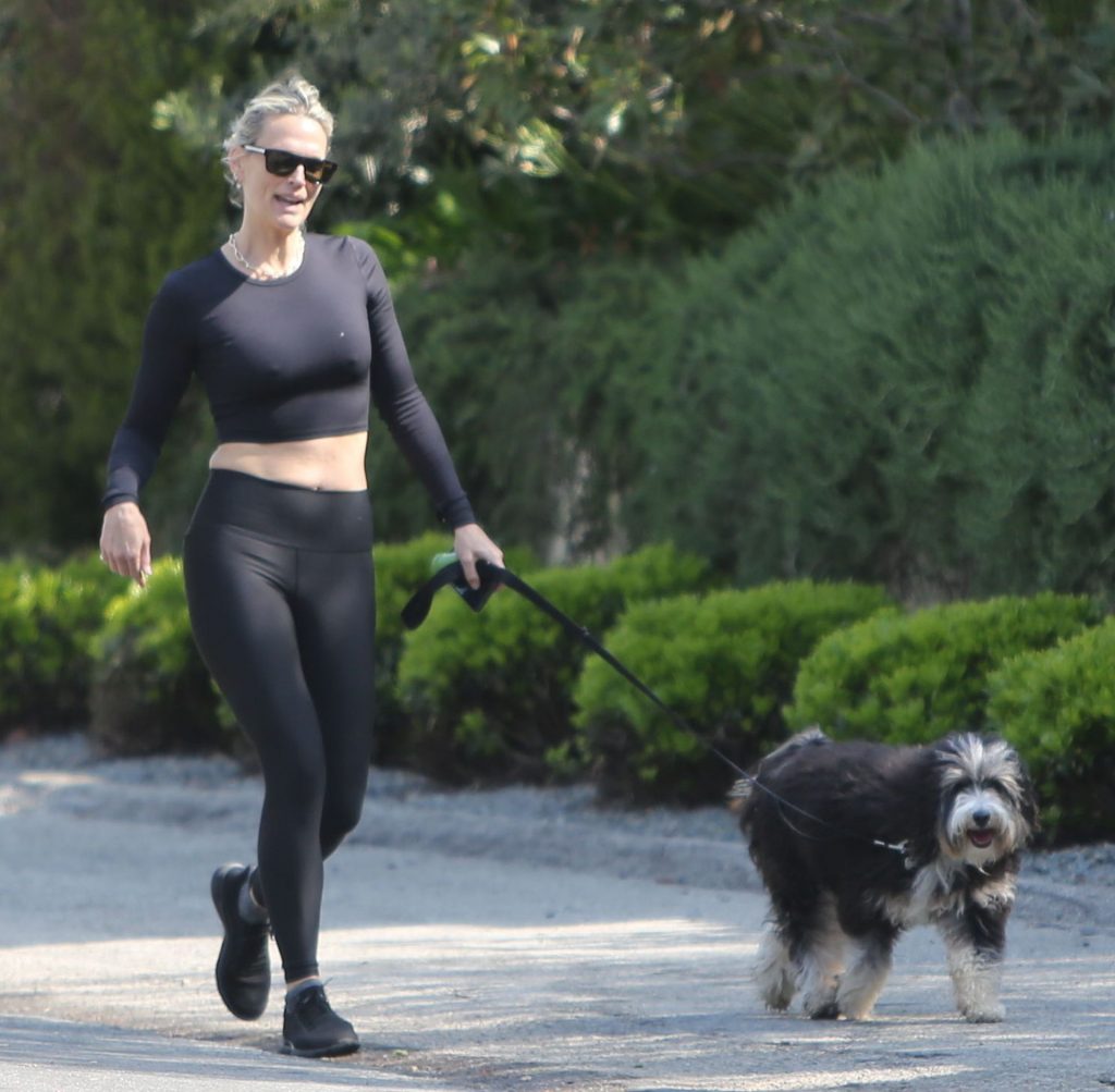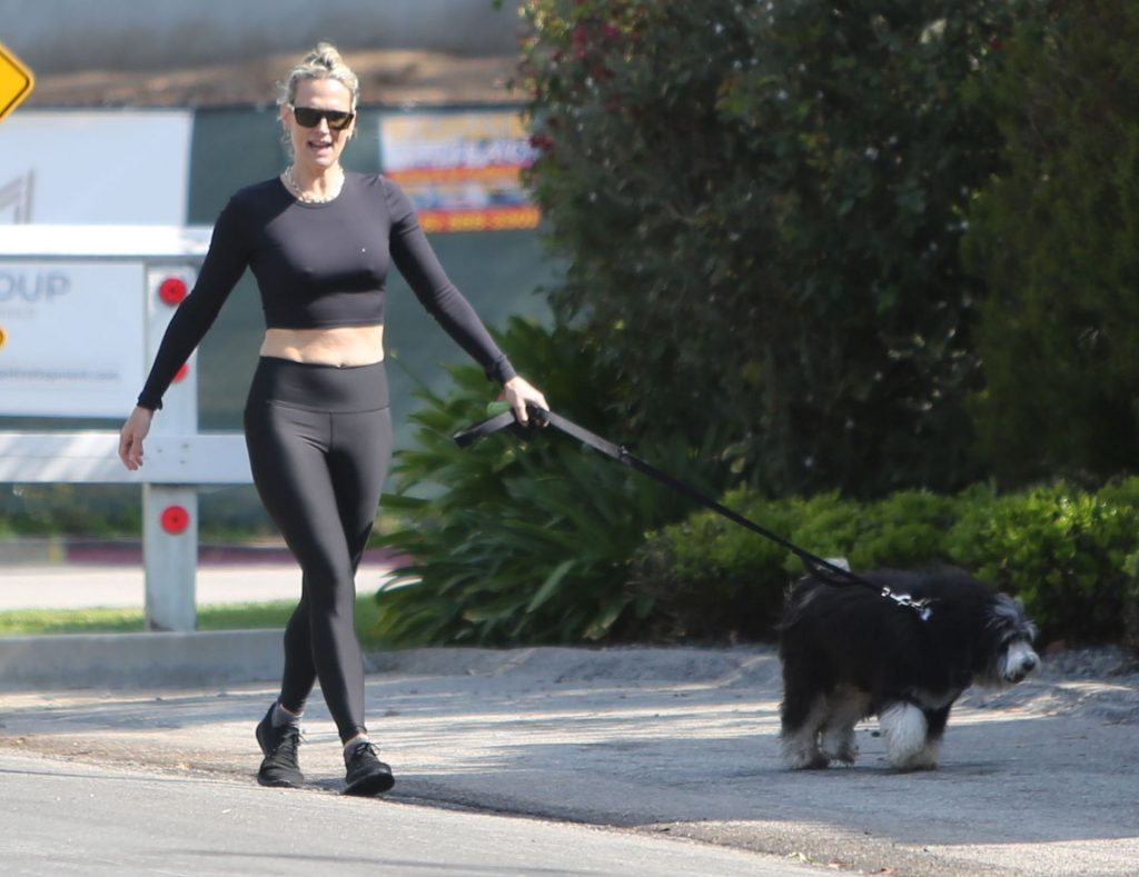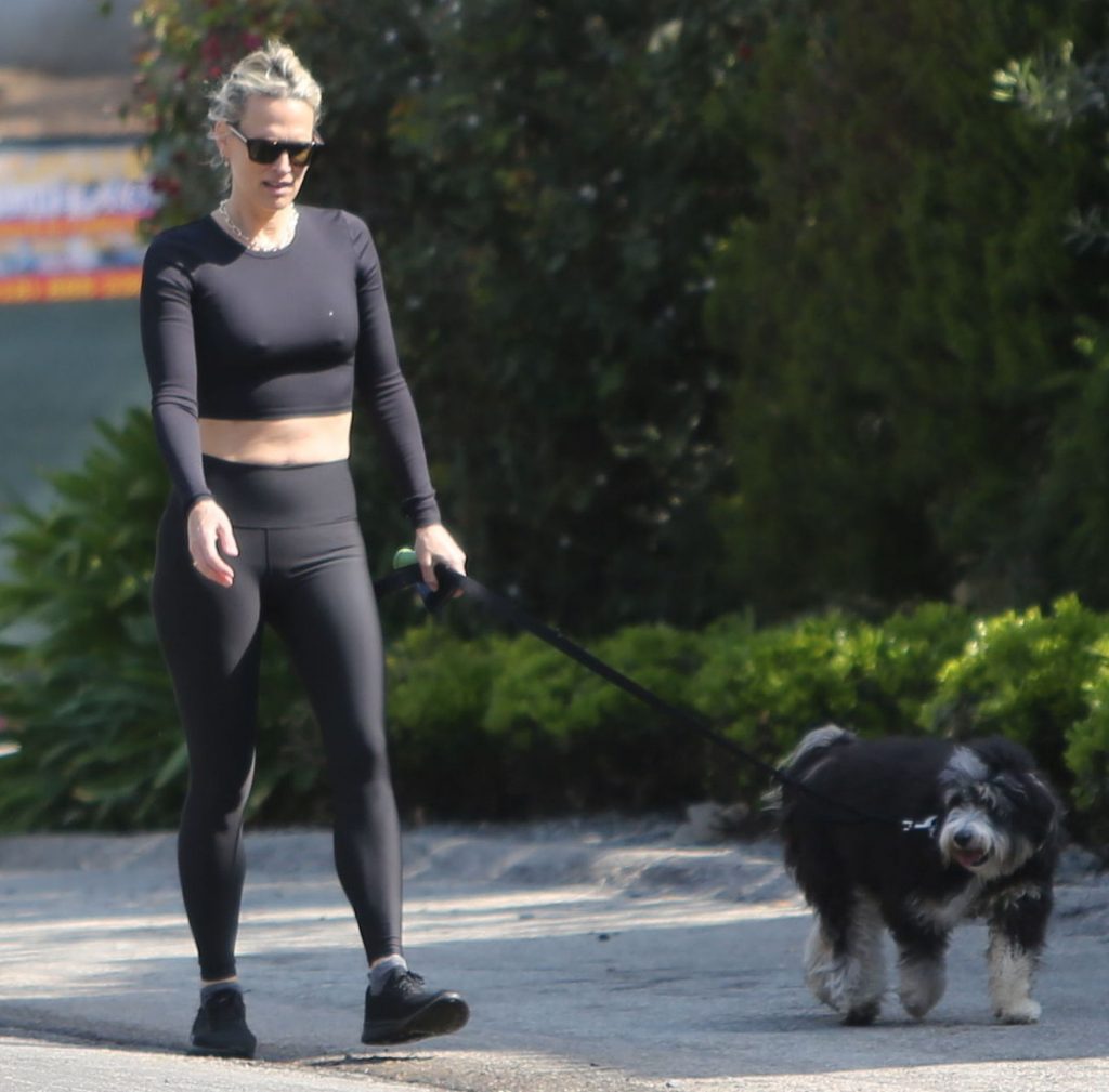 Model mom Molly Sims looks striking walking dog in Los Angeles amid Corona Virus lockdown stay at home order March 29, 2020.