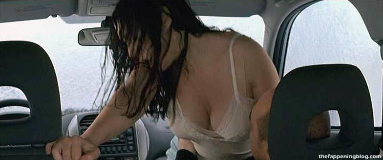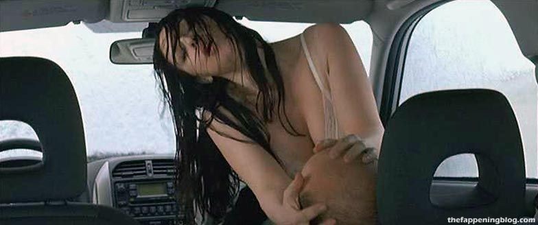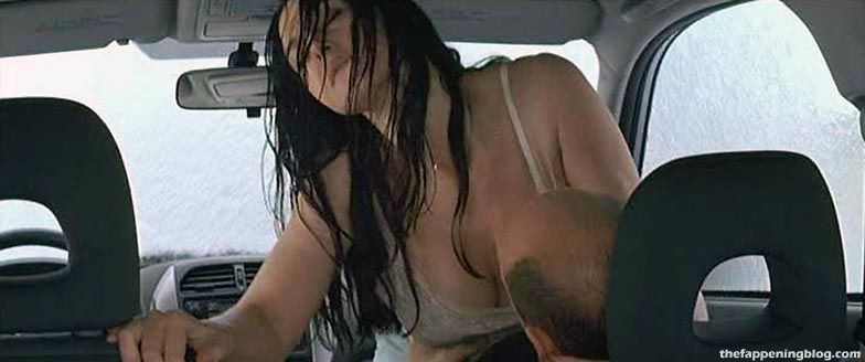 Monica Bellucci is seen having sex with a man in the front seat of a car after getting soaked in the rain while wearing a low-cut dress that reveals some attractive cleavage.