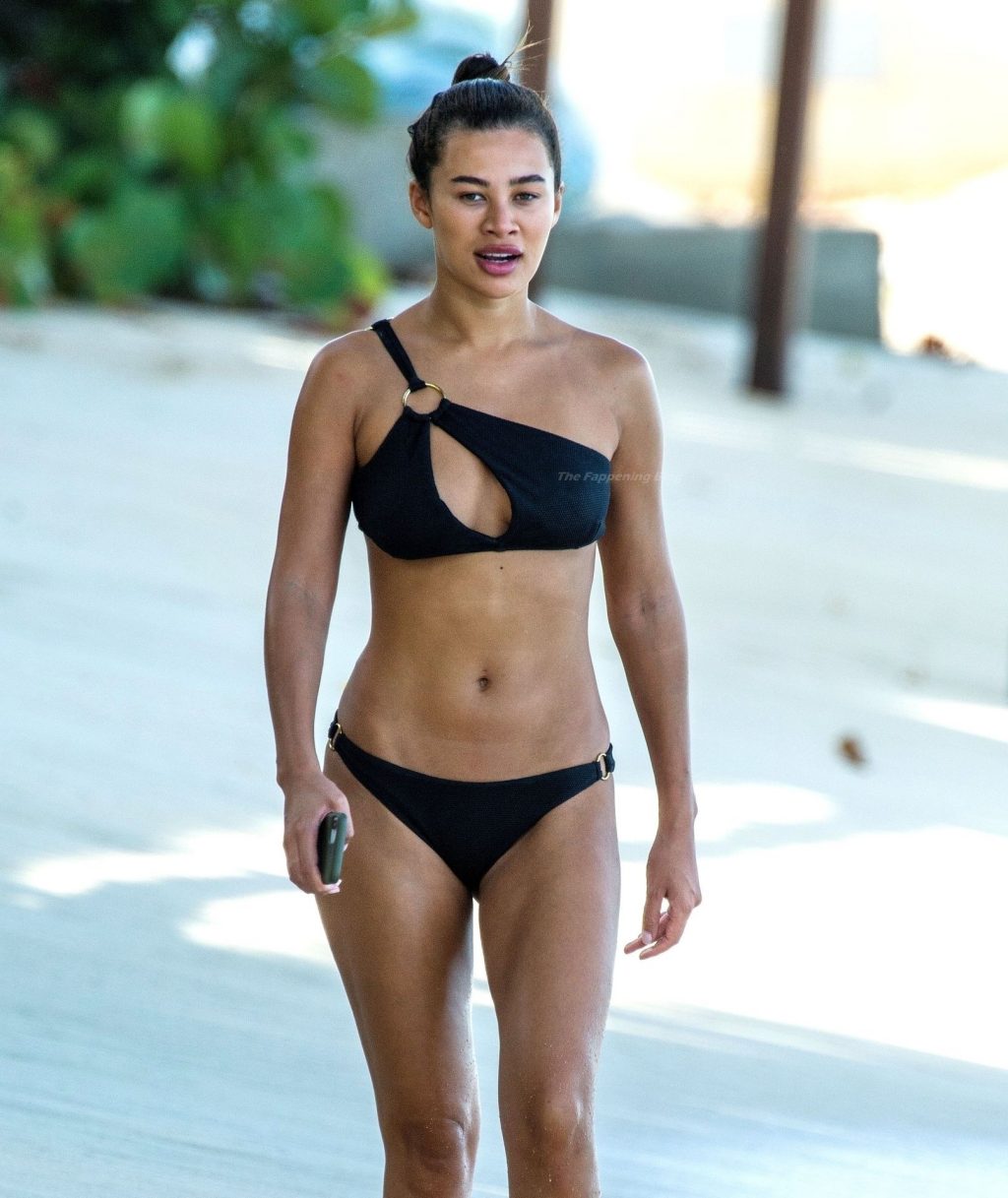 La sexy star di Love Island Montana Brown sfoggia il suo sedere sodo mentre cammina lungo le spiagge di sabbia dorata della parrocchia di St. James a Barbados (2021).