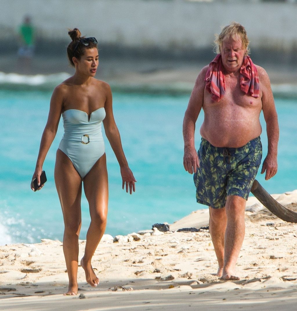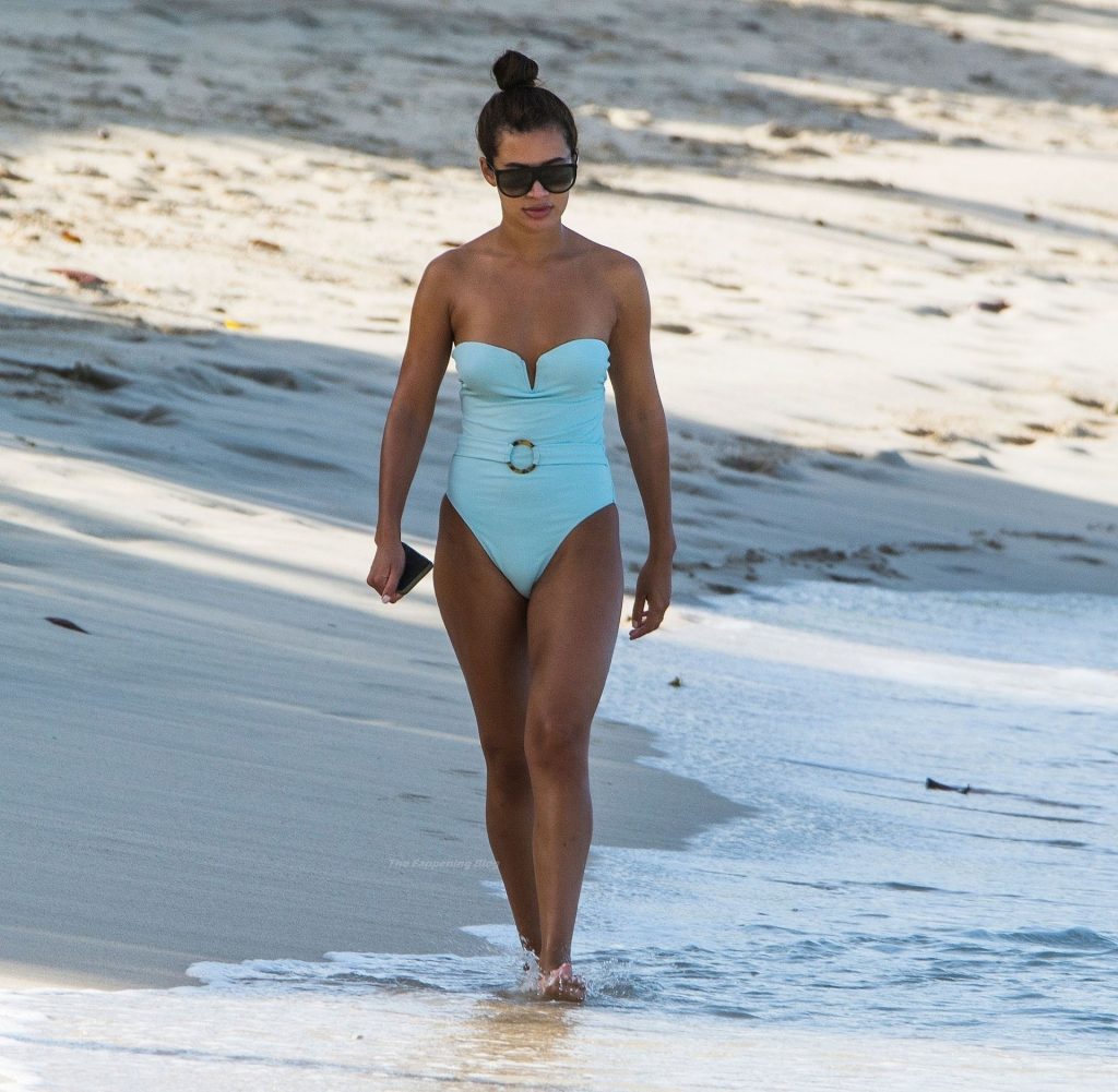 Indossando il suo succinto costume da bagno azzurro chiaro, la sexy star ha fatto una passeggiata lungo la spiaggia di sabbia dorata nella parrocchia di St. Peter.