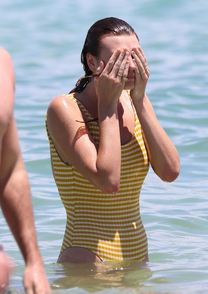 La modella australiana Montana Cox, 24 anni, mostra il suo corpo tonico in un costume da bagno giallo a Bondi Beach, 01/07/2018.