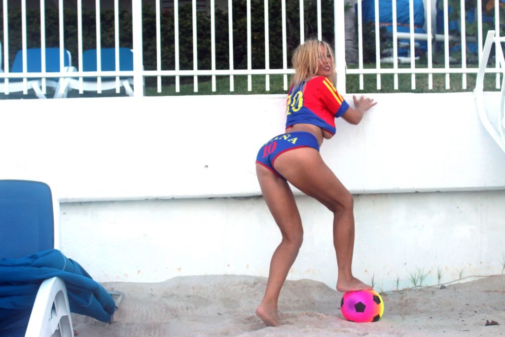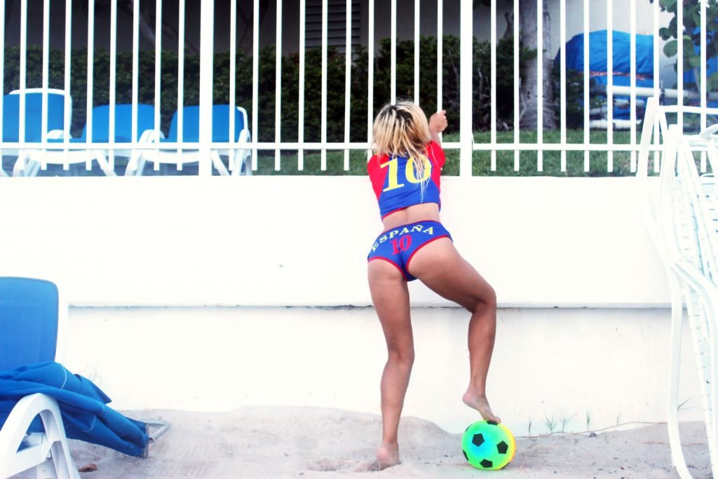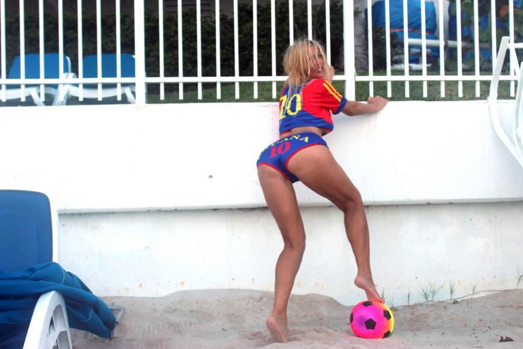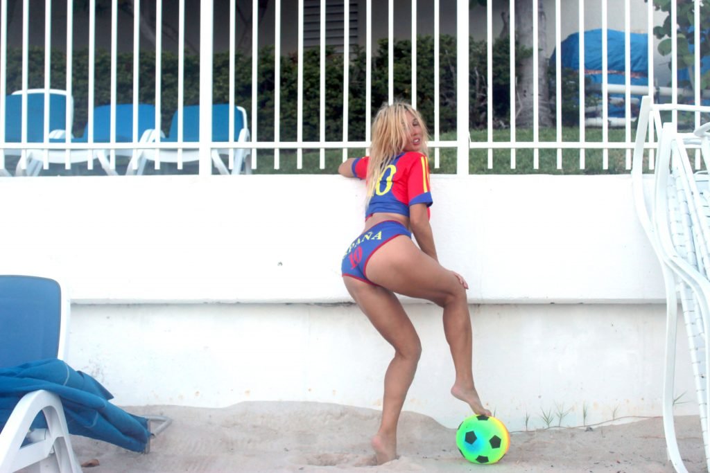 La cantante pop Nadeea Volianova celebra la vittoria del Barcellona nella partita di calcio Barcellona Madrid a Miami, 30/07/2017.