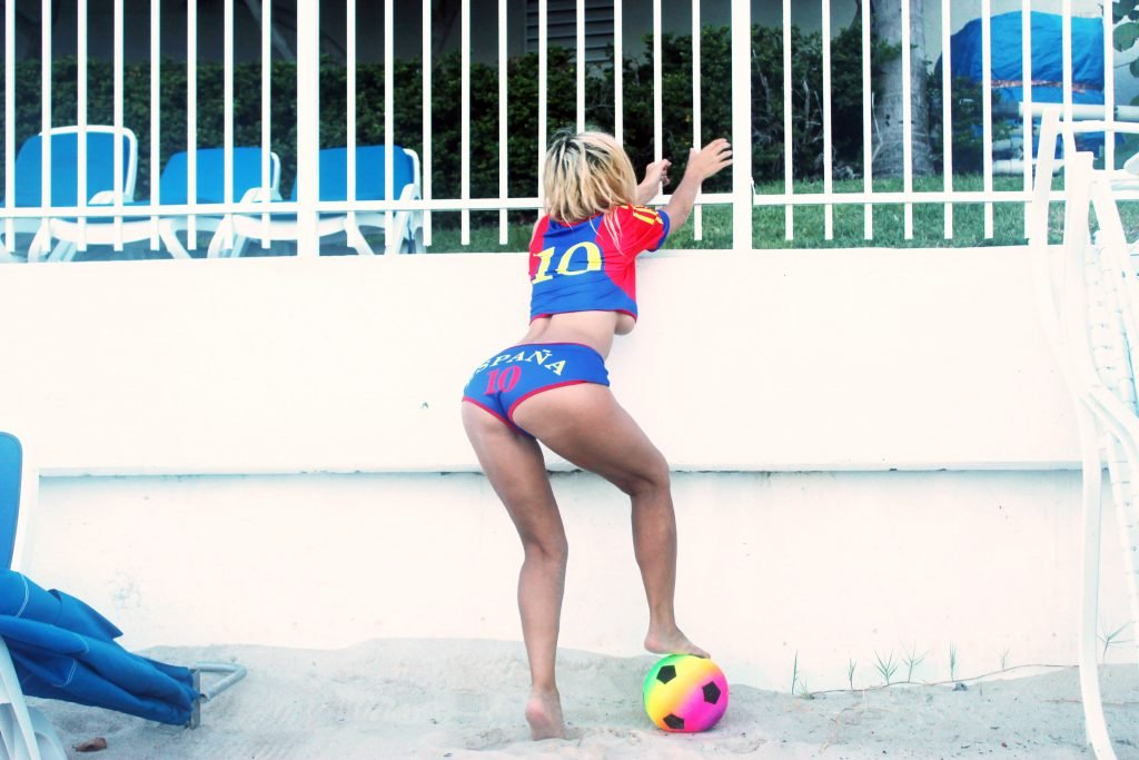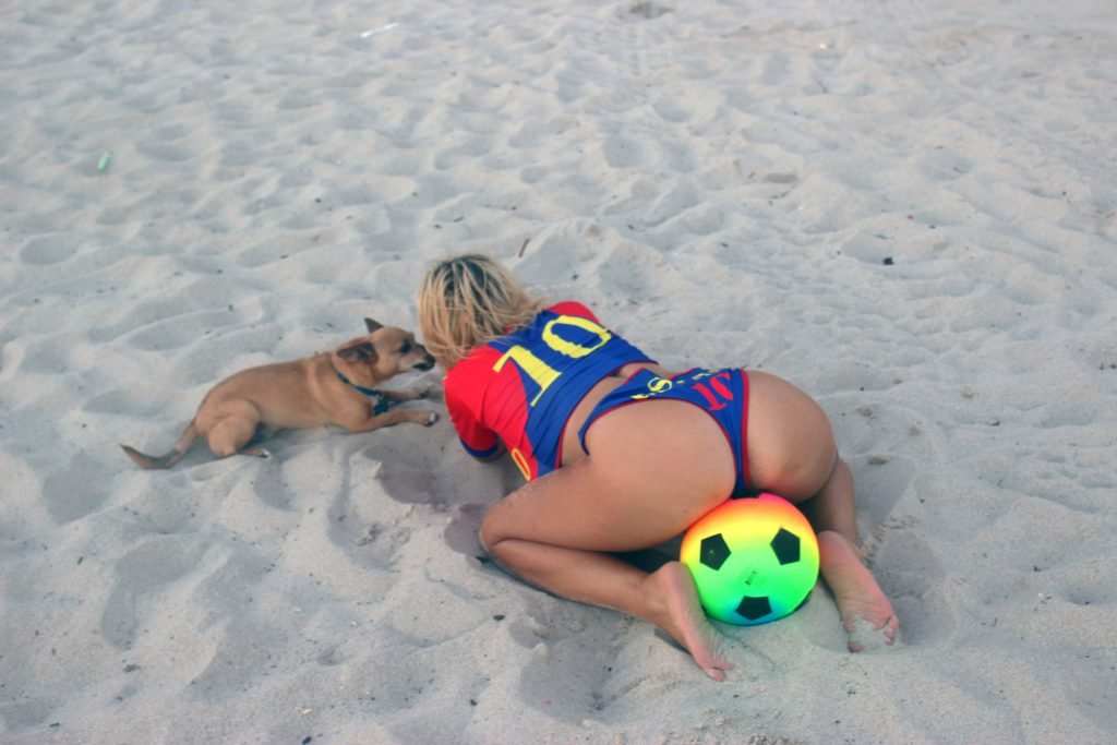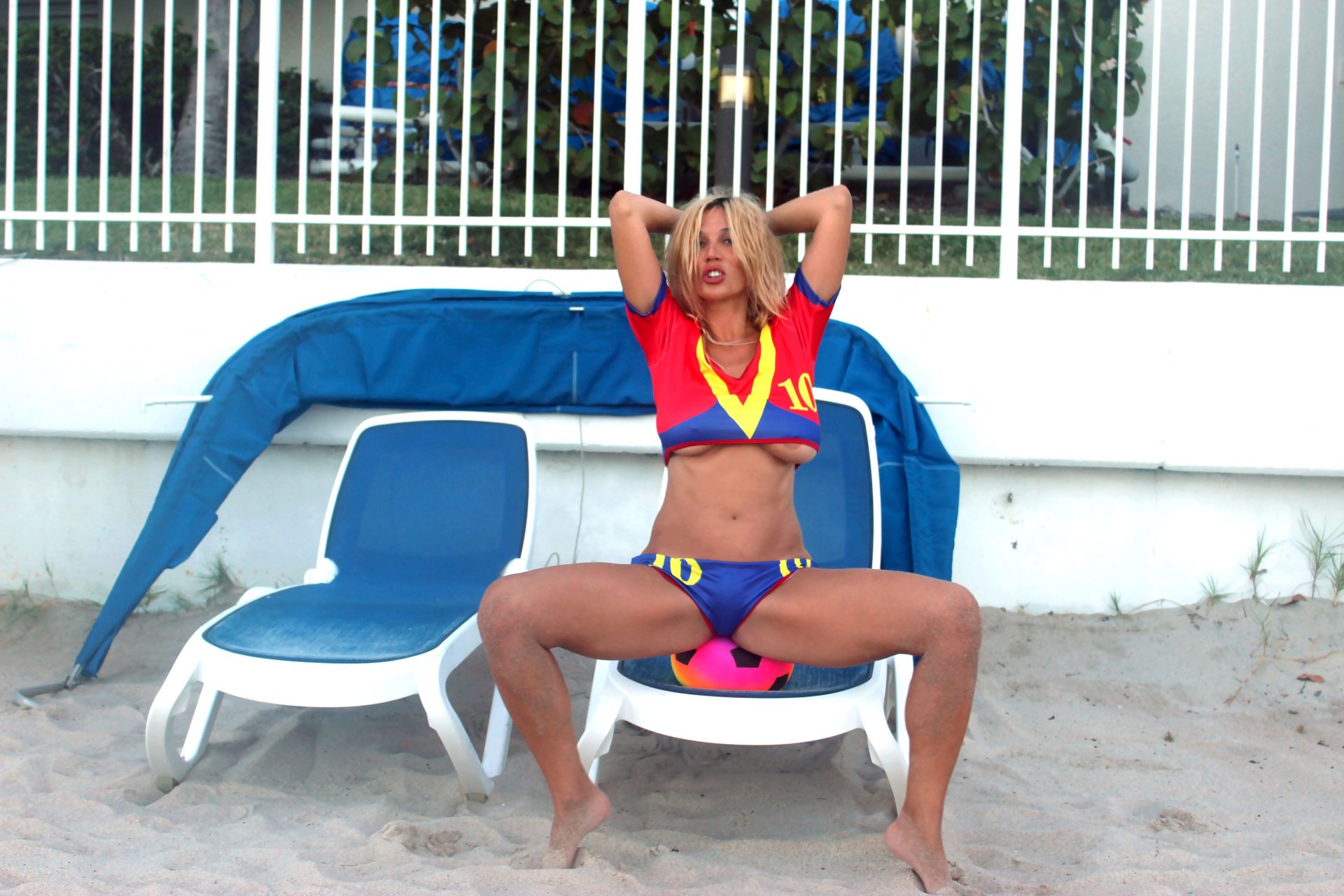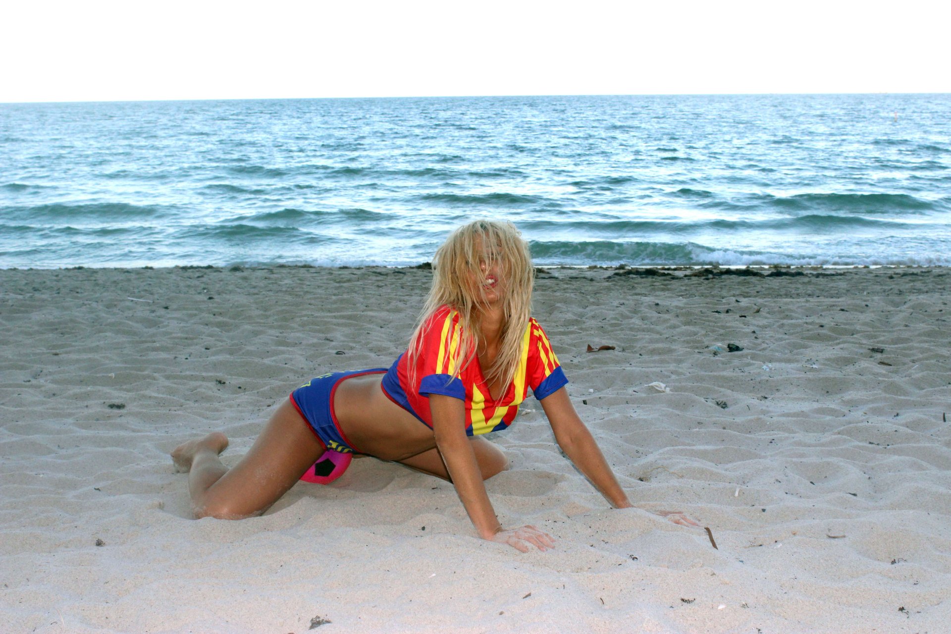 La cantante pop Nadeea Volianova celebra la vittoria del Barcellona nella partita di calcio Barcellona Madrid a Miami, 30/07/2017.