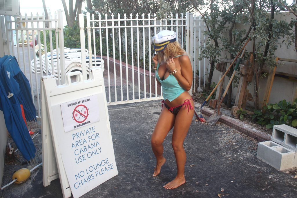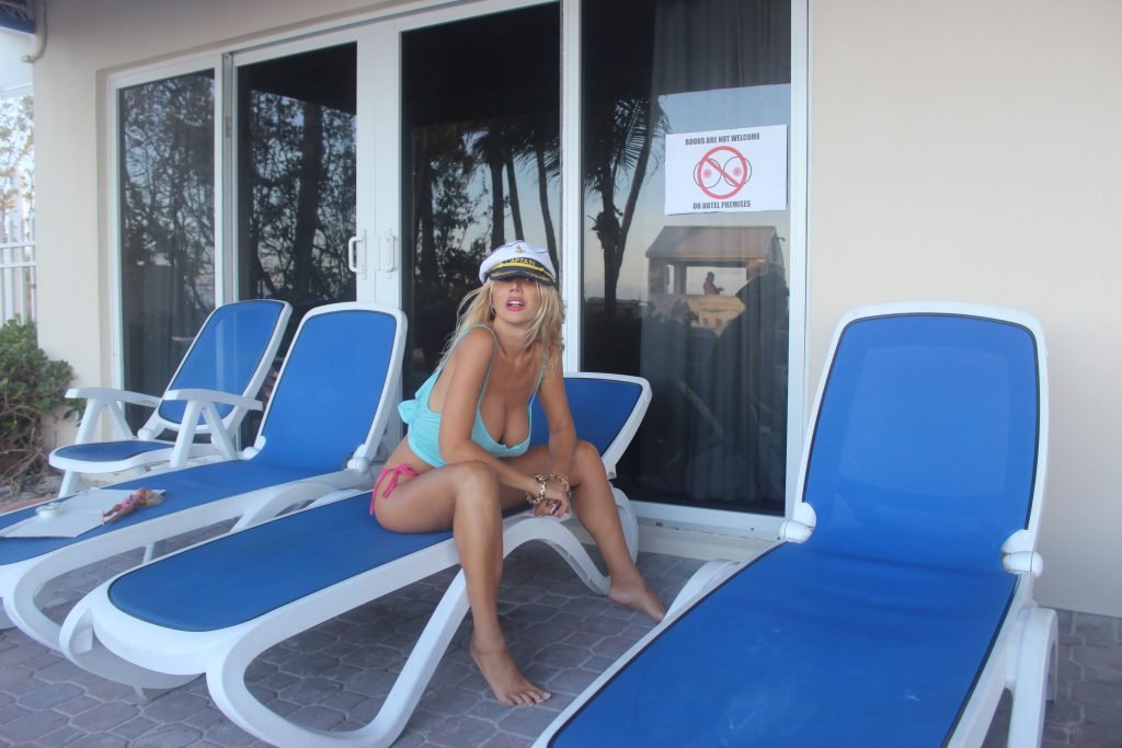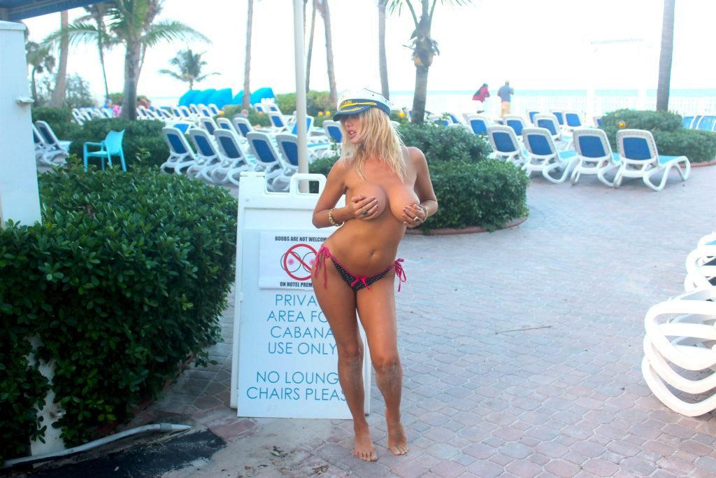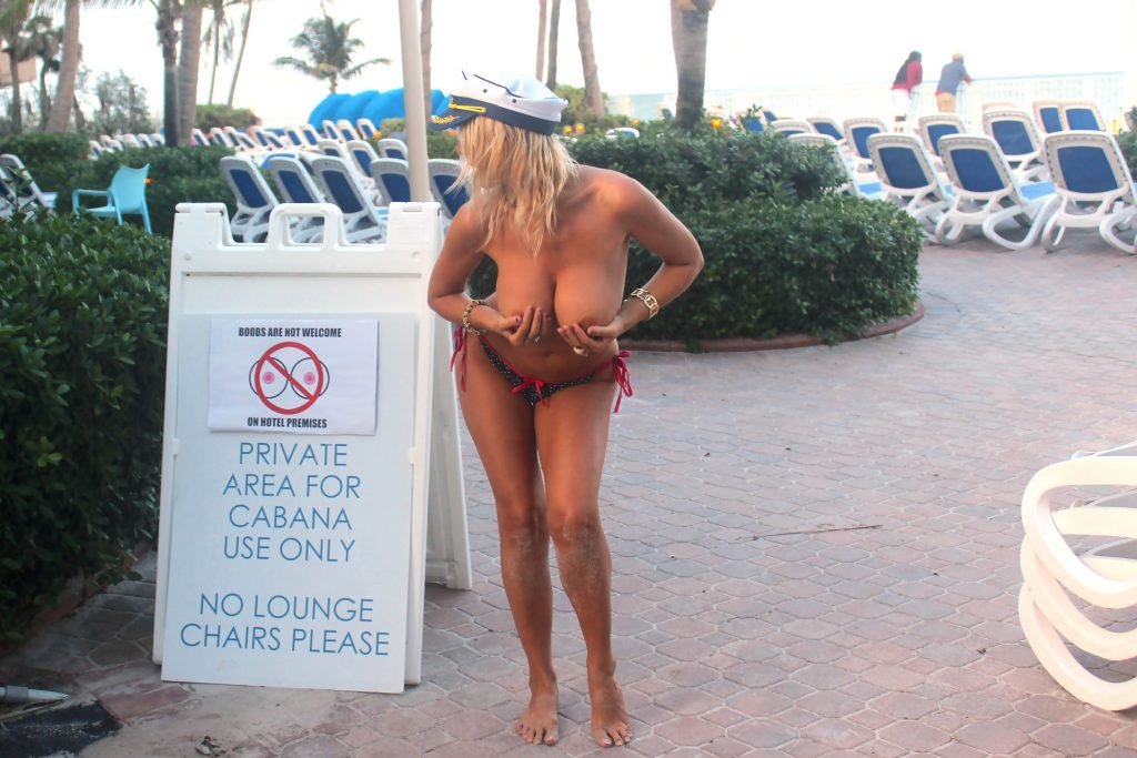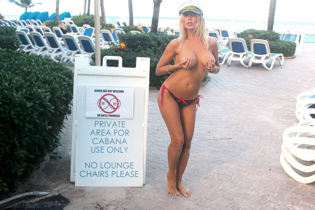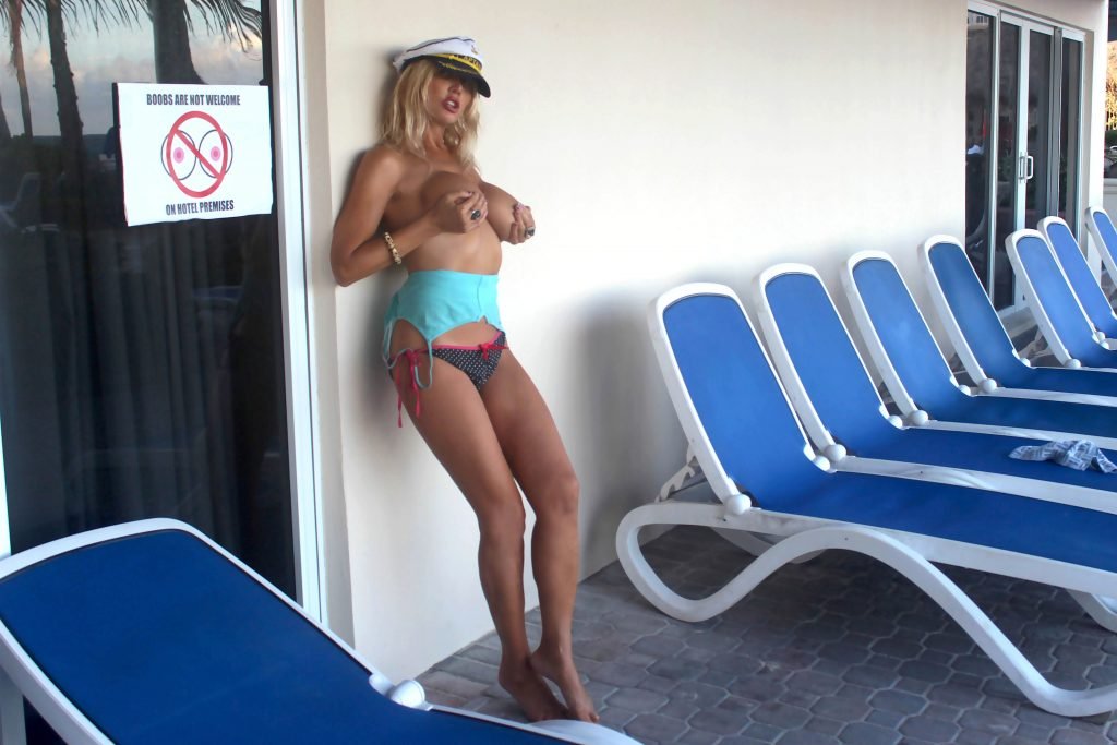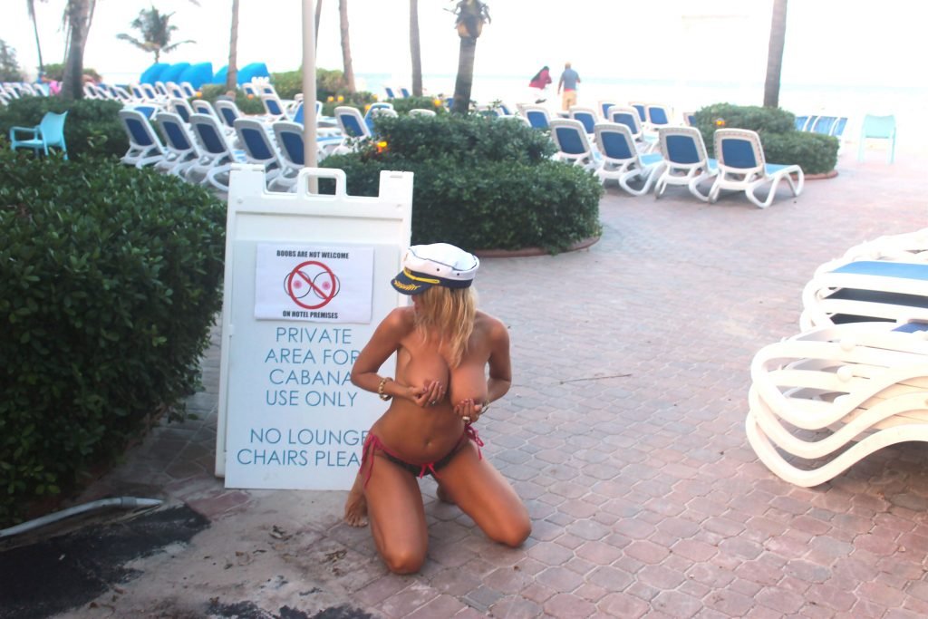 La cantante pop russa Nadeea Volianova posa con un cartello falso “Vietato il seno” all’hotel di Miami, 24/10/2017, dove è stata affrontata in video dal personale, che le ha detto di fare il check-out e andare altrove perché non indossava il reggiseno sotto la maglietta.