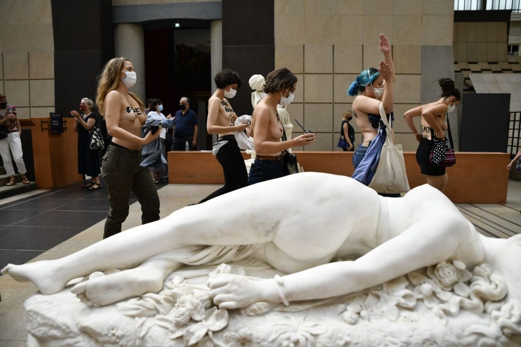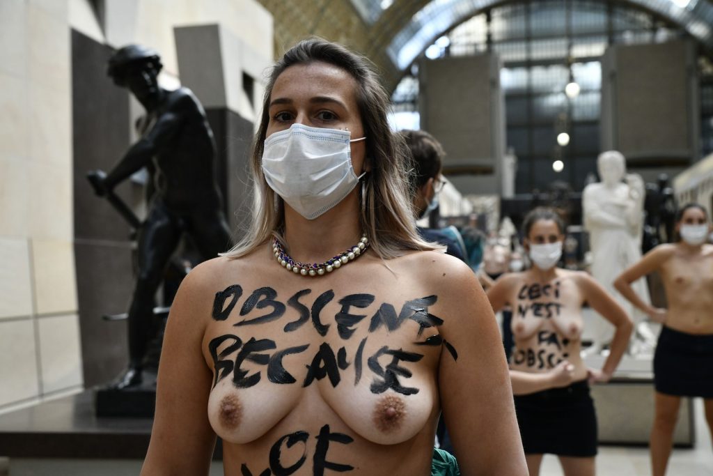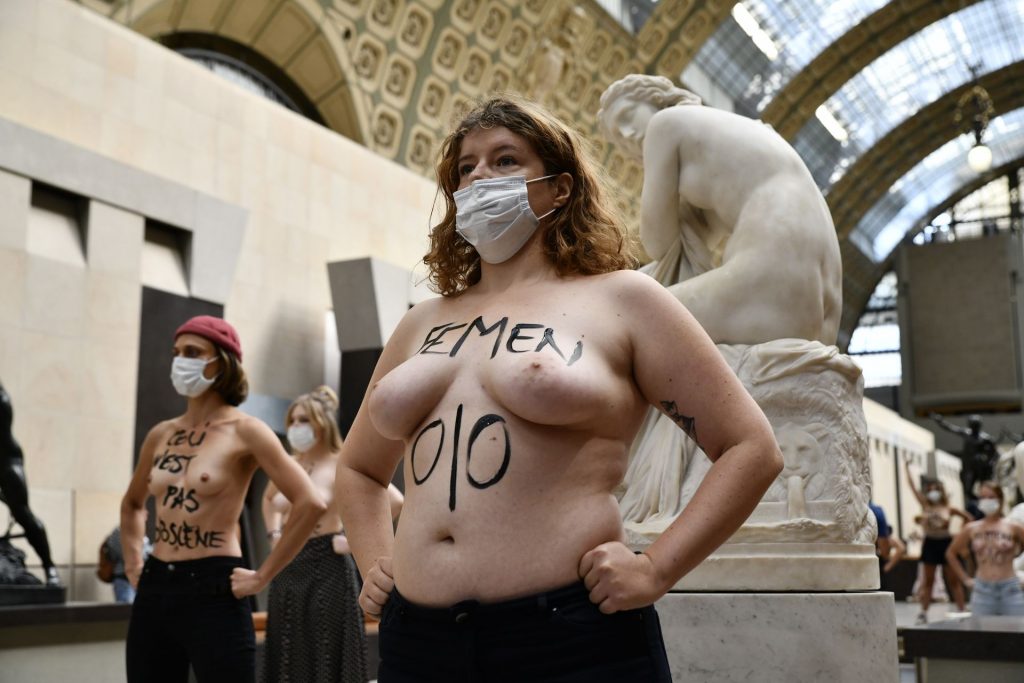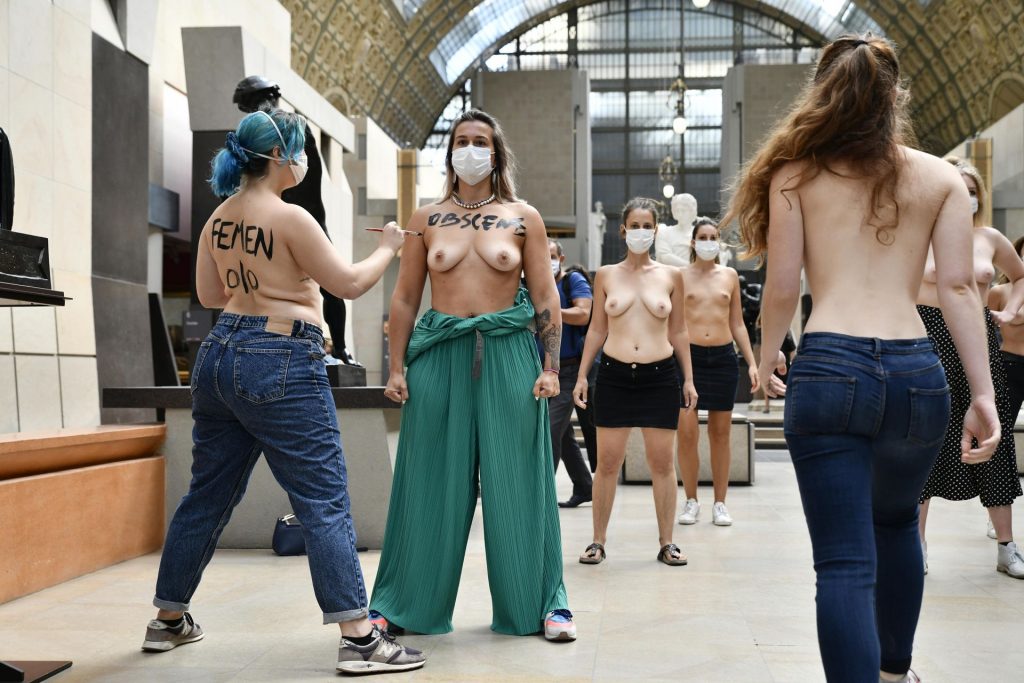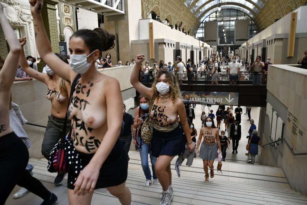 FEMEN è in azione al Musee d’Orsay a seguito del divieto di ingresso a una giovane donna a causa del suo décolleté troppo profondo per il gusto della sicurezza – Parigi, Francia, 13/09/2020.