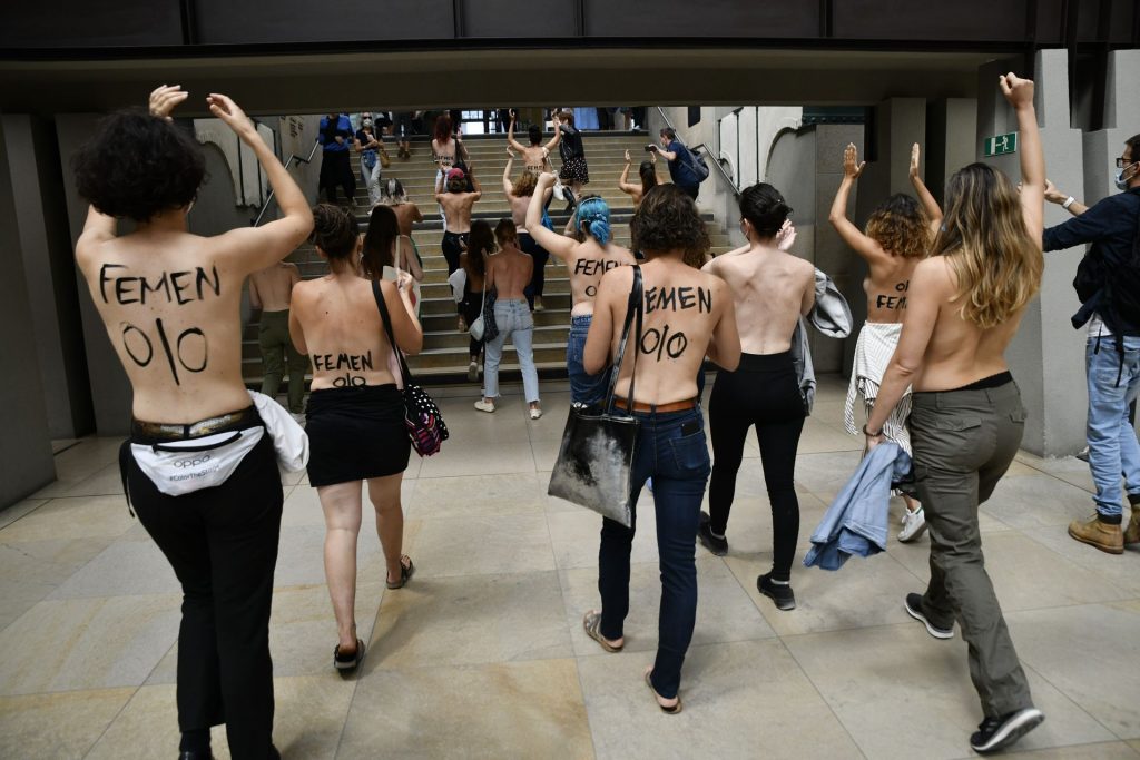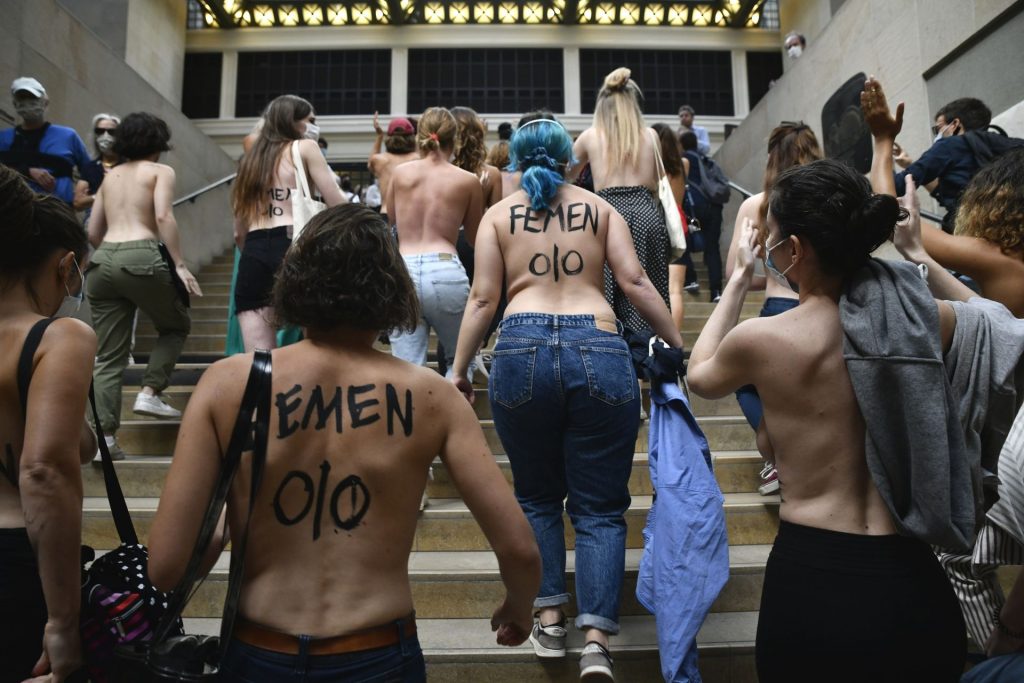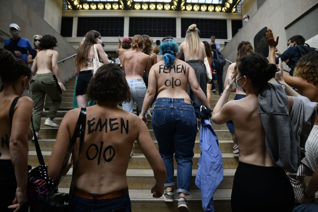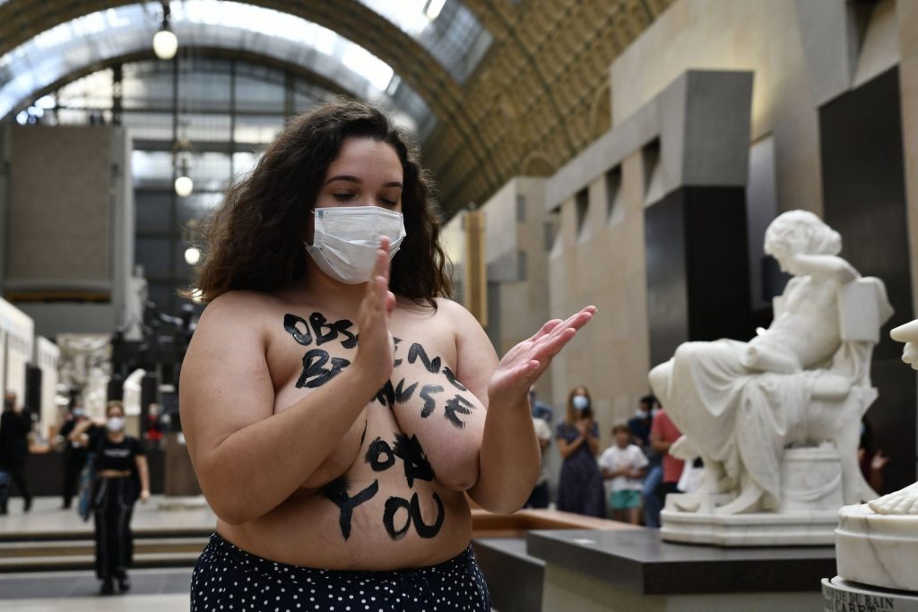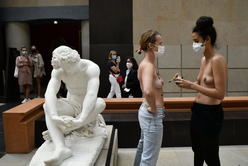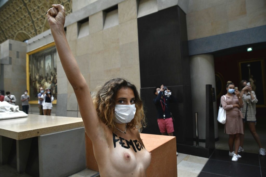 FEMEN è in azione al Musee d’Orsay a seguito del divieto di ingresso a una giovane donna a causa del suo décolleté troppo profondo per il gusto della sicurezza – Parigi, Francia, 13/09/2020.