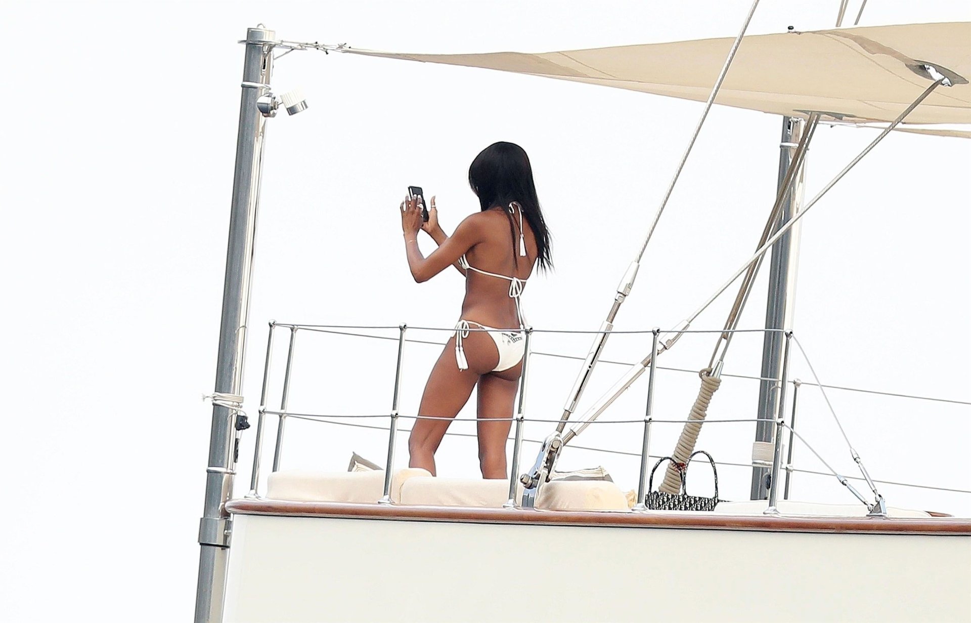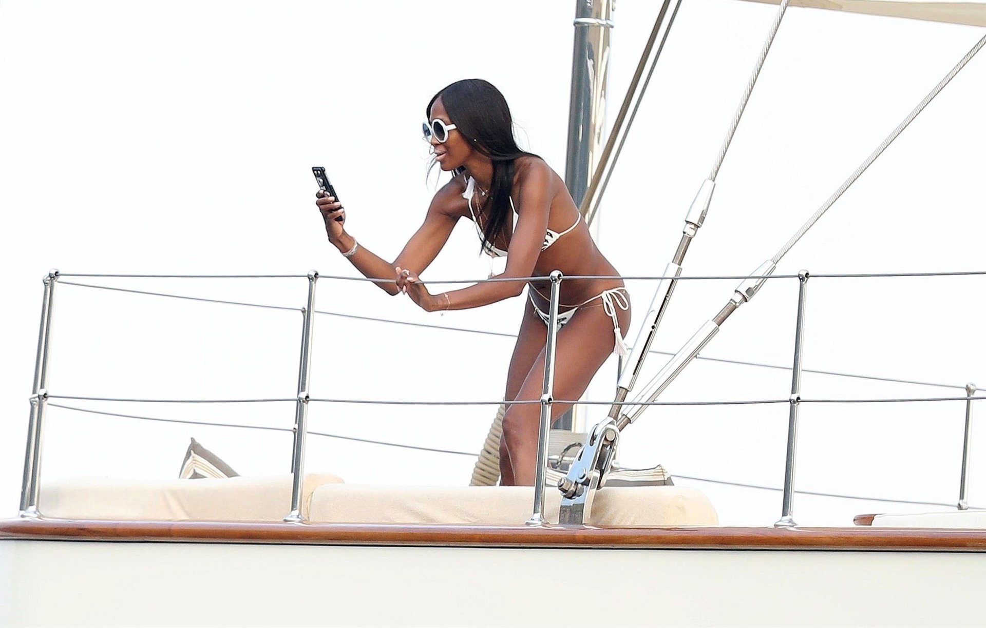La supermodella Naomi Campbell stava navigando a Saint Tropez, nel Sud della Francia, a bordo di uno yacht di lusso, 20/08/2018. Naomi mostrava la sua figura snella indossando un bikini bianco con occhiali da sole rotondi bianchi. La supermodella di 48 anni è stata fotografata mentre controllava il suo telefono e scattava selfie rilassandosi sullo yacht con il mago David Blaine.