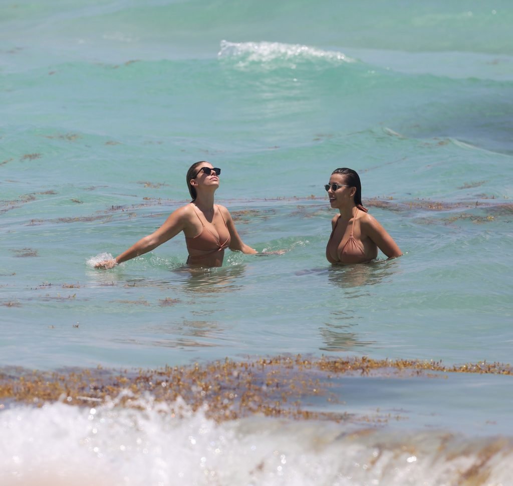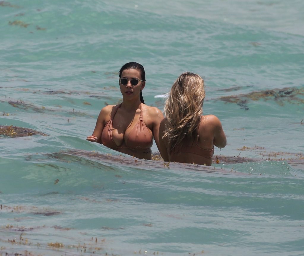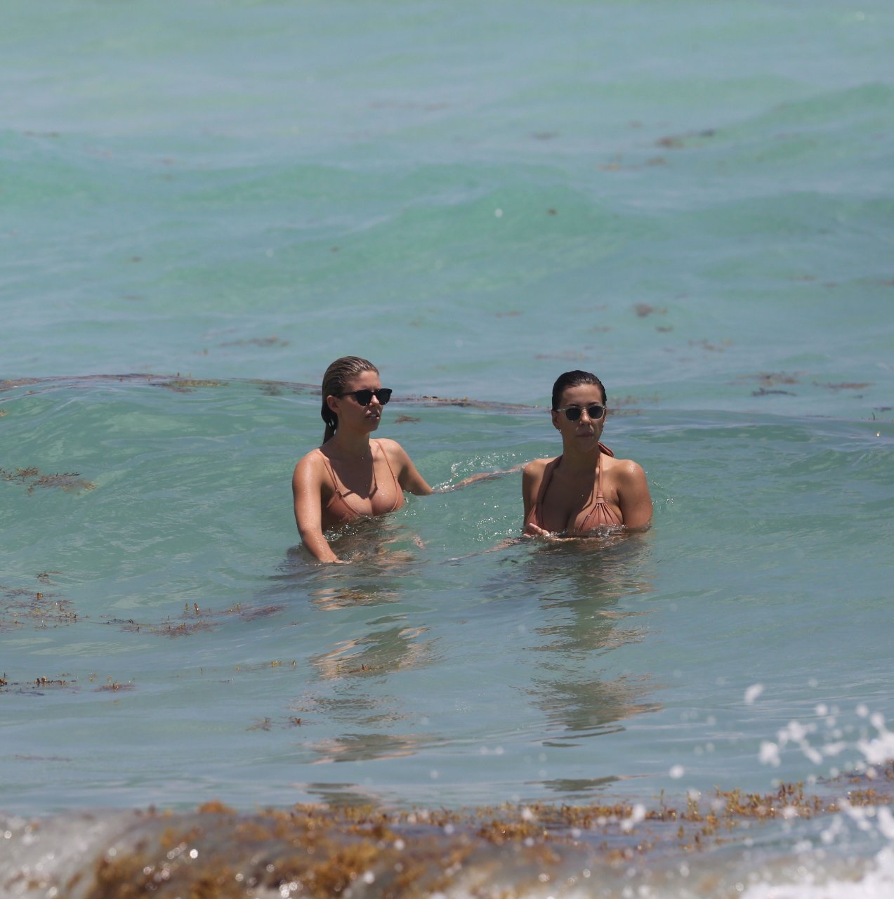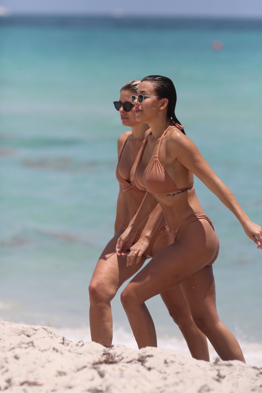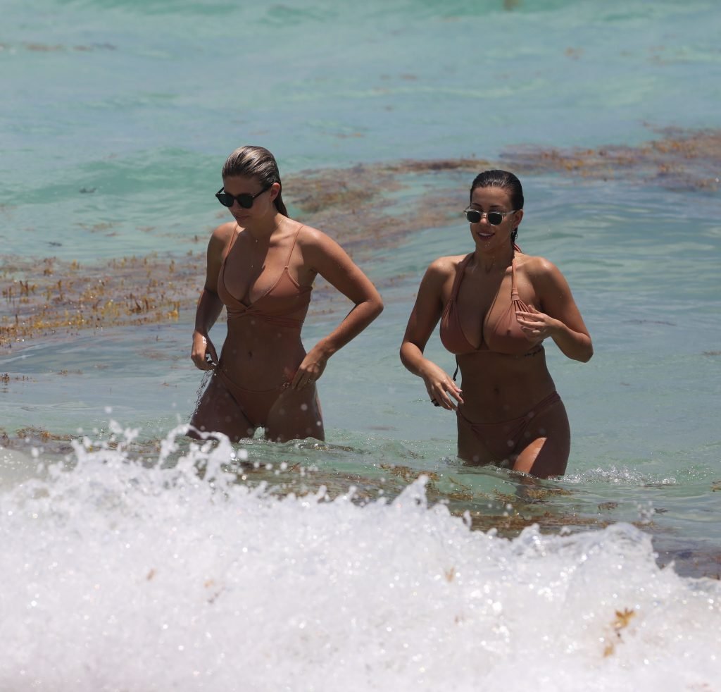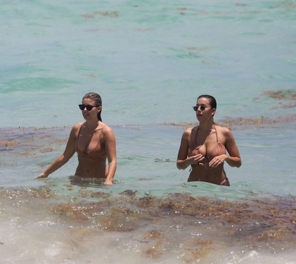 Hot modelle prosperose Natasha Oakley e Devin Brugman si godono una giornata in bikini color nudo sulla spiaggia di Miami, 04/05/2017.
