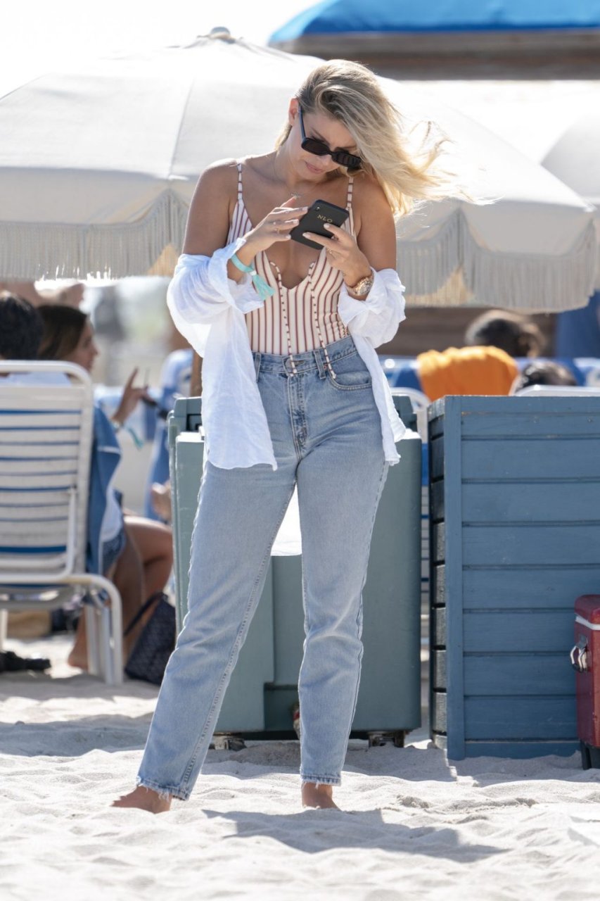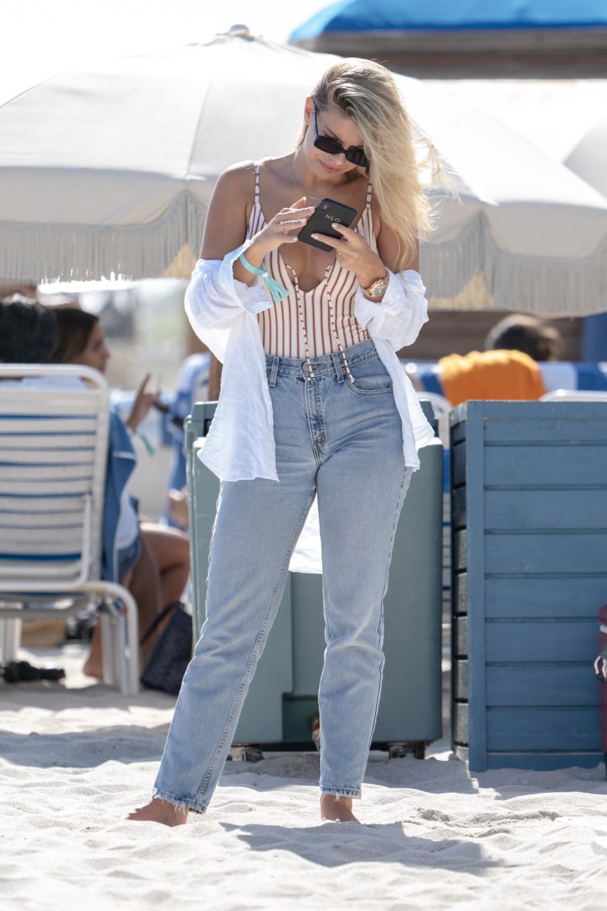 La modella Natasha Oakley (28) mostra il suo décolleté indossando un costume da bagno a righe mentre si gode una giornata in spiaggia a Miami, 12/08/2018.
